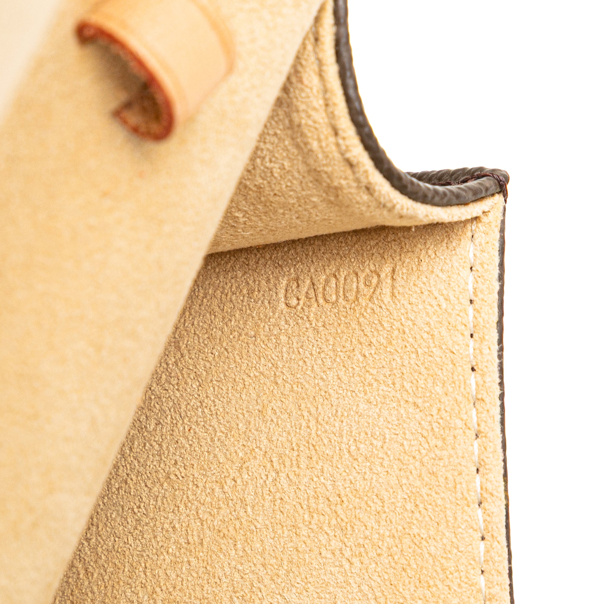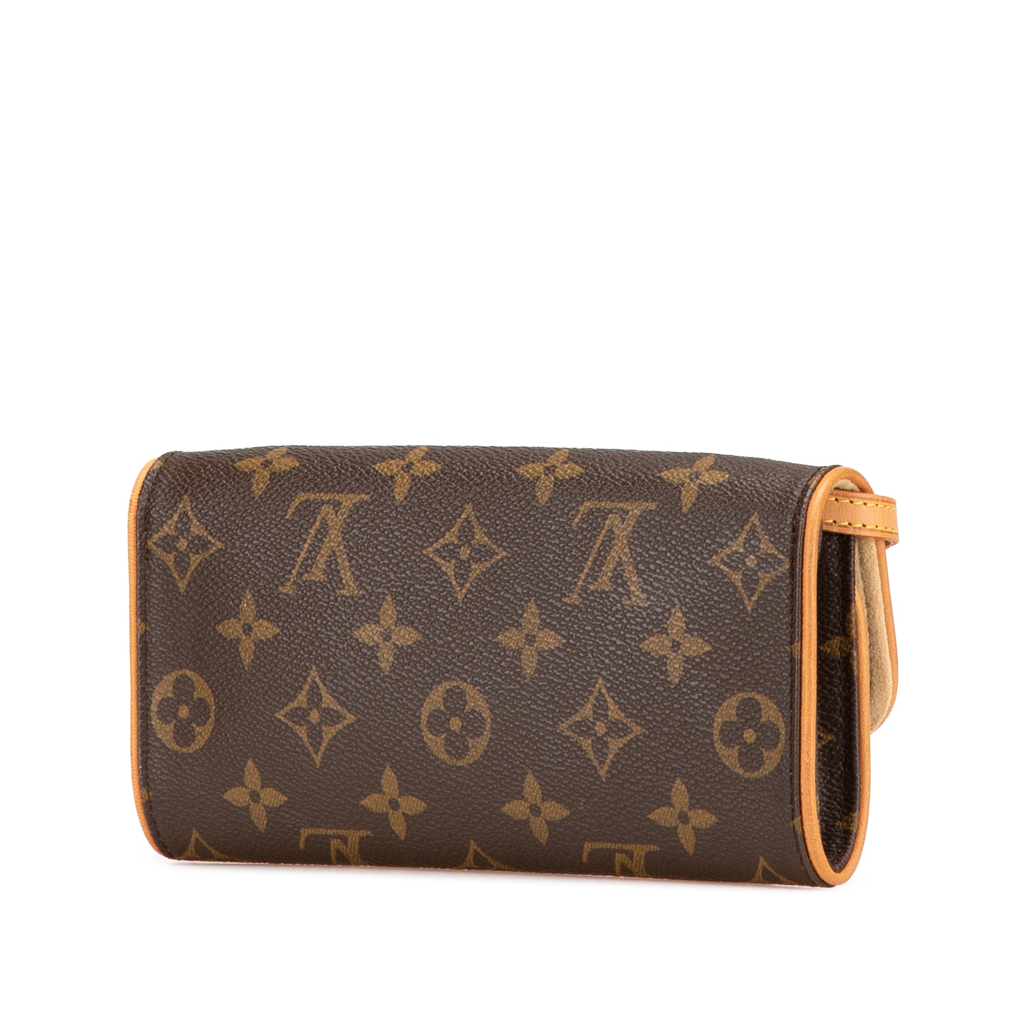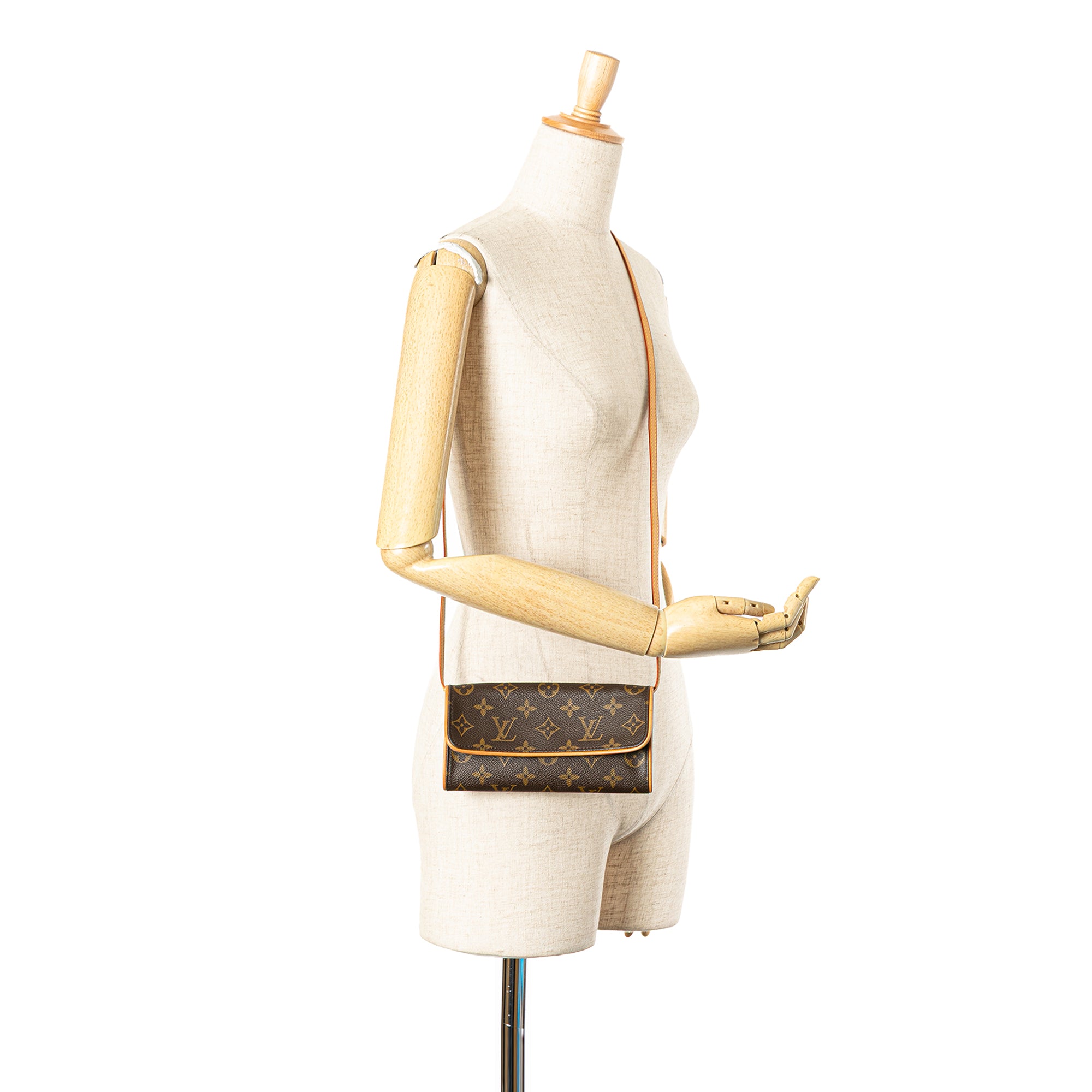 The Pochette Twin PM features a monogram canvas body with vachetta leather trim, a flat vachetta leather shoulder strap, and a front flap with magnetic snap closure. Retail Price: 890.00