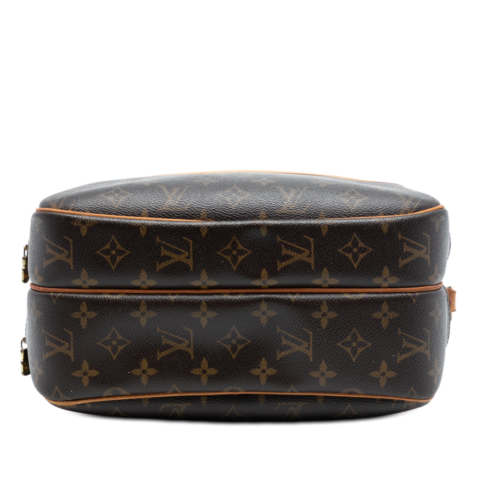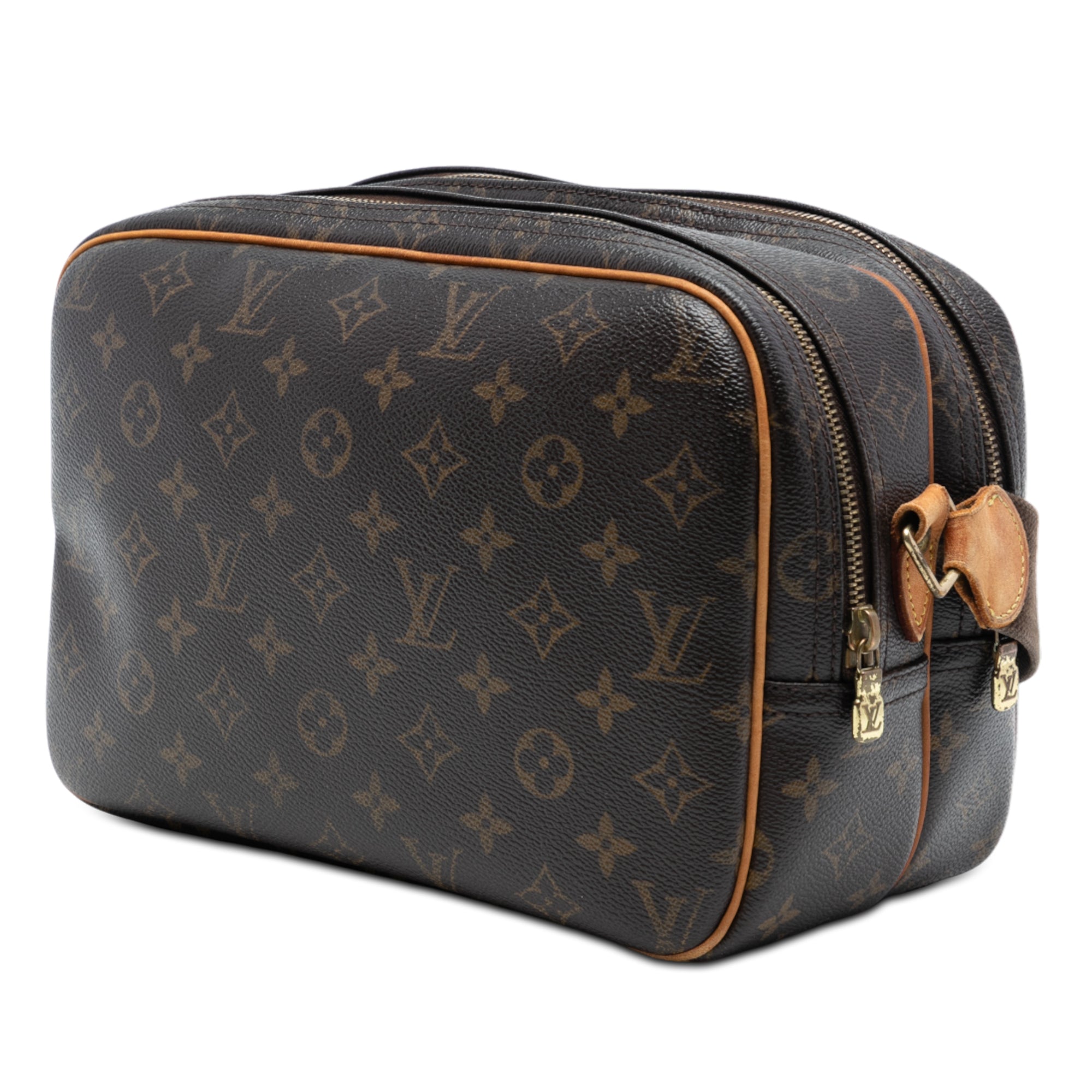 The Reporter PM features a monogram canvas body with vachetta leather trim, an adjustable flat canvas strap, double compartments with top zip closures, an exterior front slip pocket, and interior slip pockets. Retail Price: 1354.00