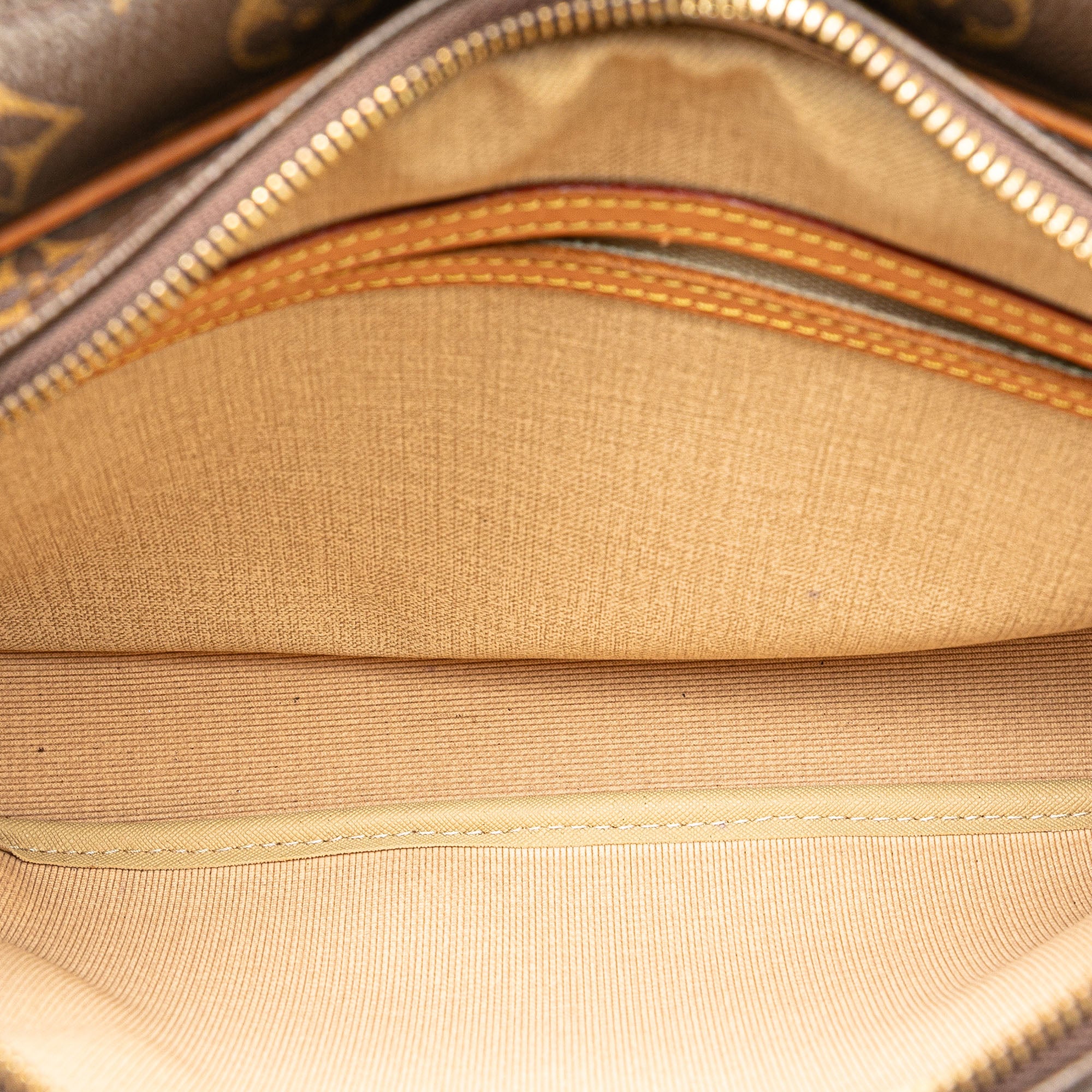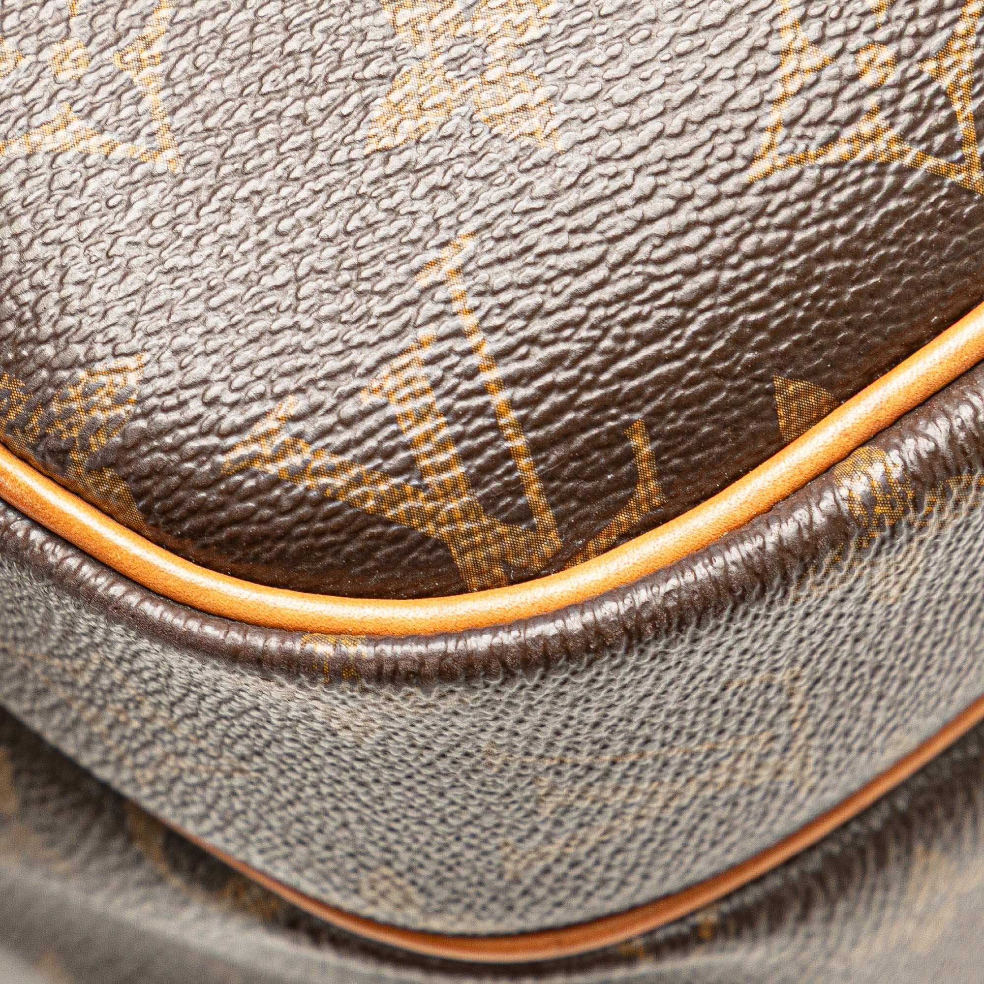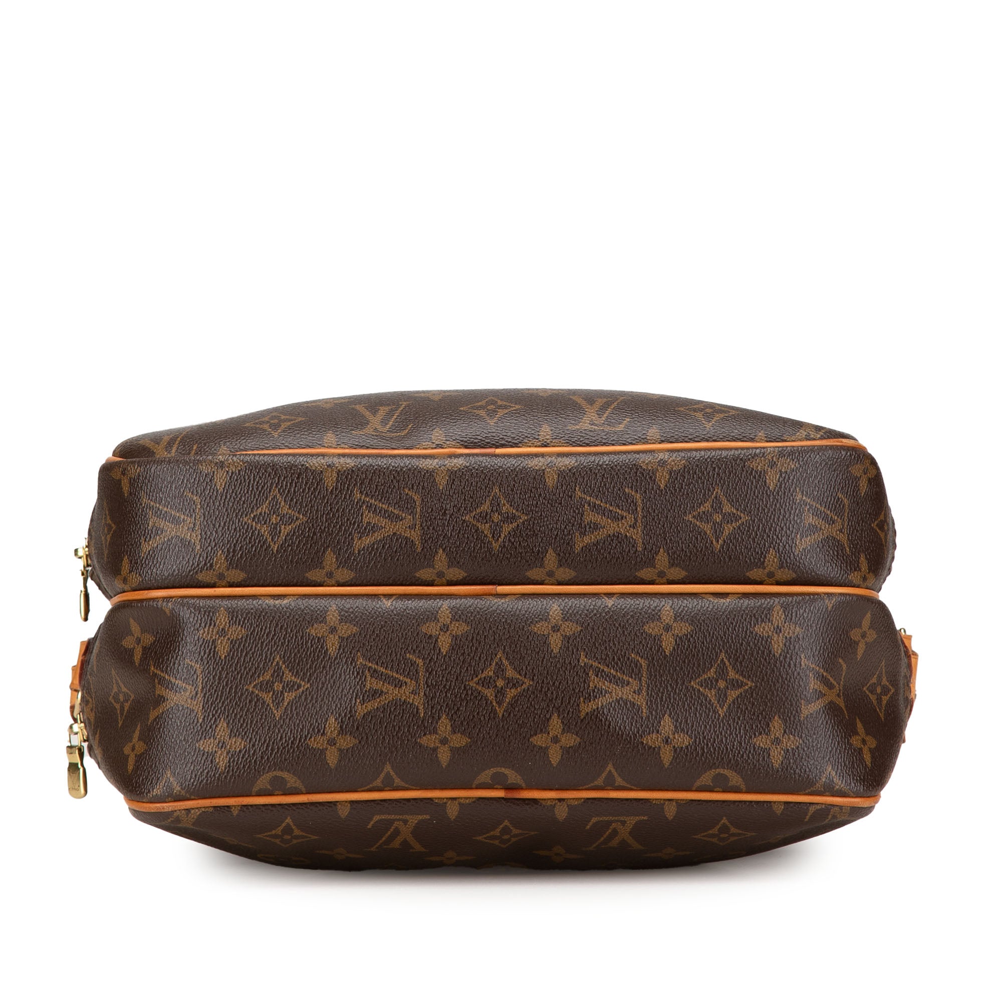 The Reporter PM features a monogram canvas body with leather trim, an adjustable flat strap, double compartments with top zip closures, a front exterior slip pocket, and interior slip pockets. Retail Price: 1354.00