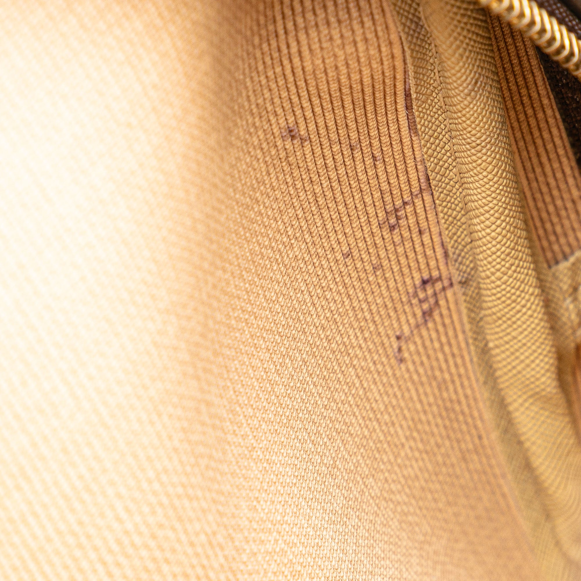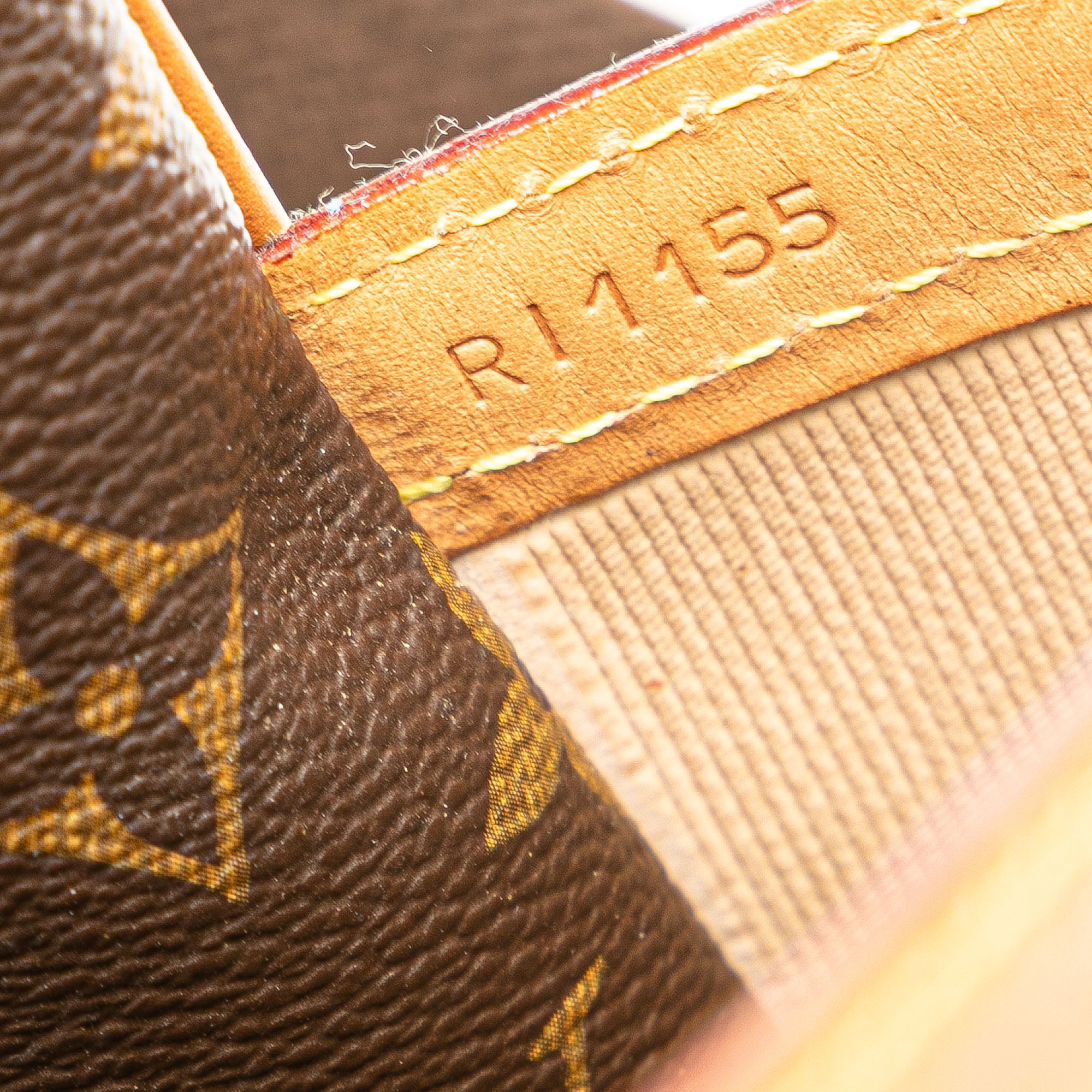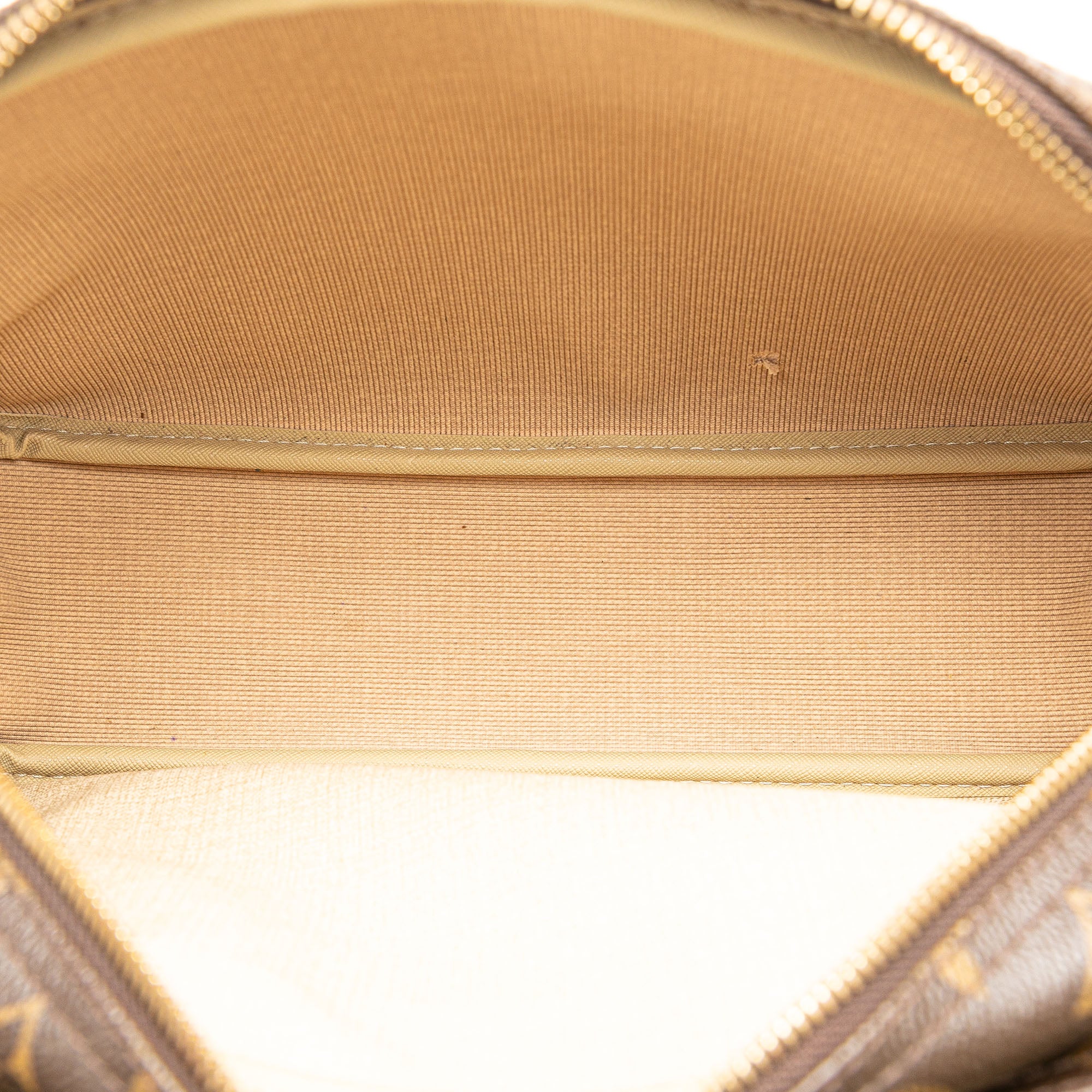 The Reporter PM features a monogram canvas body with leather trim, an adjustable flat strap, double compartments with top zip closures, a front exterior slip pocket, and interior slip pockets. Retail Price: 1354.00