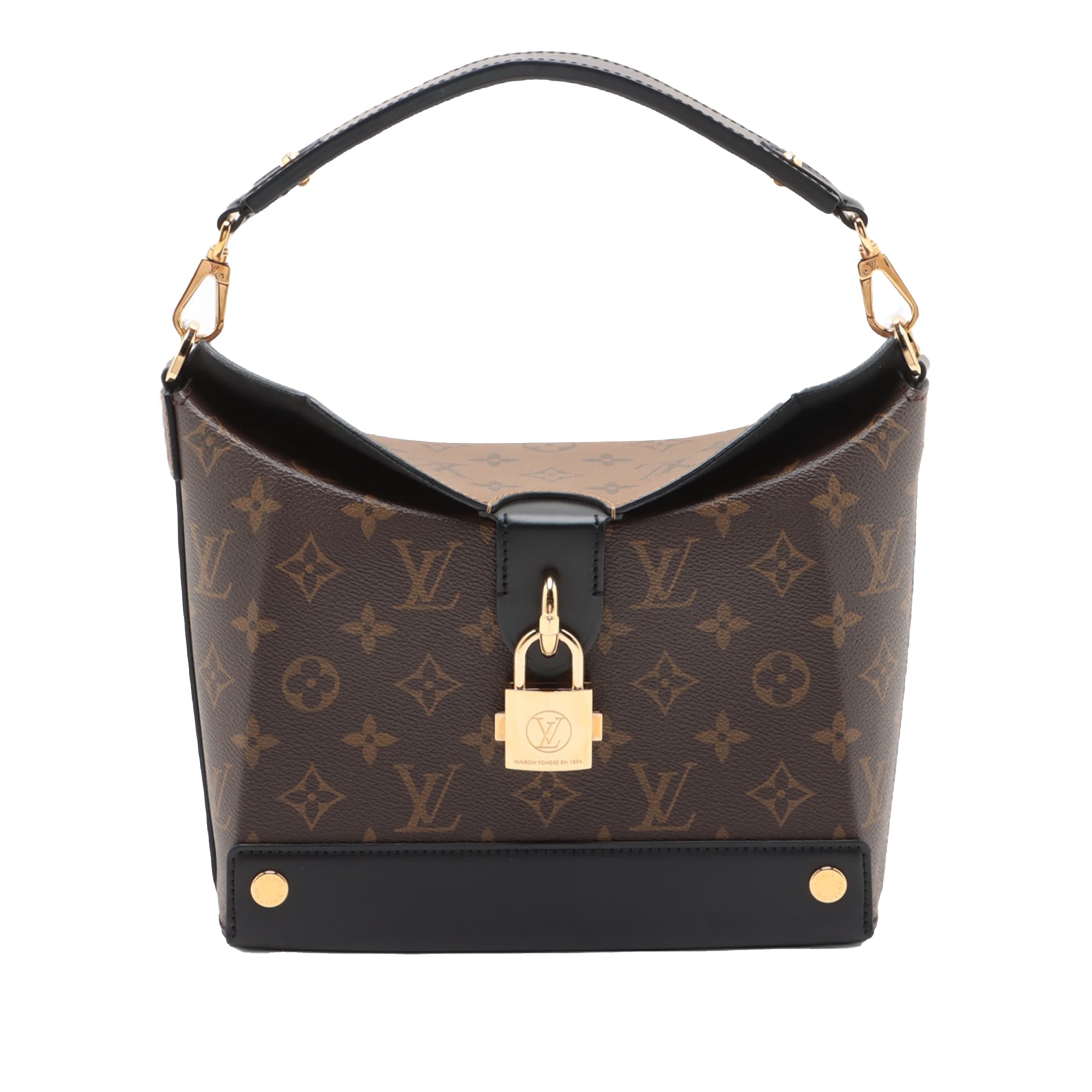 The Bento Box features a monogram reverse canvas body with leather trim, a flat leather handle, a detachable flat leather shoulder strap, a fold-over top with push-lock closure, and an interior slip pocket. Retail Price: 2150.00