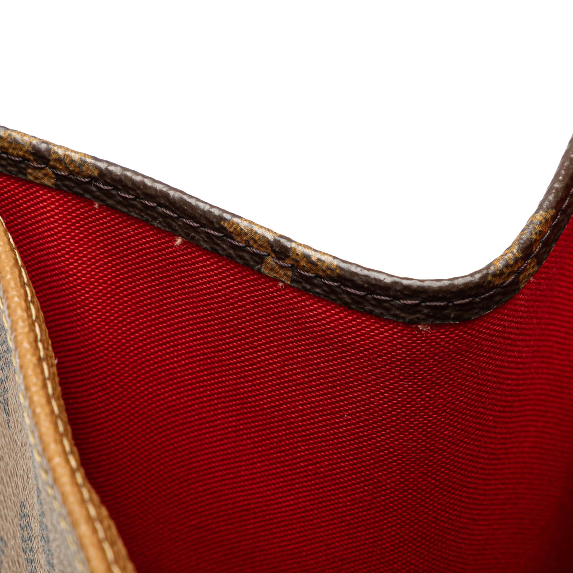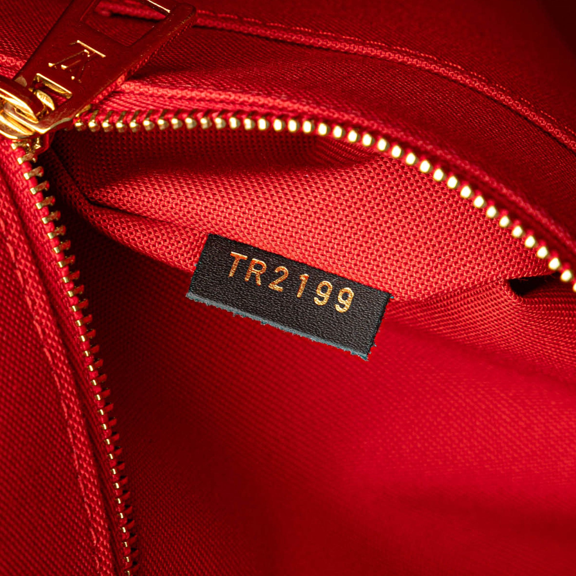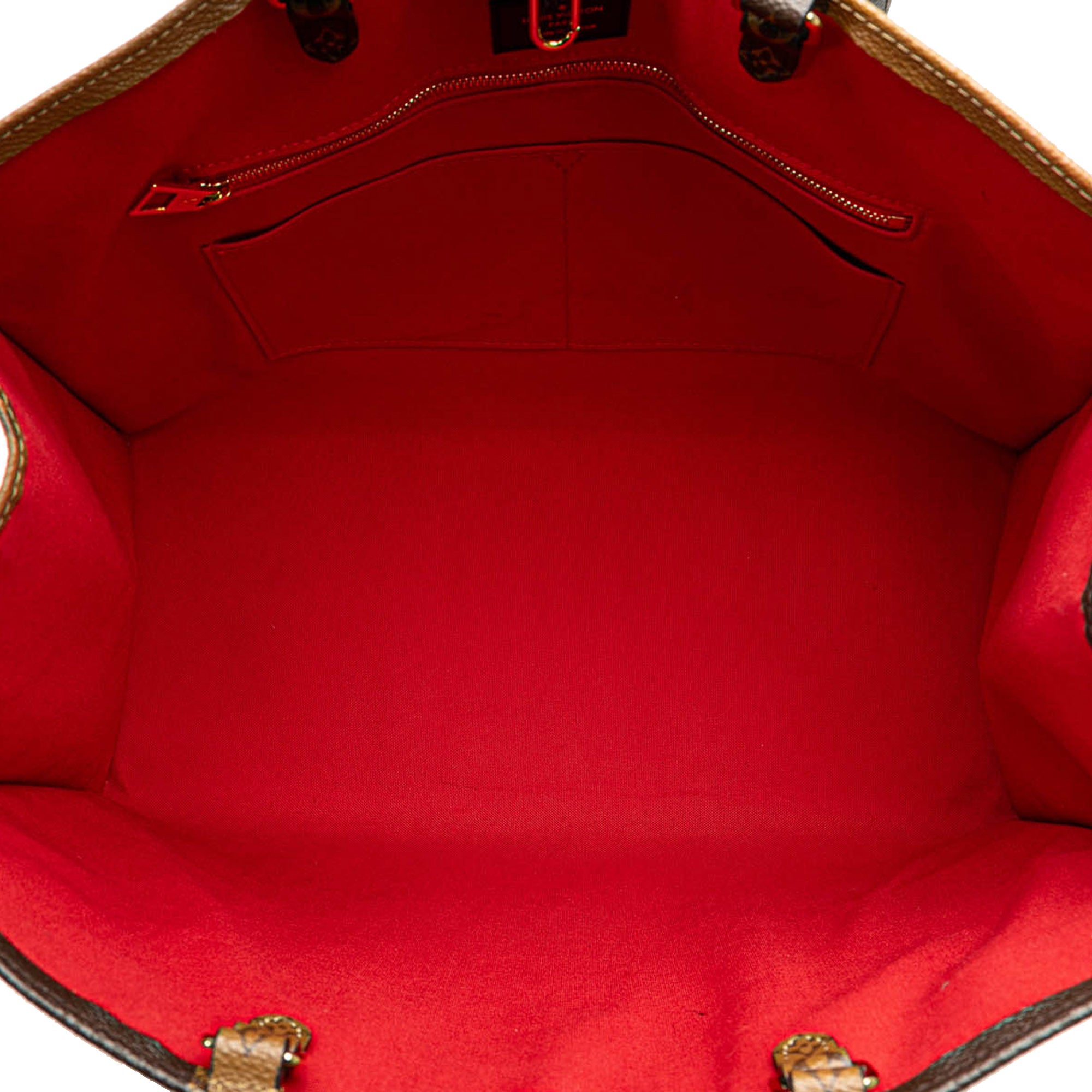 The OnTheGo GM features a monogram canvas body, rolled handles, flat shoulder straps, an open top with hook closure, and interior zip and slip pockets. Retail Price: 3100.00