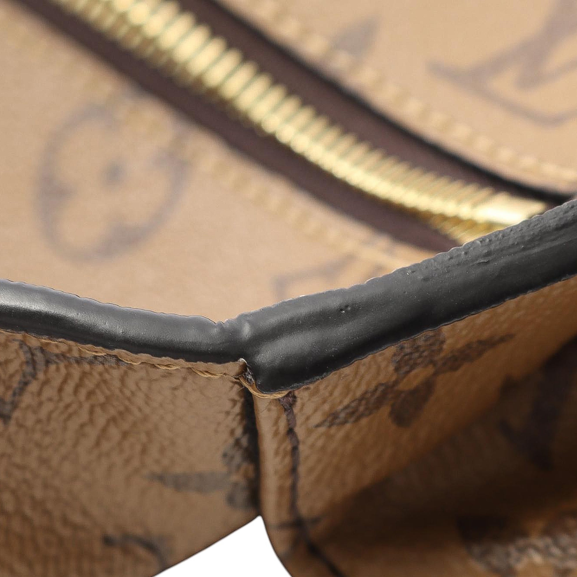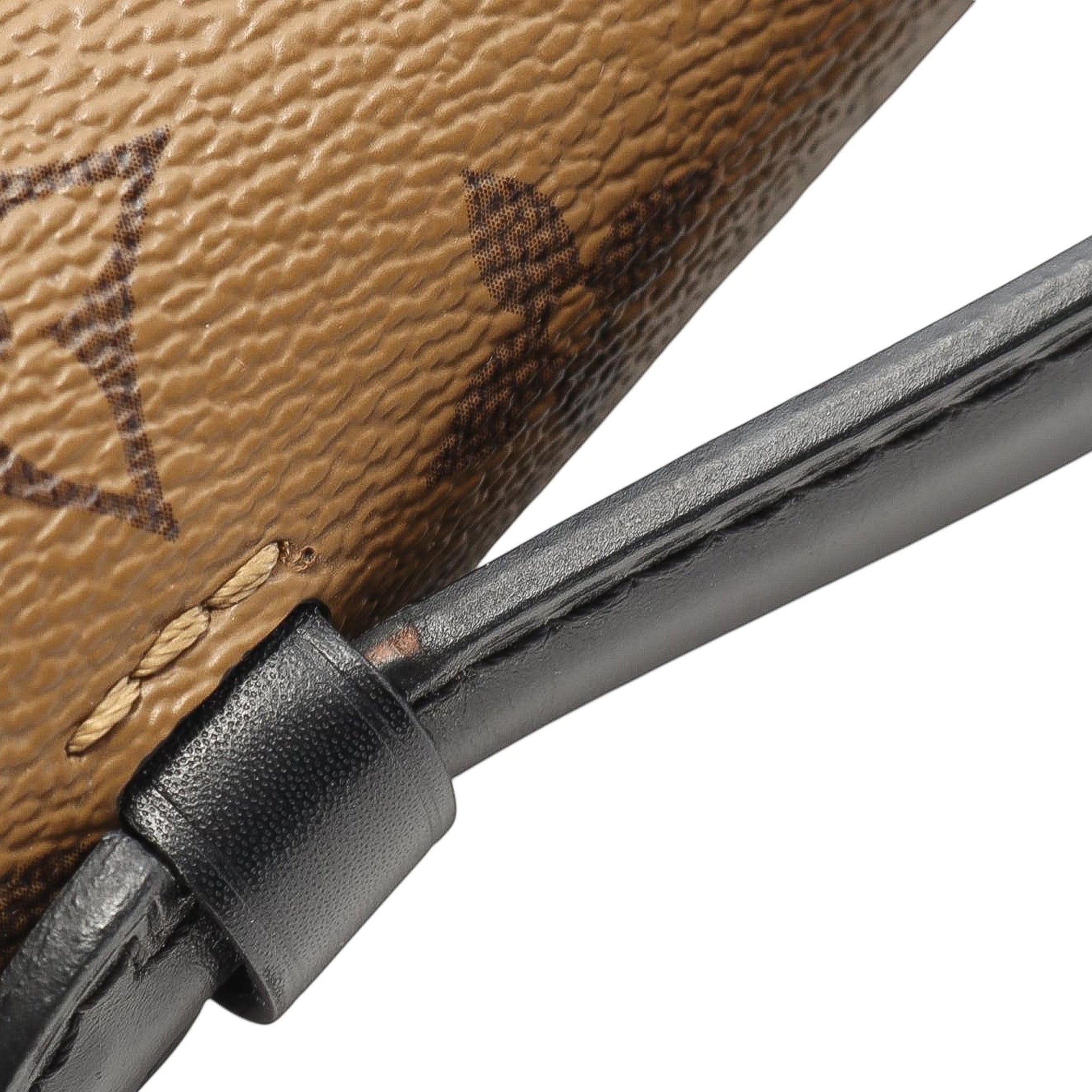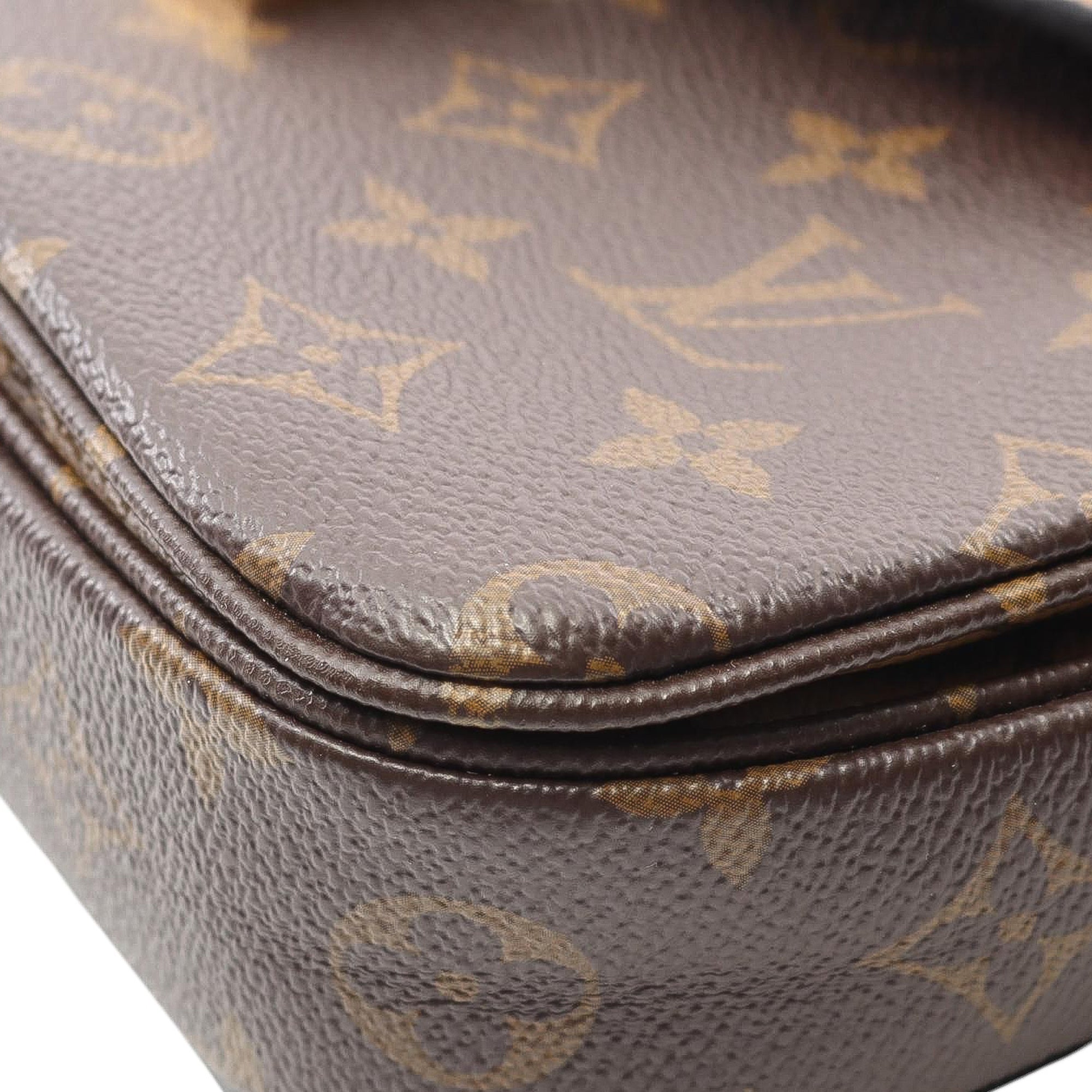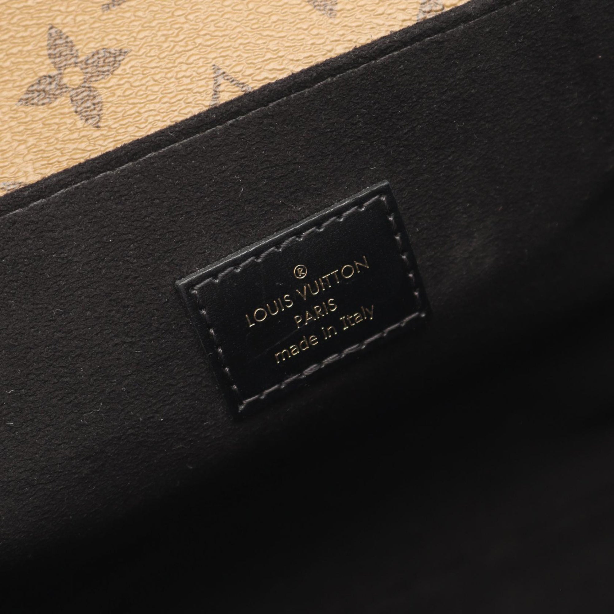 The Pochette Metis features a monogram reverse canvas and monogram canvas body, a flat leather top handle, a detachable flat shoulder strap, a front flap with an S-lock closure, an exterior zip pocket, and an interior slip pocket. Retail Price: 2620.00