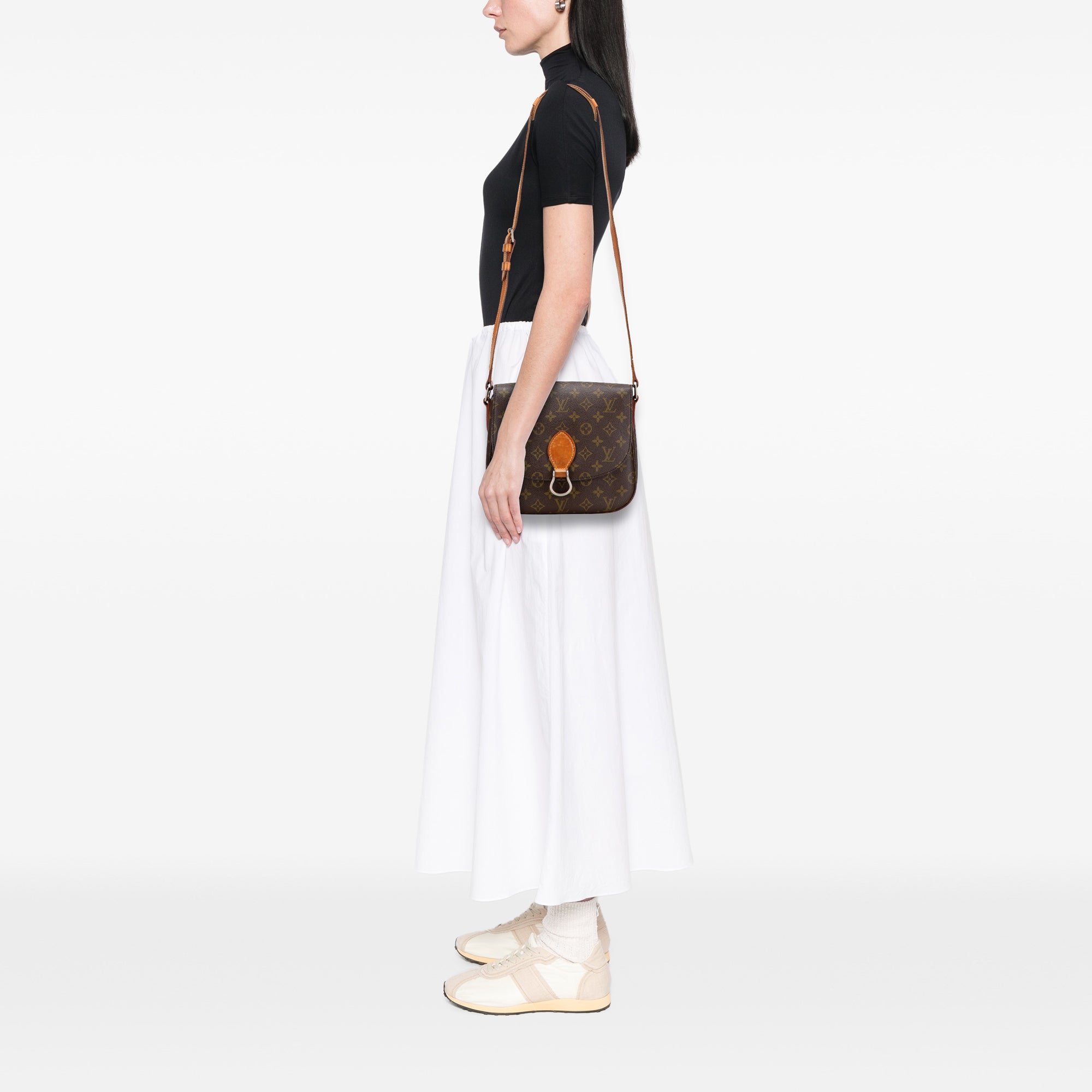 The Saint Cloud features a monogram canvas body, a flat vachetta leather strap, a front flap with a magnetic closure, an exterior slip pocket, and an interior zip pocket. Retail Price: 1250.00