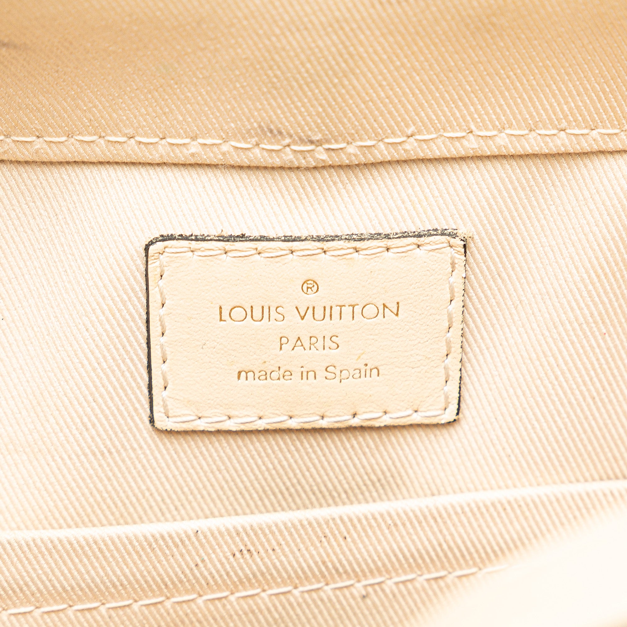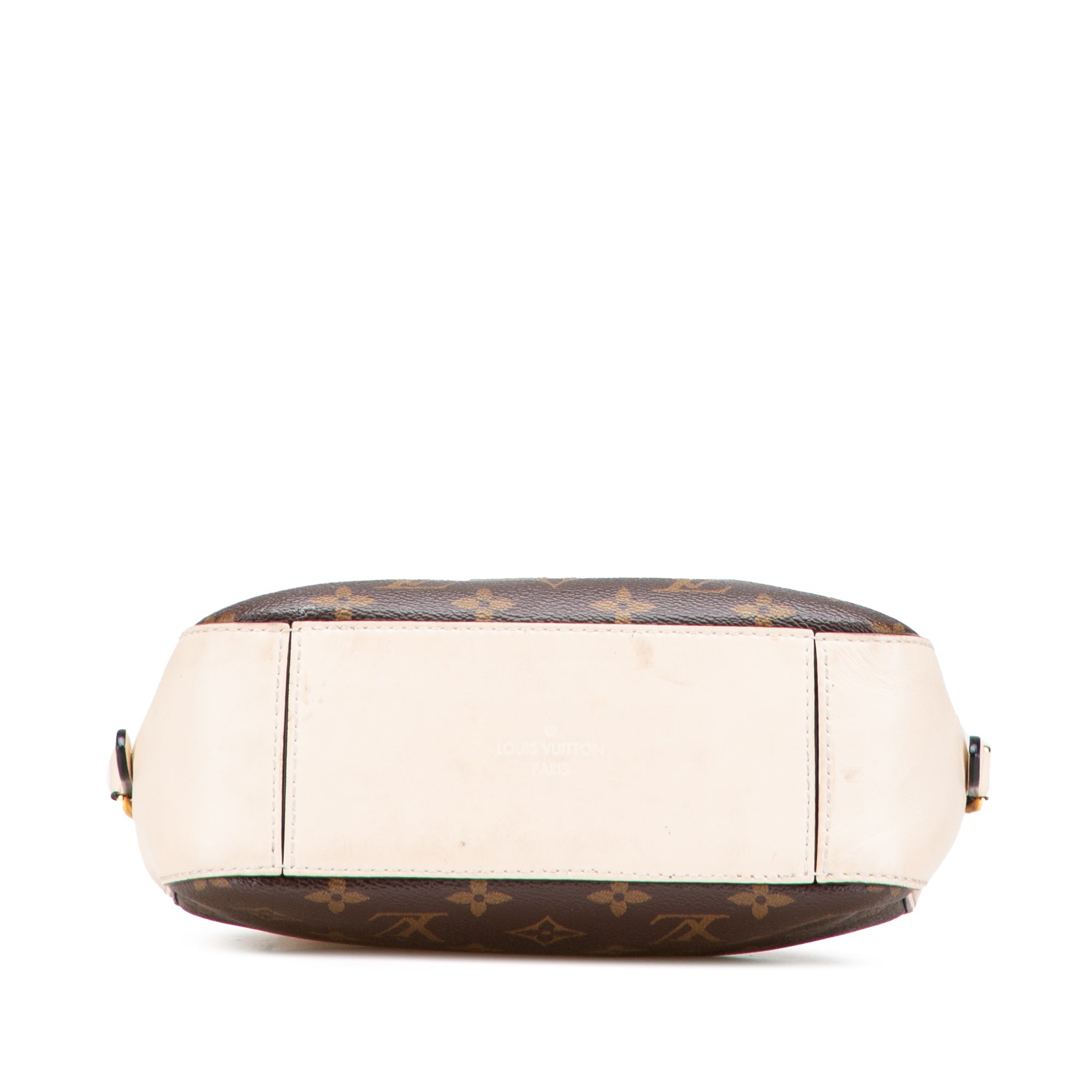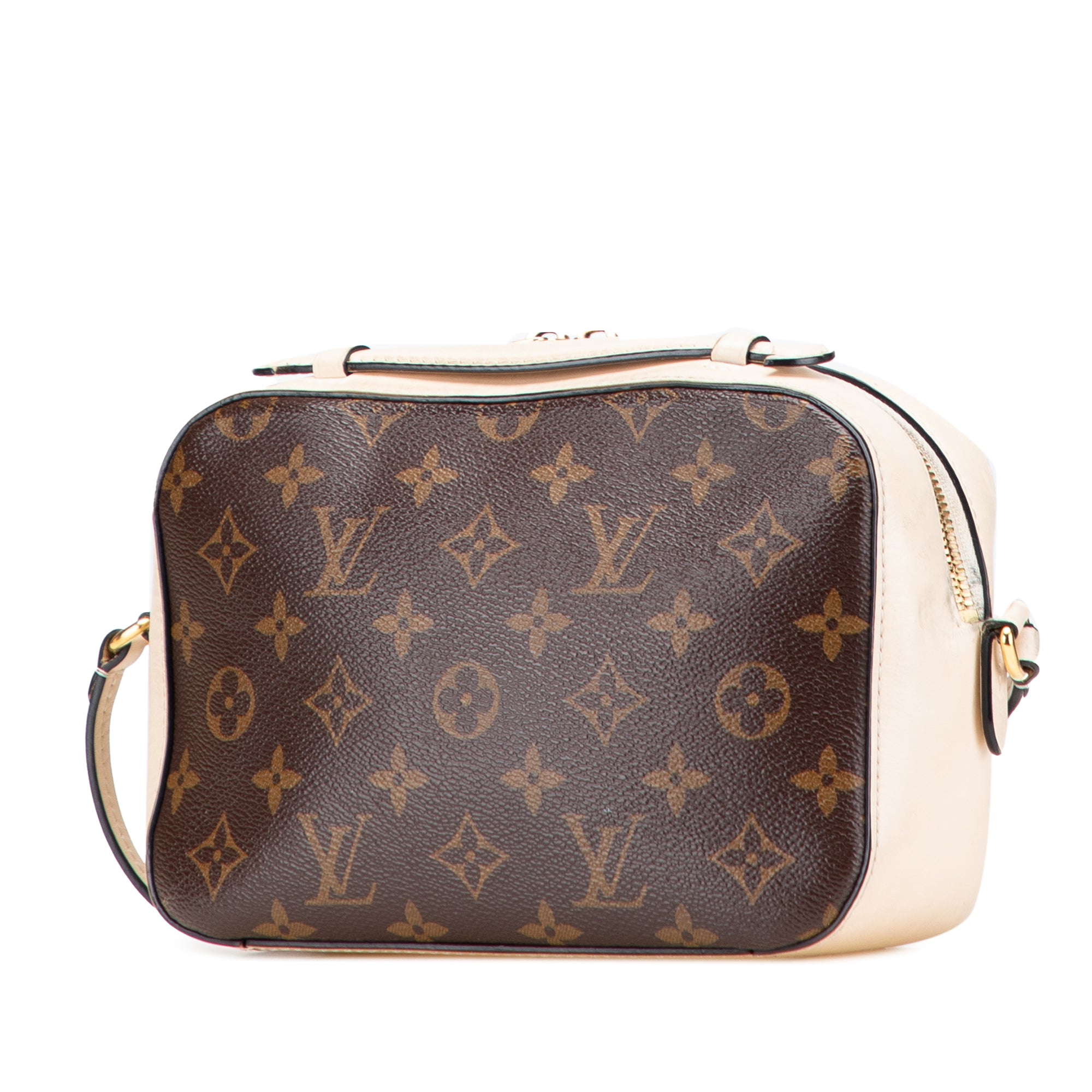 The Saintonge features a monogram canvas with leather trim, a flat top handle, a flat leather strap, a top zip closure, and an interior slip pocket. Retail Price: 1635.00