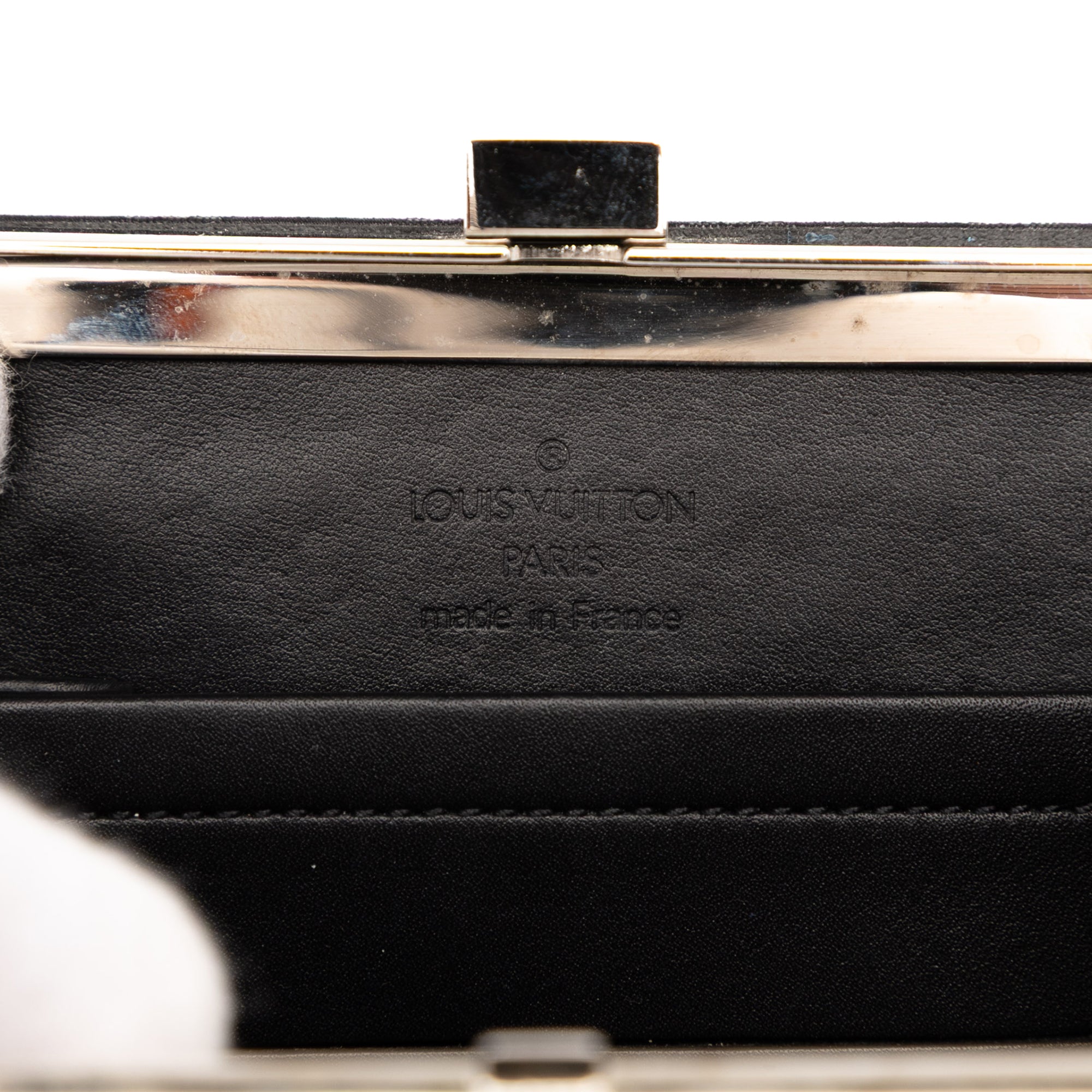 The Ange PM features a monogram satin body, mesh metal handle, a frame with top clasp closure, and interior slip pockets. Retail Price: 1200.00