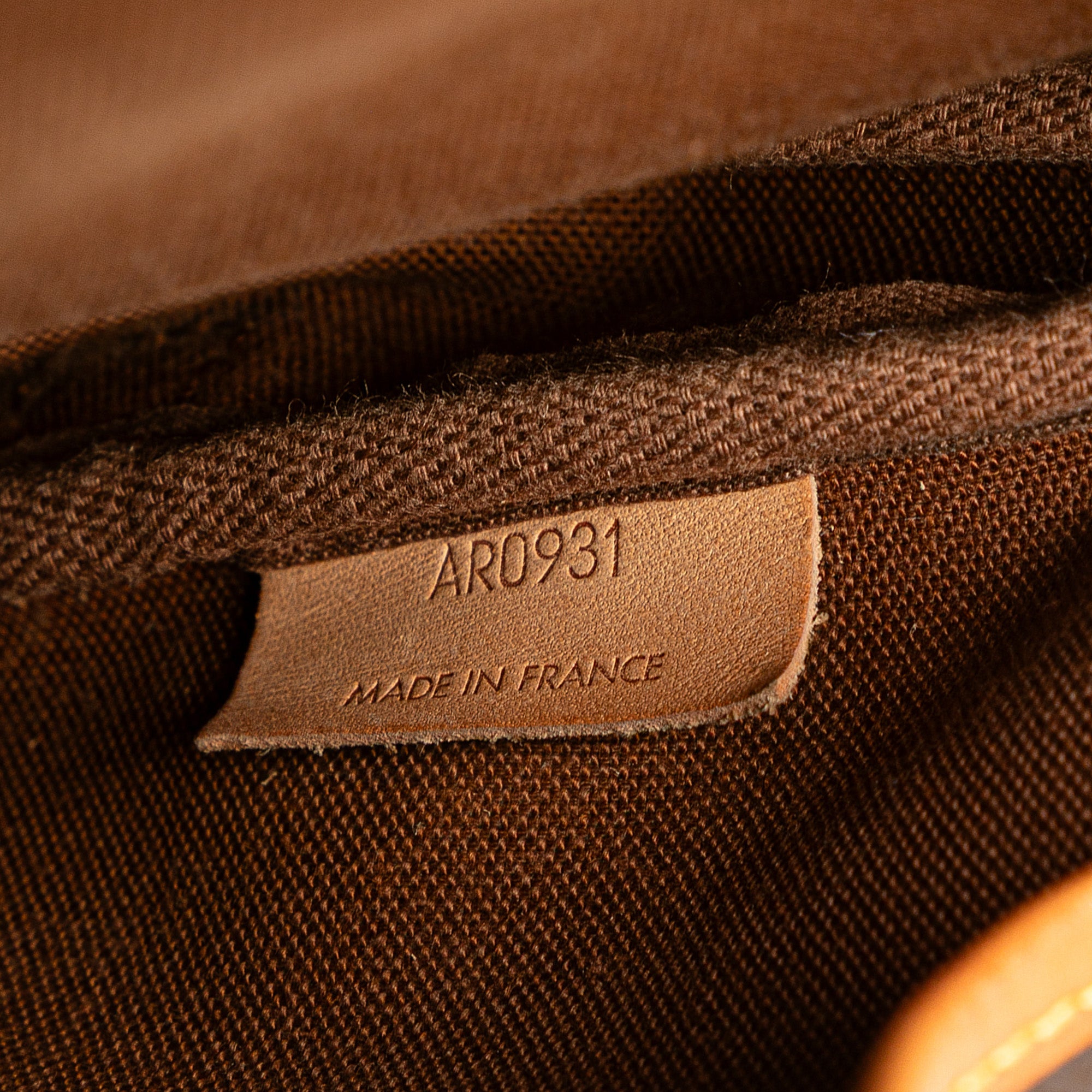 The Saumur 25 features a monogram canvas body with vahetta leather trim, an adjustable flat vachetta leather shoulder strap, double open compartments with front flaps and belt buckle closures. Retail Price: 1350.00