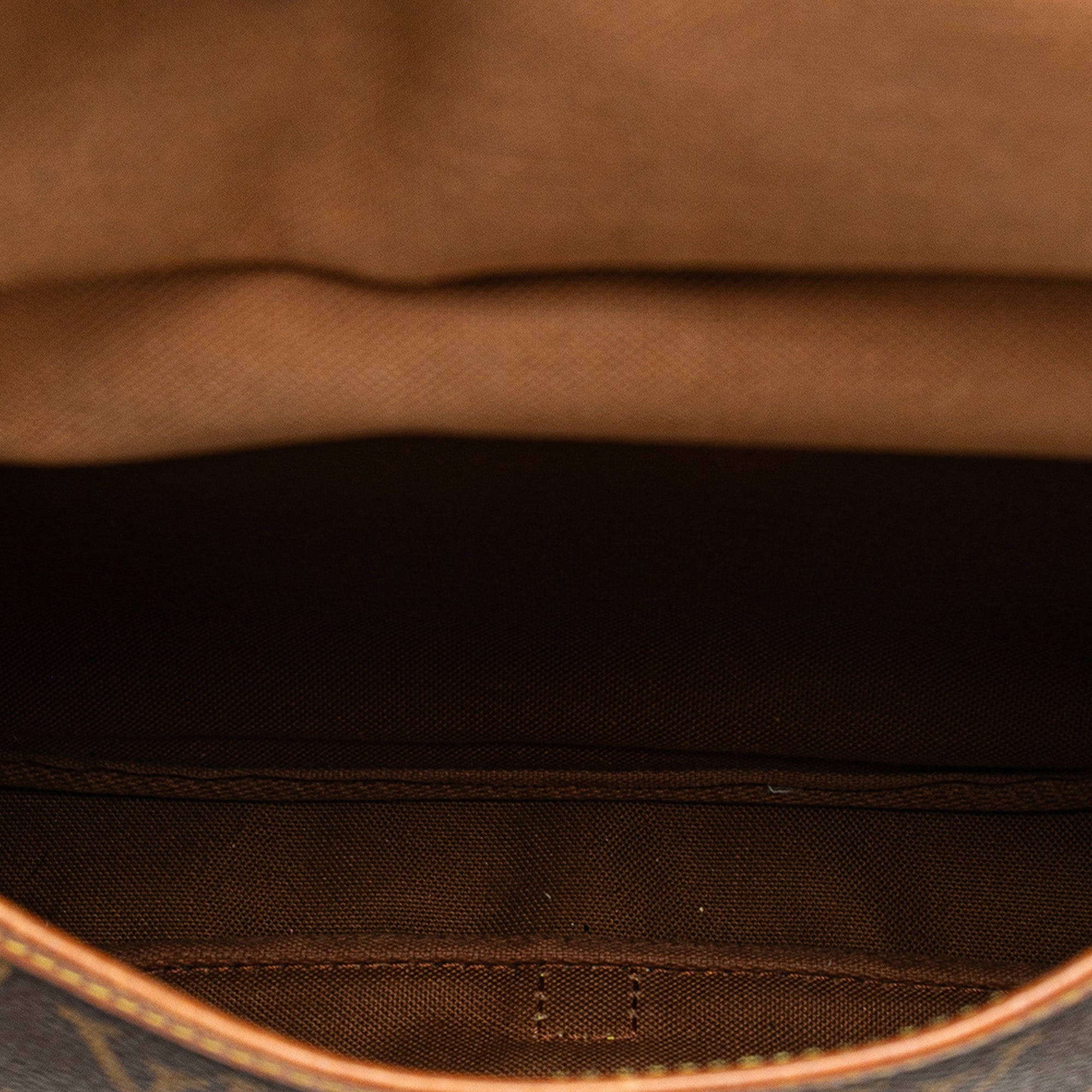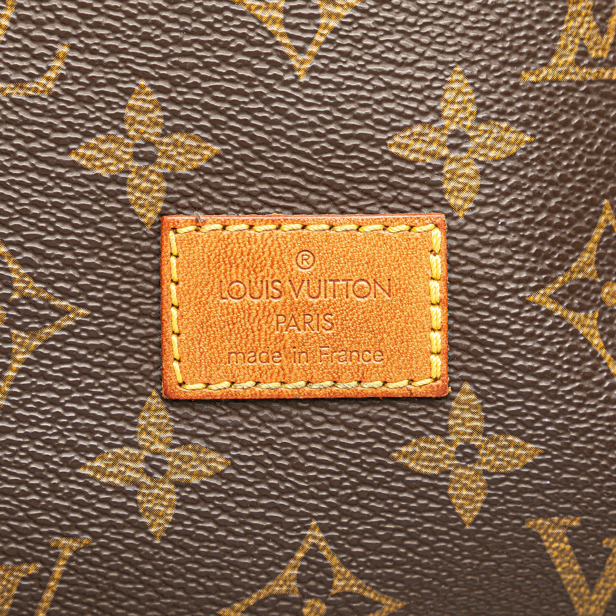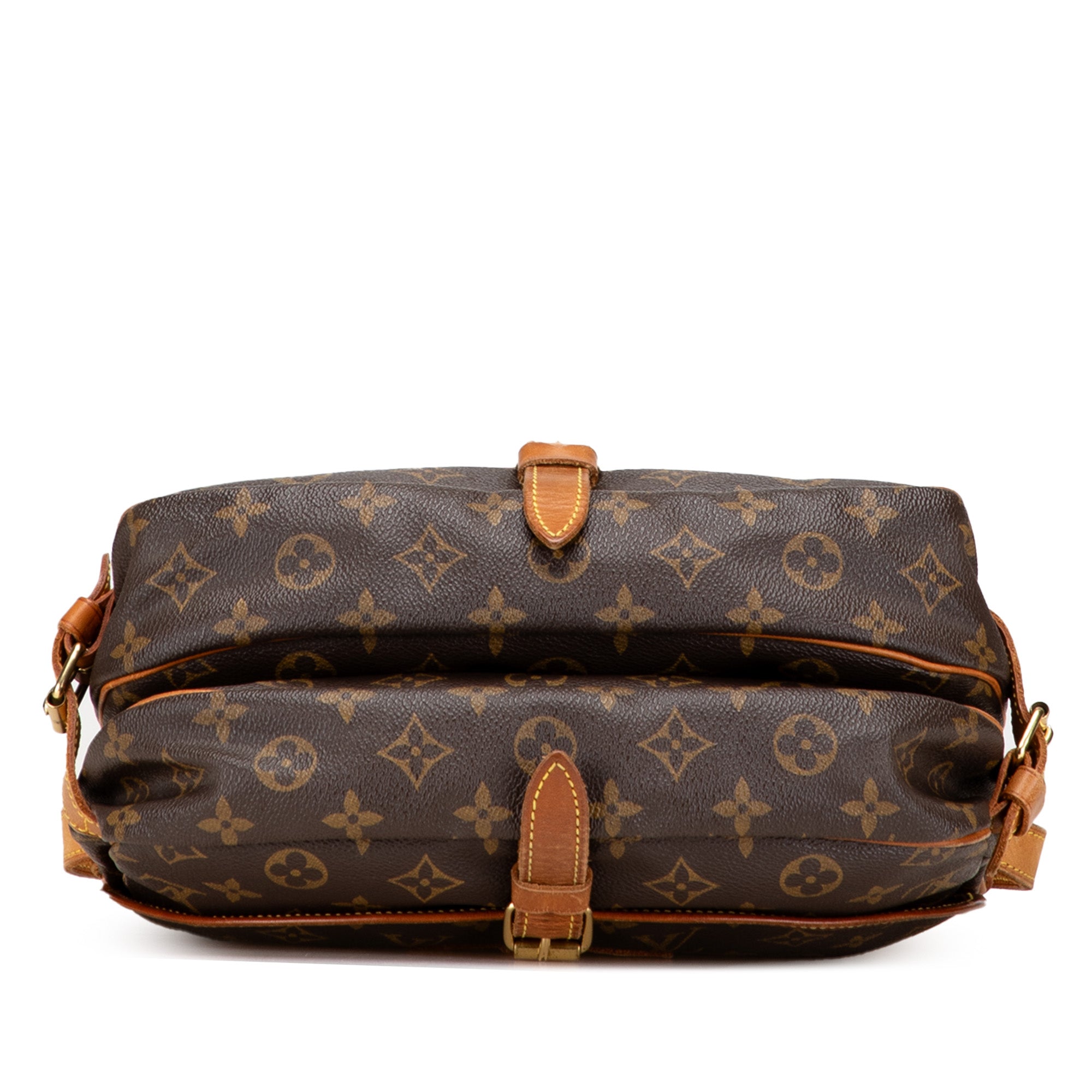 The Saumur 30 features a monogram canvas body with vachetta leather trim, an adjustable flat leather shoulder strap, double open compartments with front flaps and belt buckle closures, and an interior slip pocket. Retail Price: 1285.00