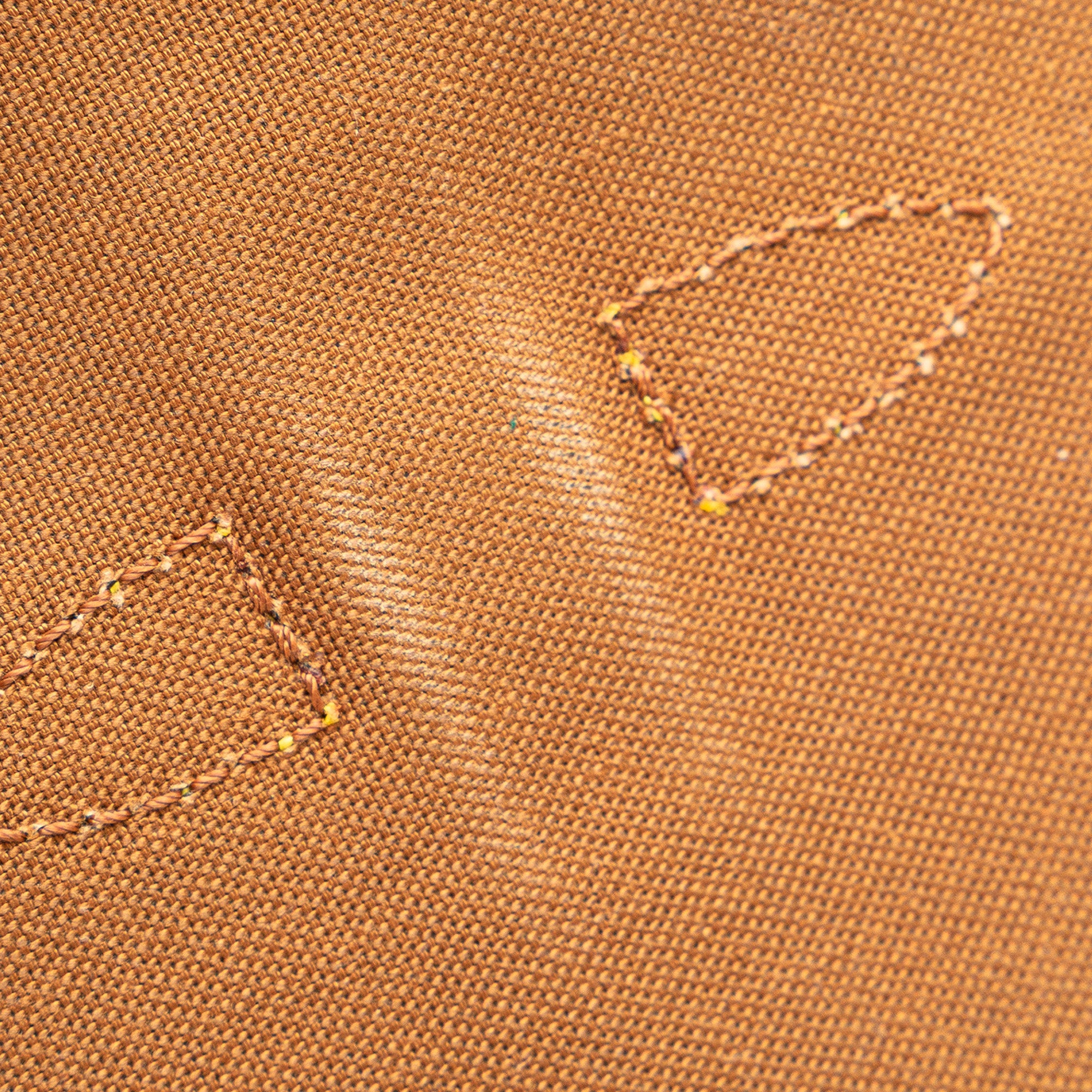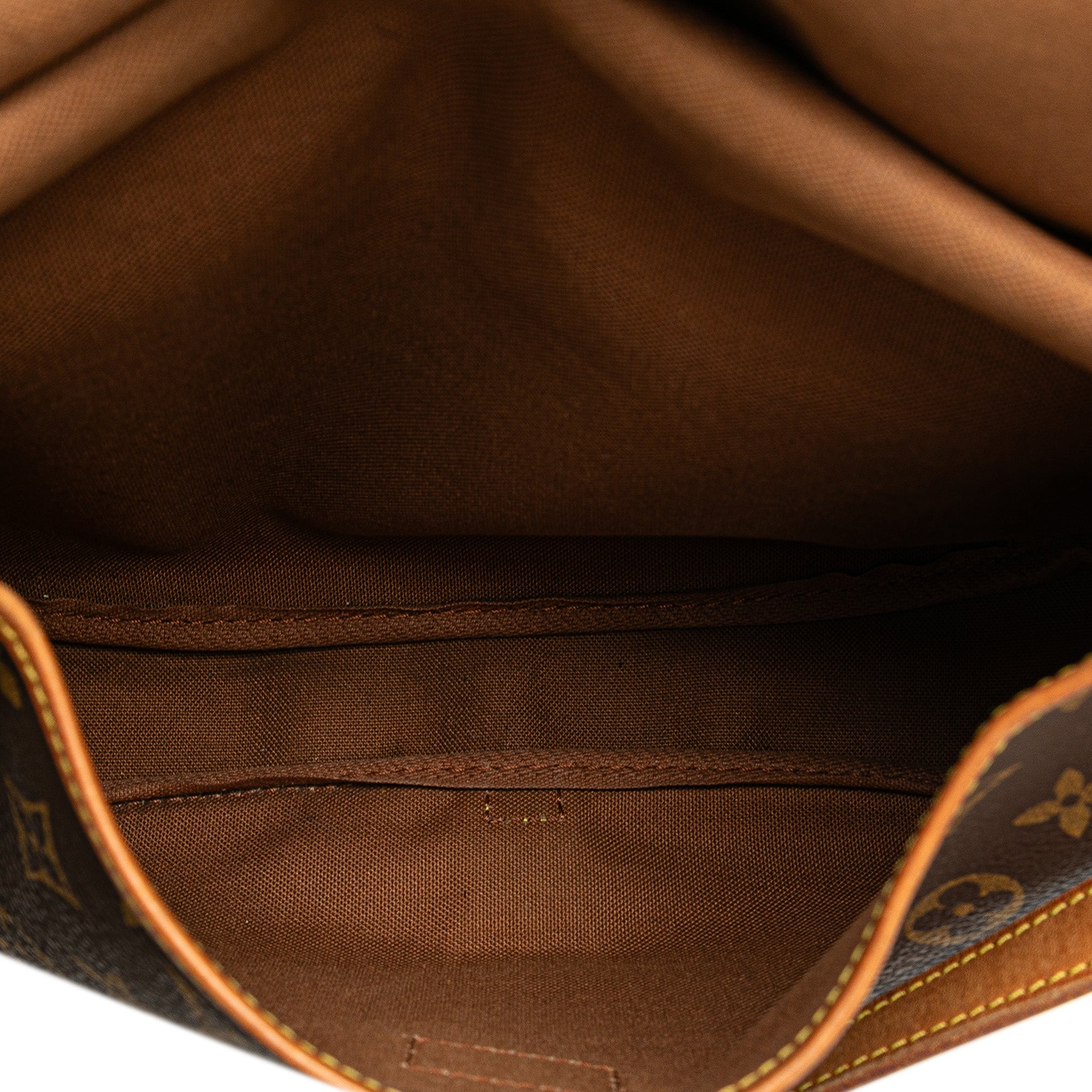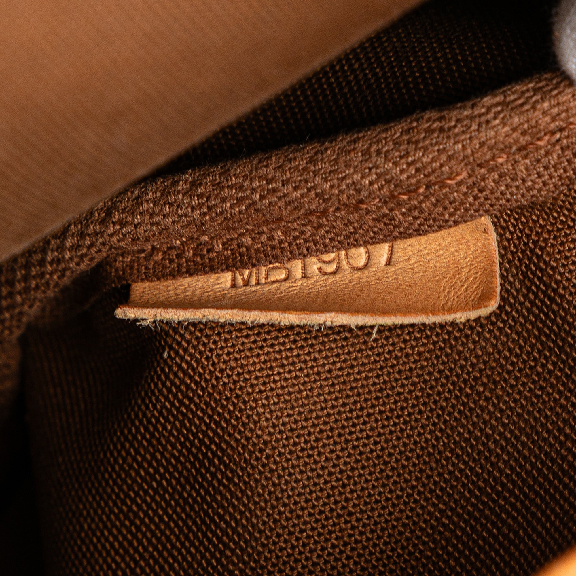 The Saumur 30 features a monogram canvas body with vachetta leather trim, an adjustable flat leather shoulder strap, double open compartments with front flaps and belt buckle closures, and an interior slip pocket. Retail Price: 1285.00