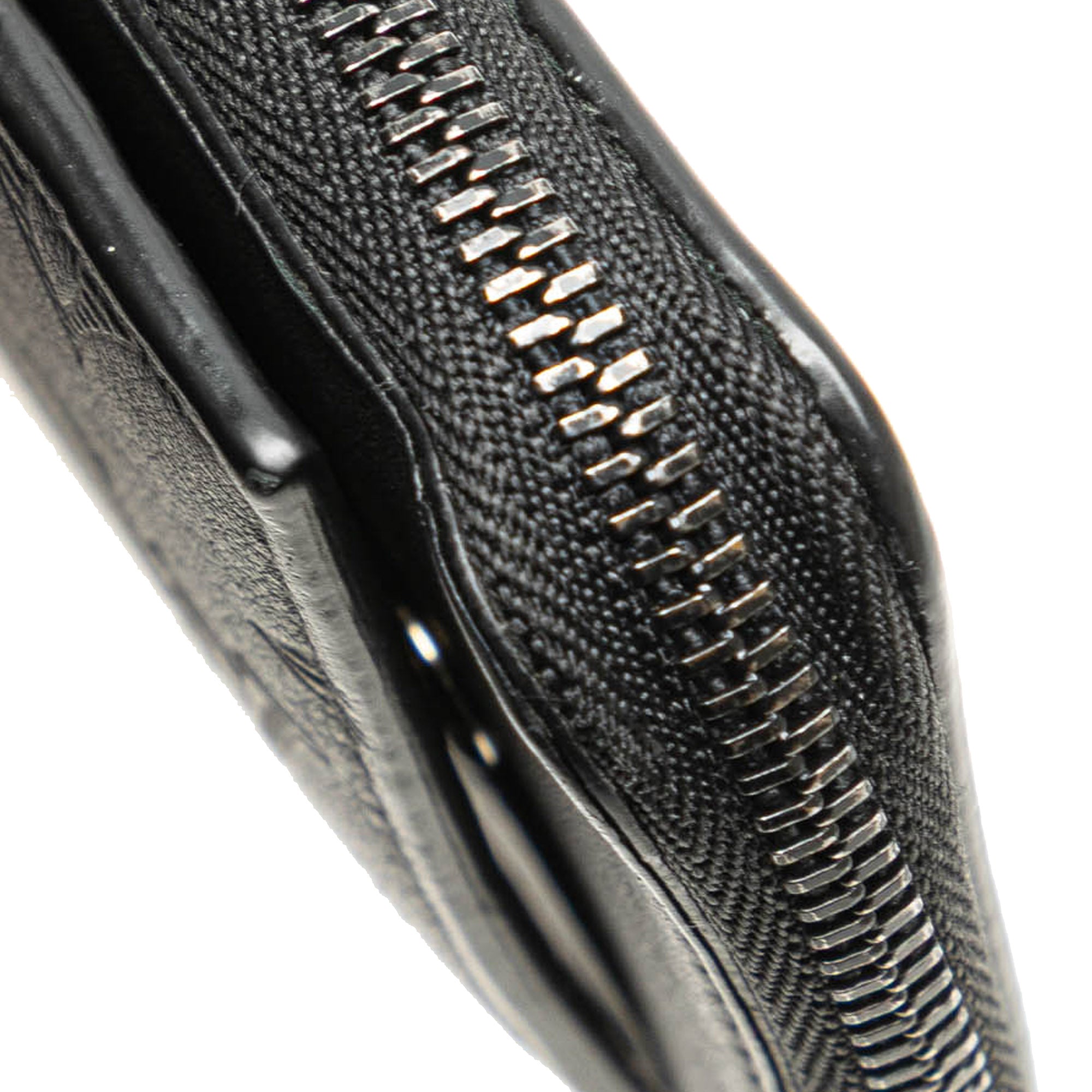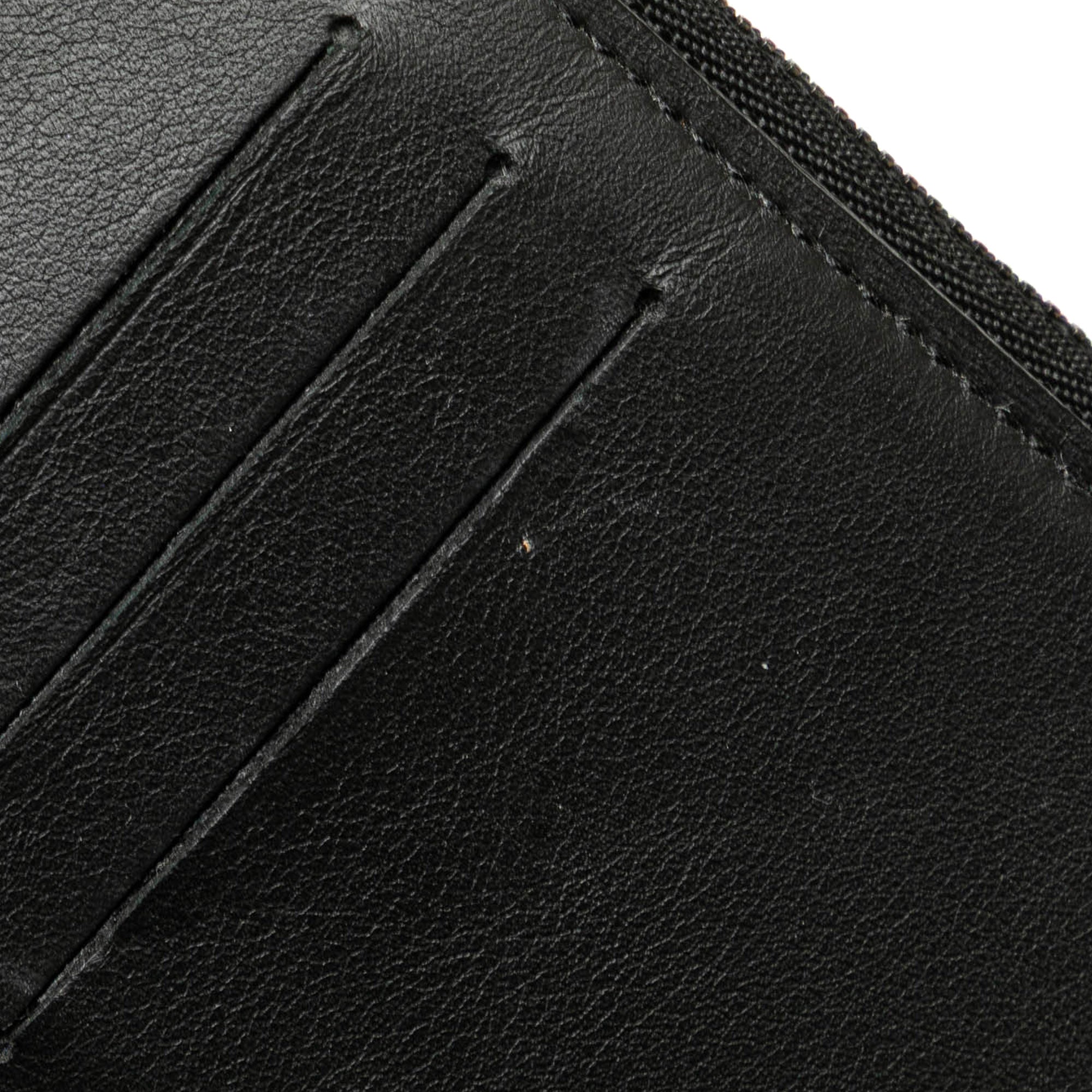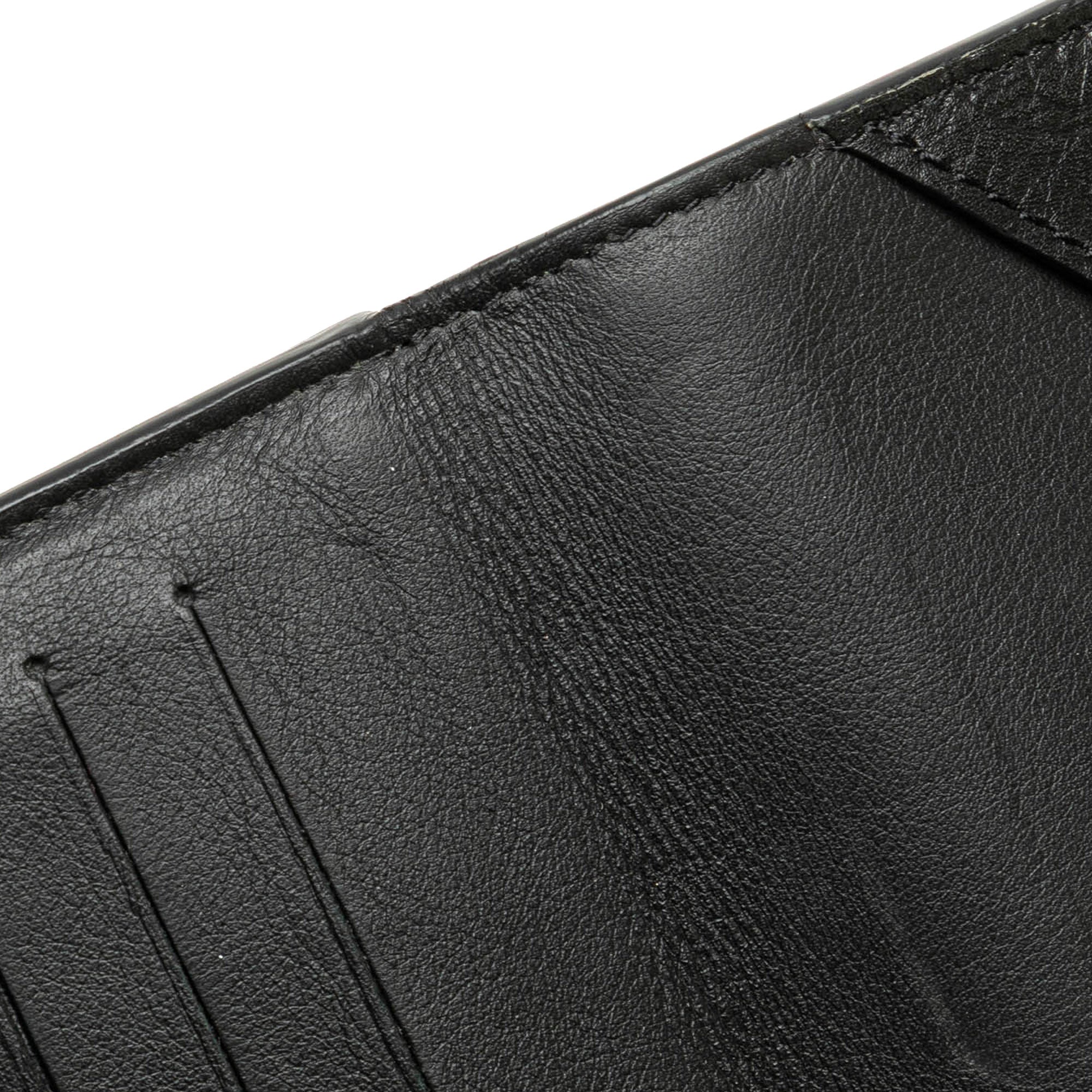 This wallet features a leather body, a front flap with a snap button closure, a top zip closure, exterior back card slots, and interior slip pockets. Retail Price: 720.00