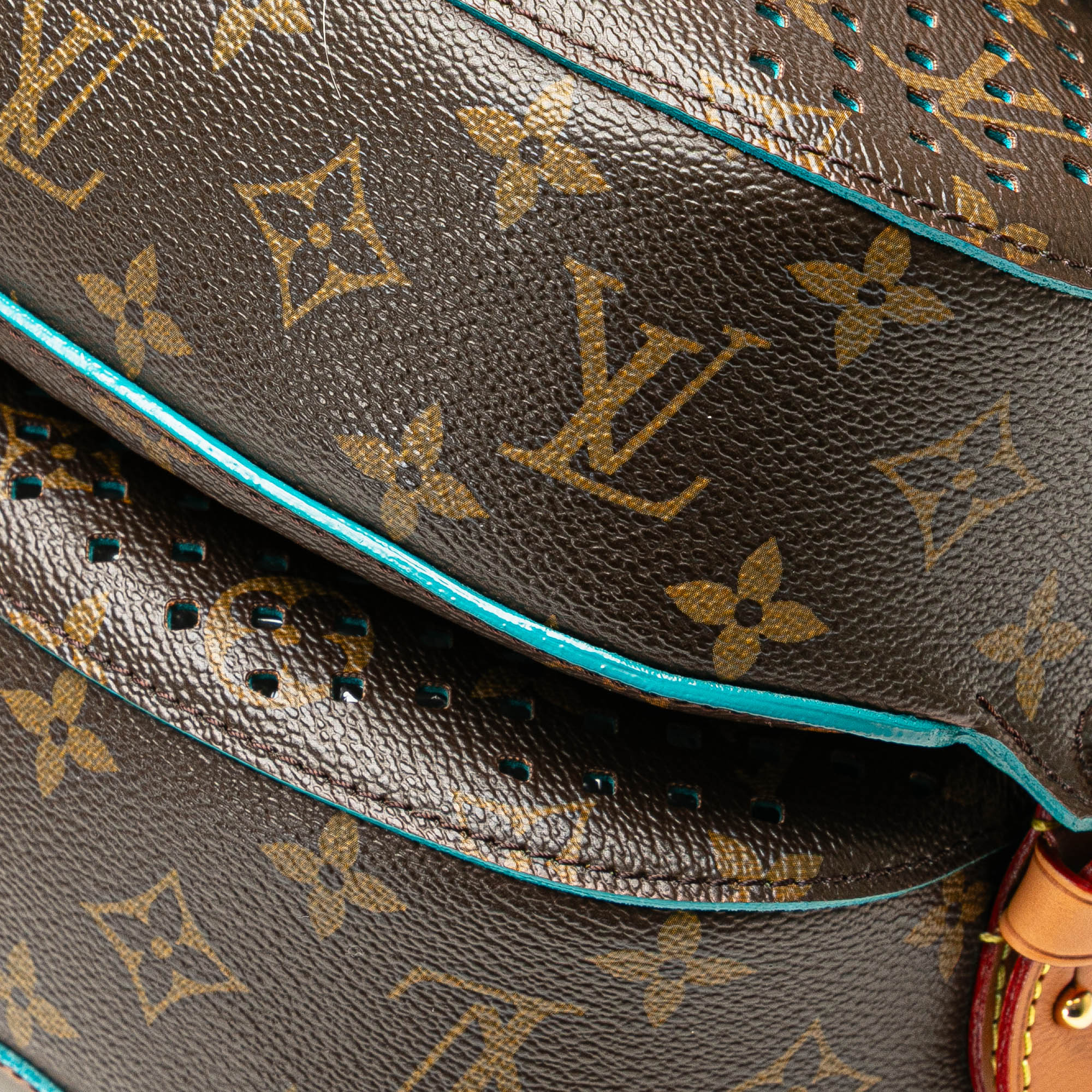 The Flore Saumur 30 features a perforated monogram canvas body, an adjustable flat leather shoulder strap, and front and back flaps with belt buckle closures. Inclusion: Dust bag. Retail Price: 2495.00
