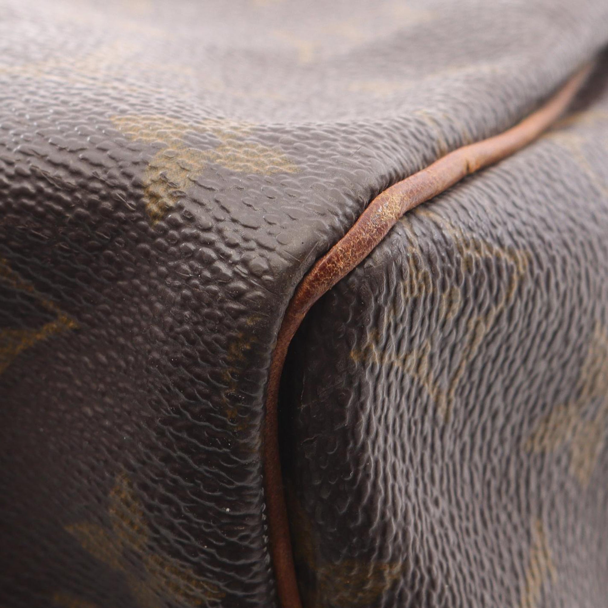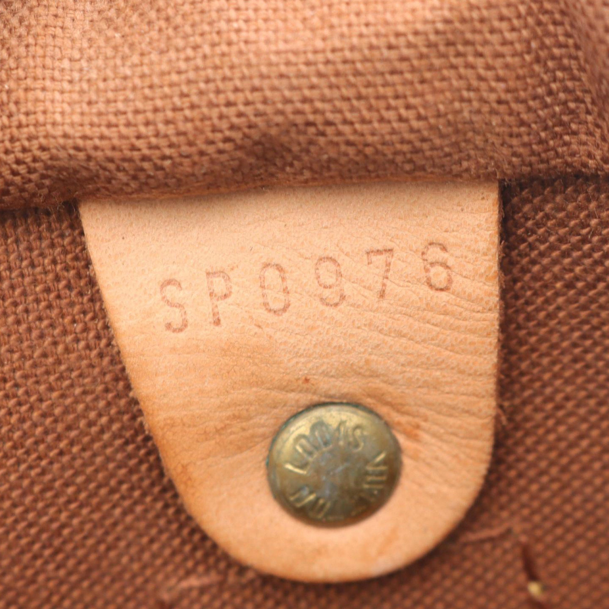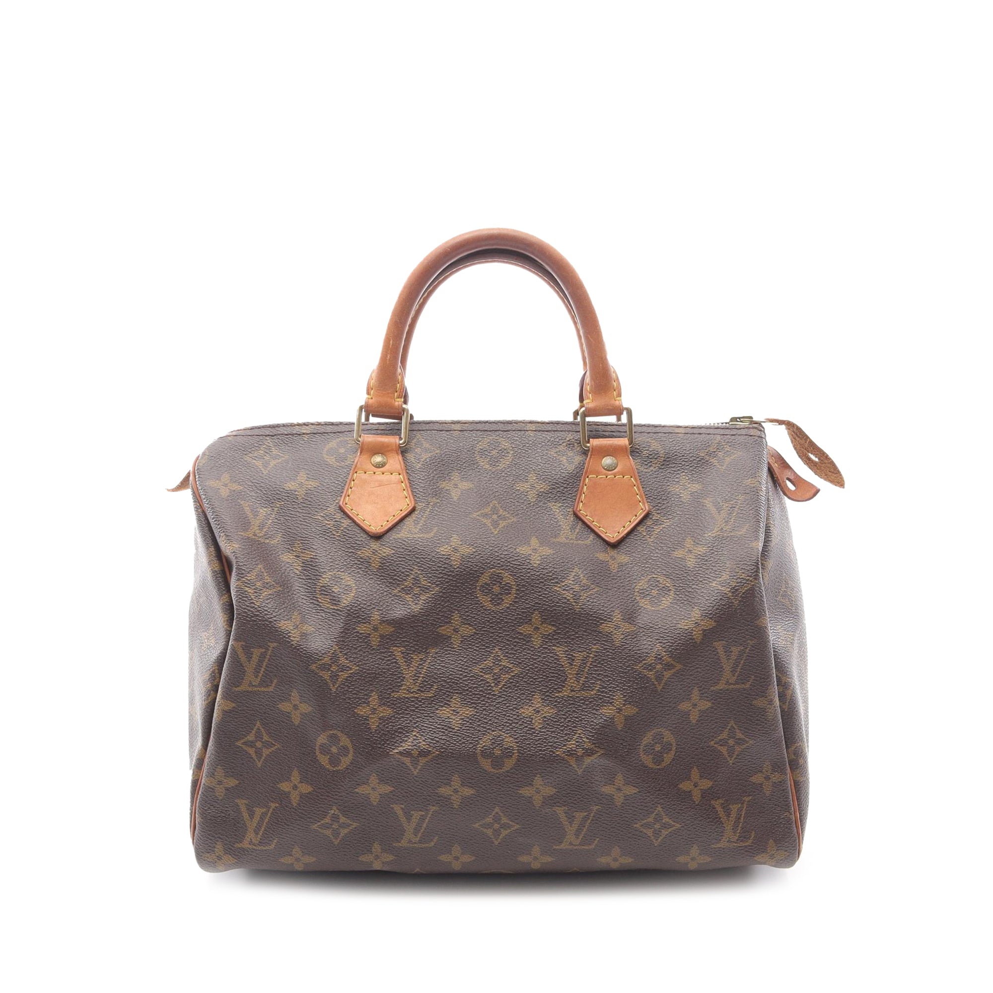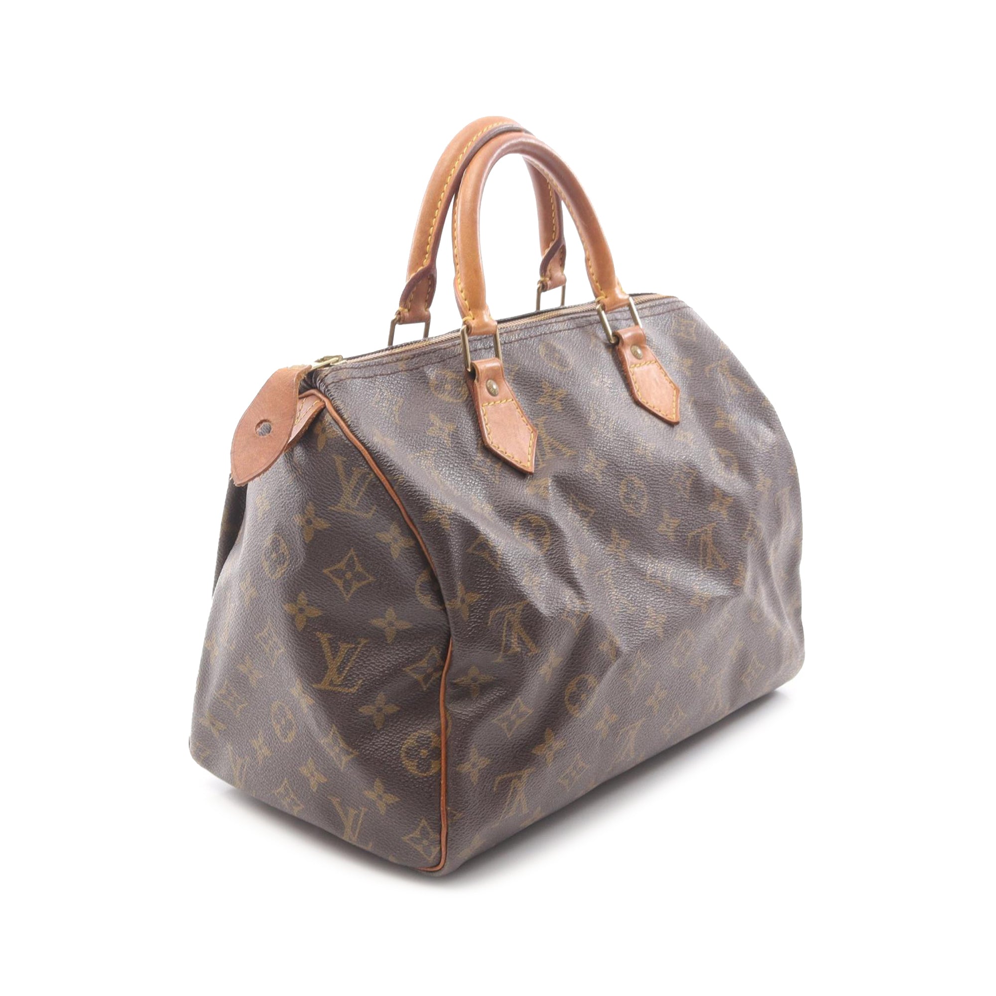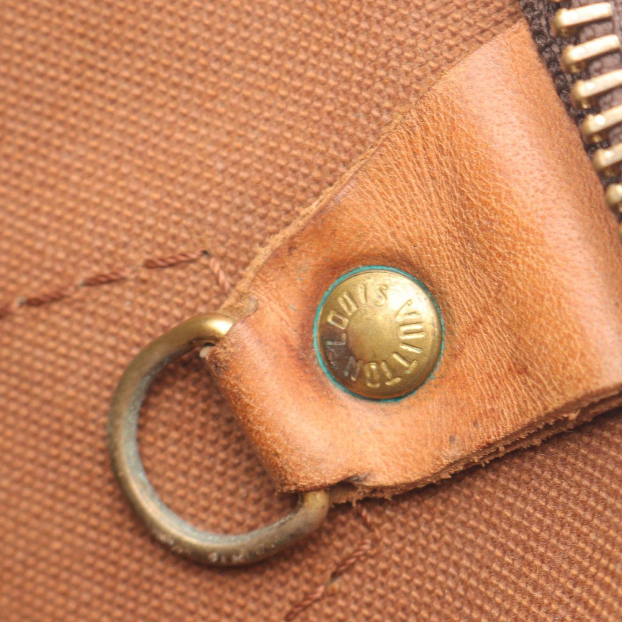 The Speedy 30 features a monogram canvas body with vachetta leather trim, rolled vachetta leather handles, a top zip closure, and an interior pocket. Retail Price: 1375.00