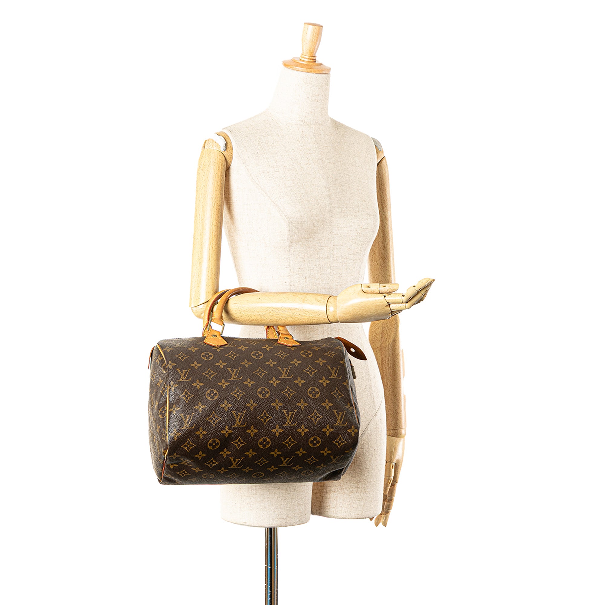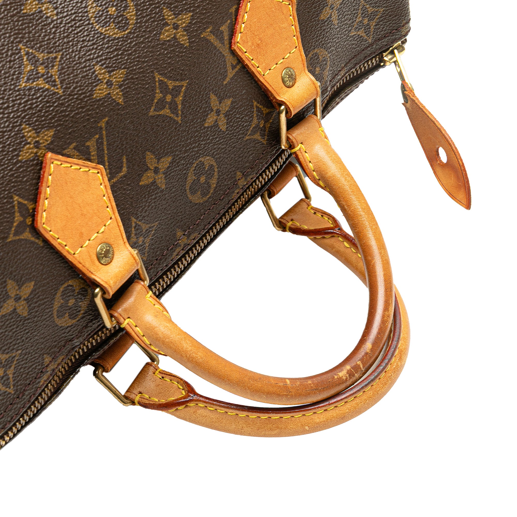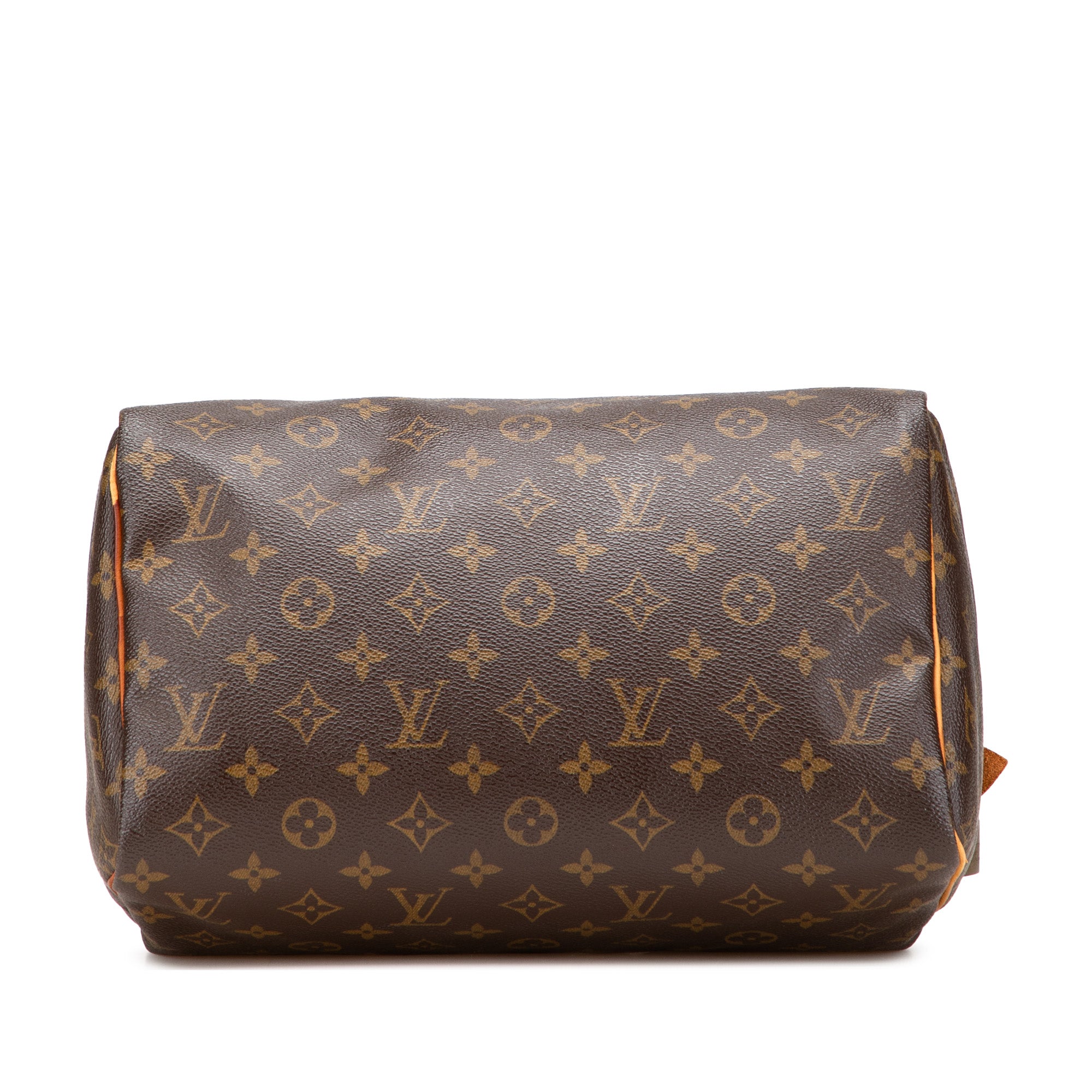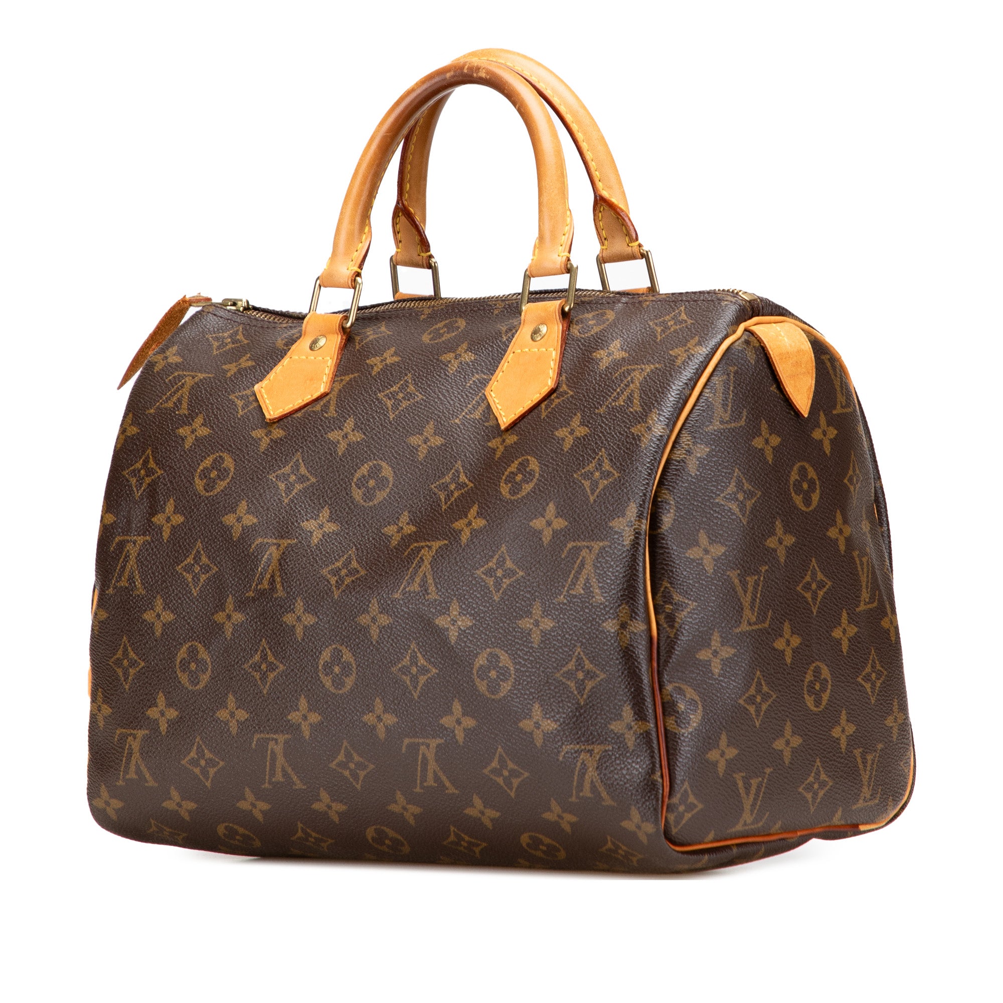 The Speedy 30 features a monogram canvas body, rolled vachetta leather handles, a top zip closure, and an interior pocket. Retail Price: 1375.00