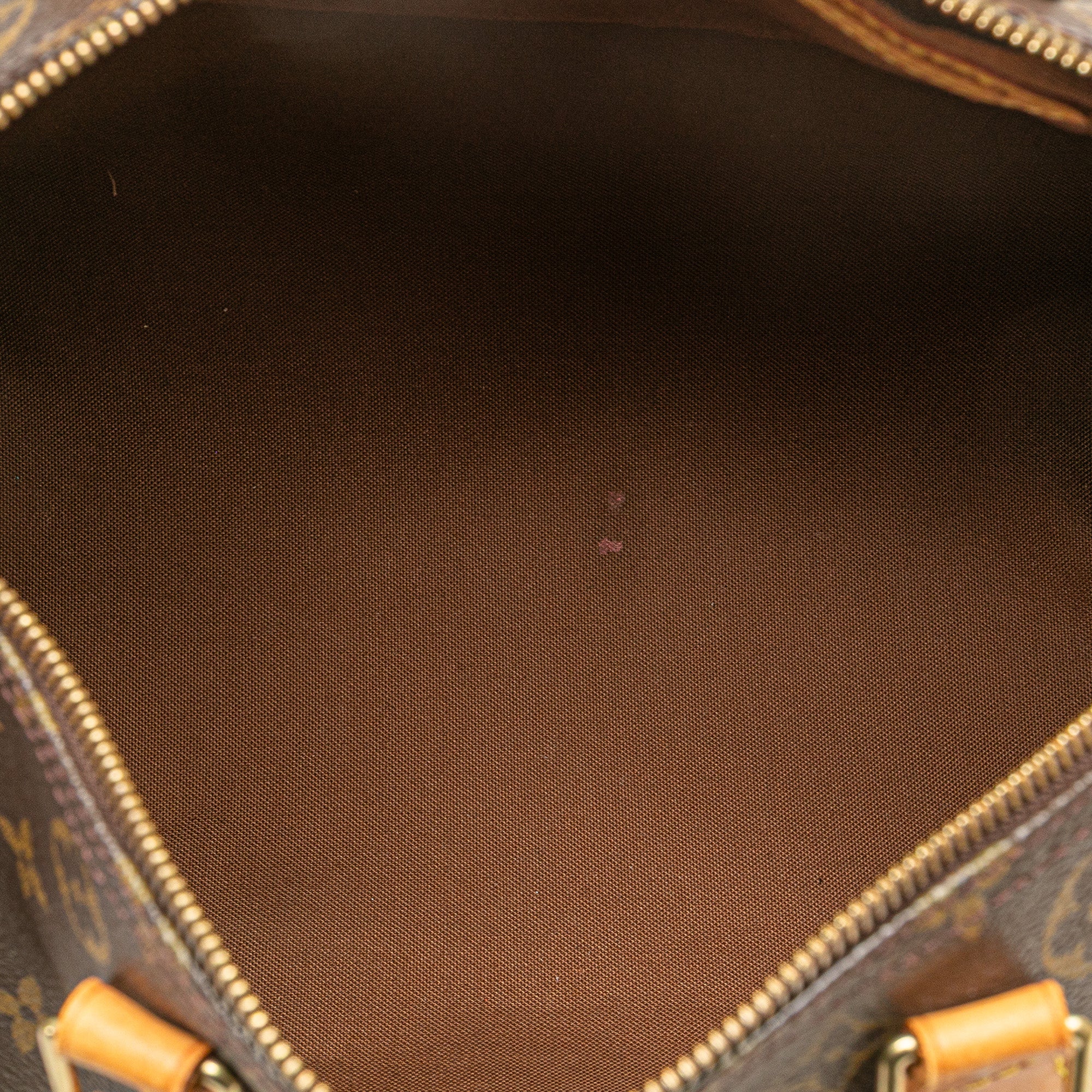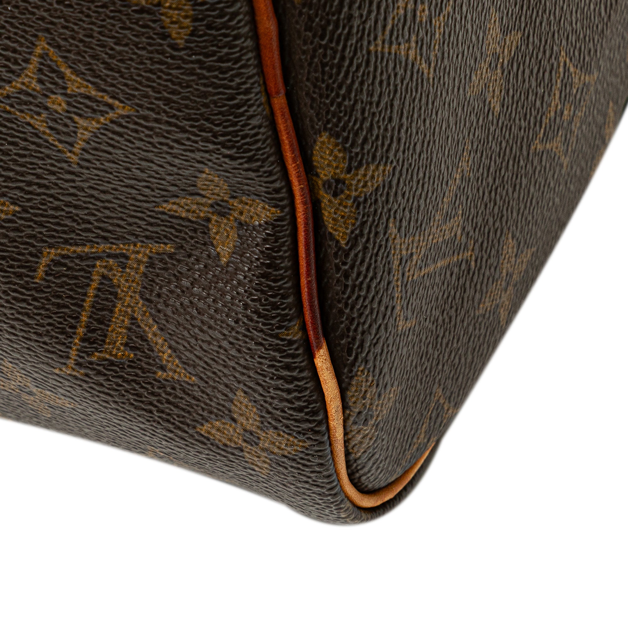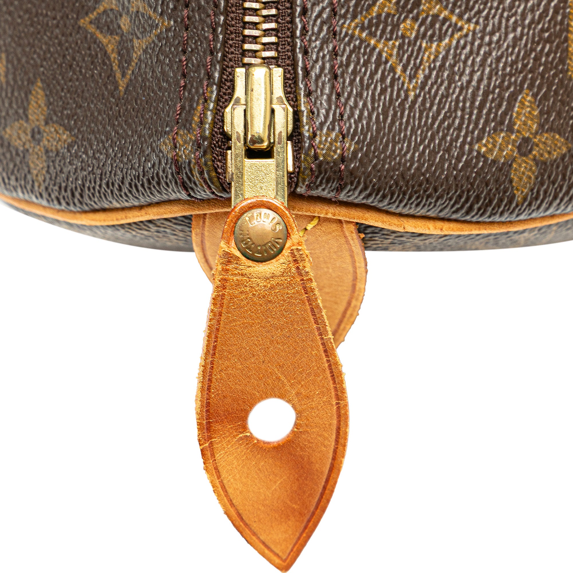 The Speedy 30 features a monogram canvas body, rolled vachetta leather handles, a top zip closure, and an interior pocket. Retail Price: 1375.00