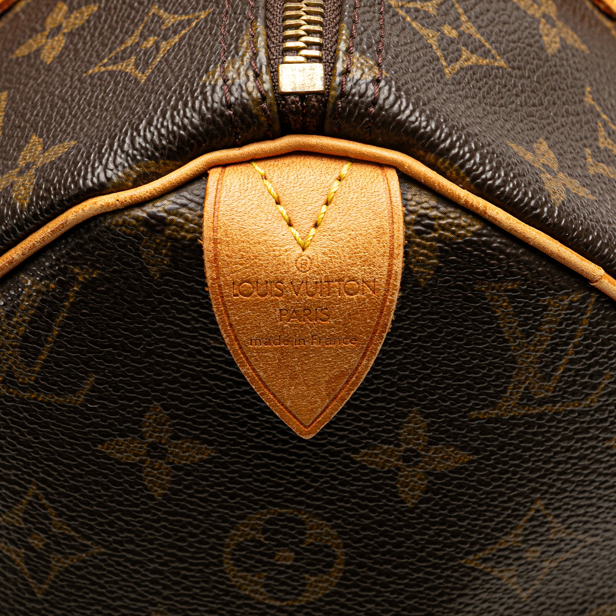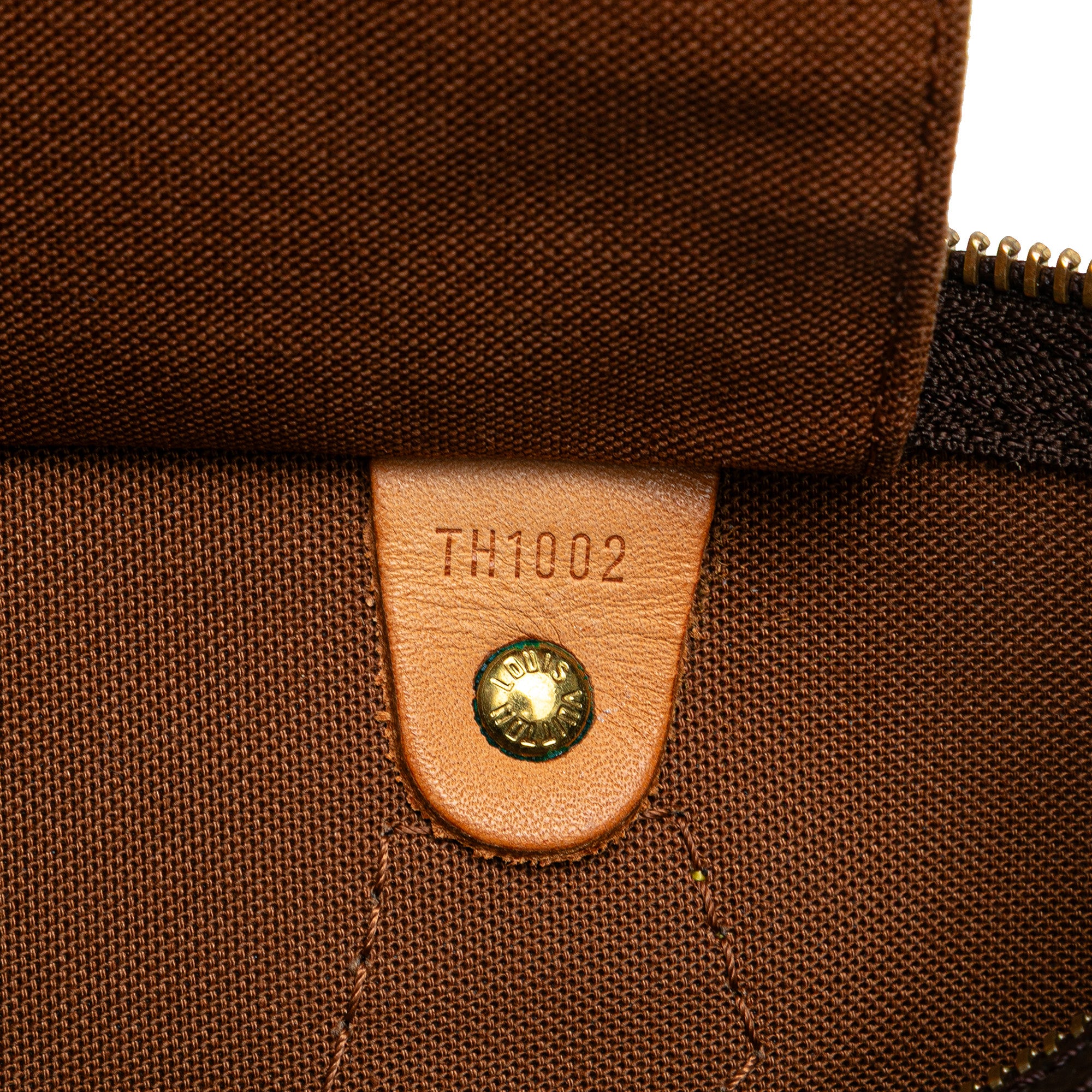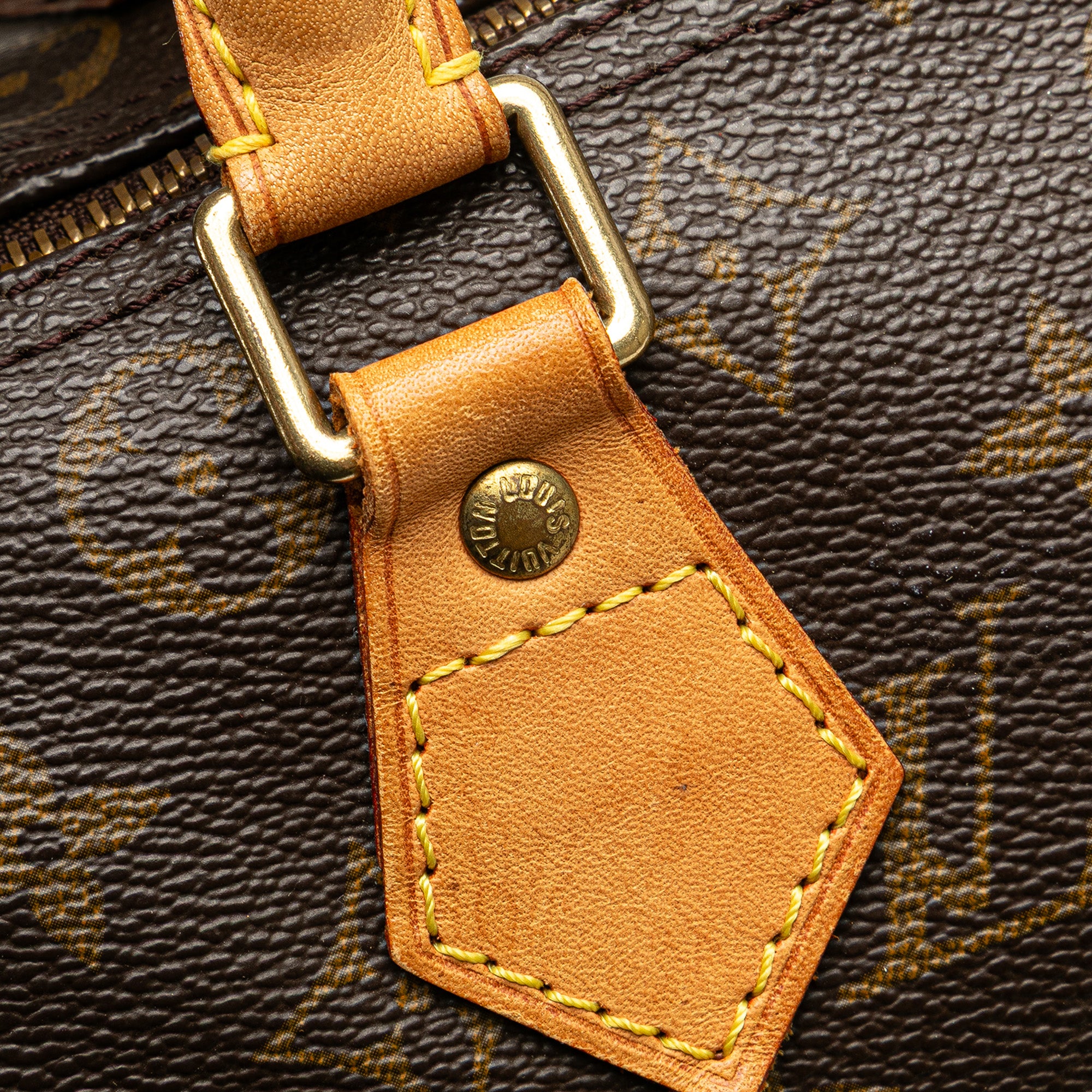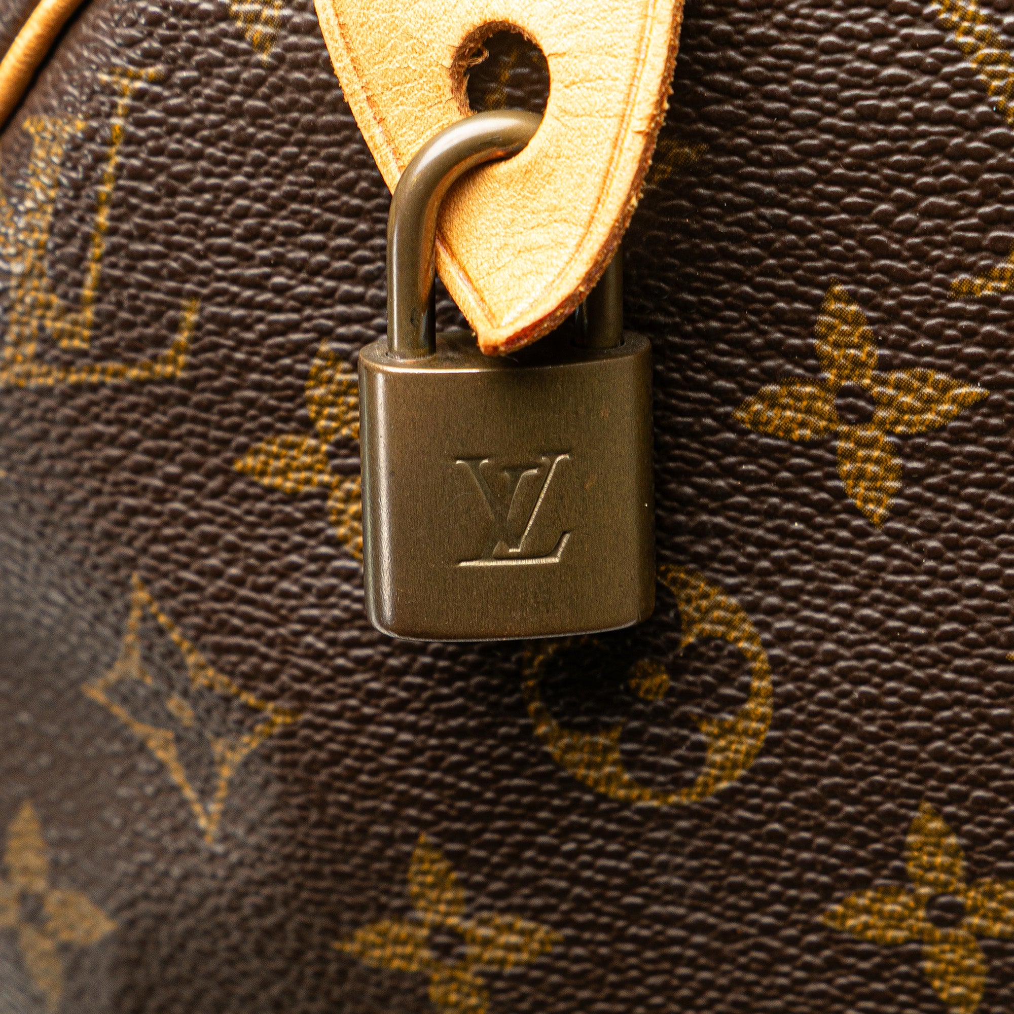 The Speedy 30 features a monogram canvas body, rolled vachetta leather handles, a top zip closure, and an interior pocket. Retail Price: 1375.00