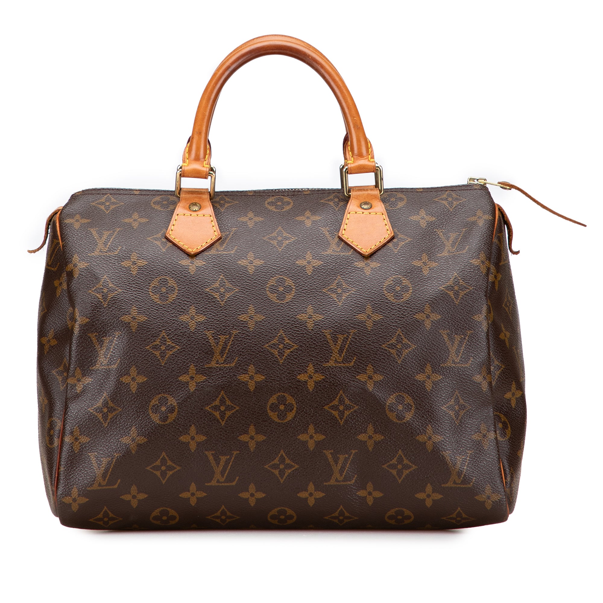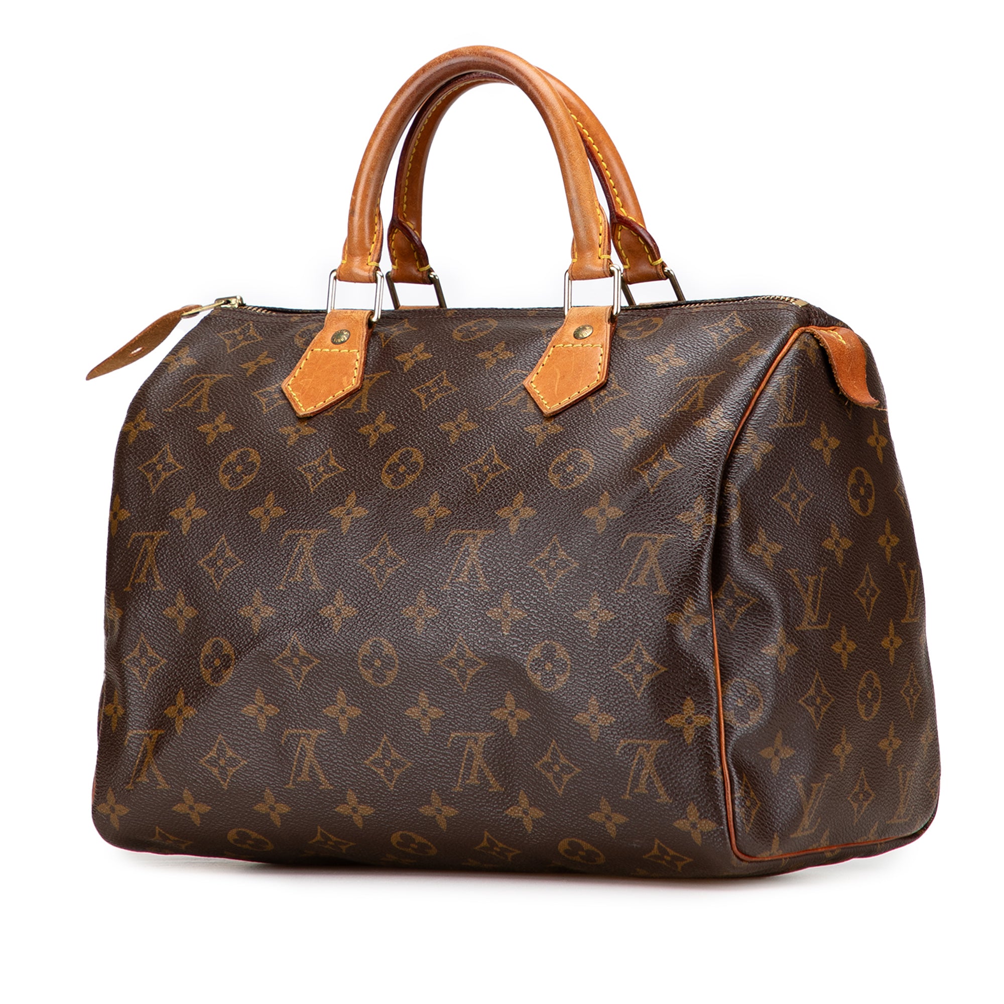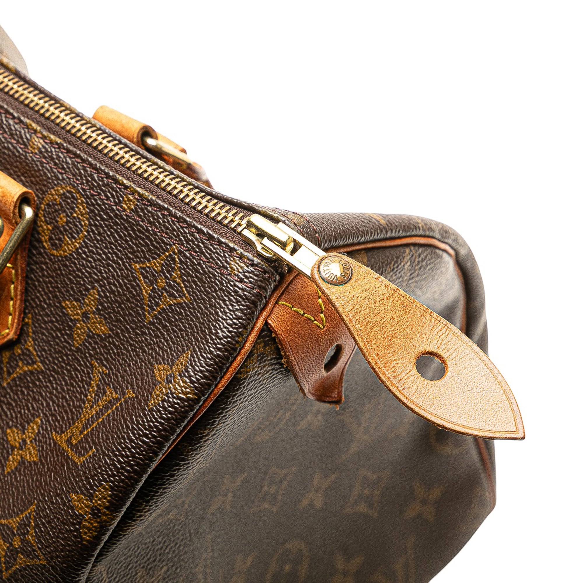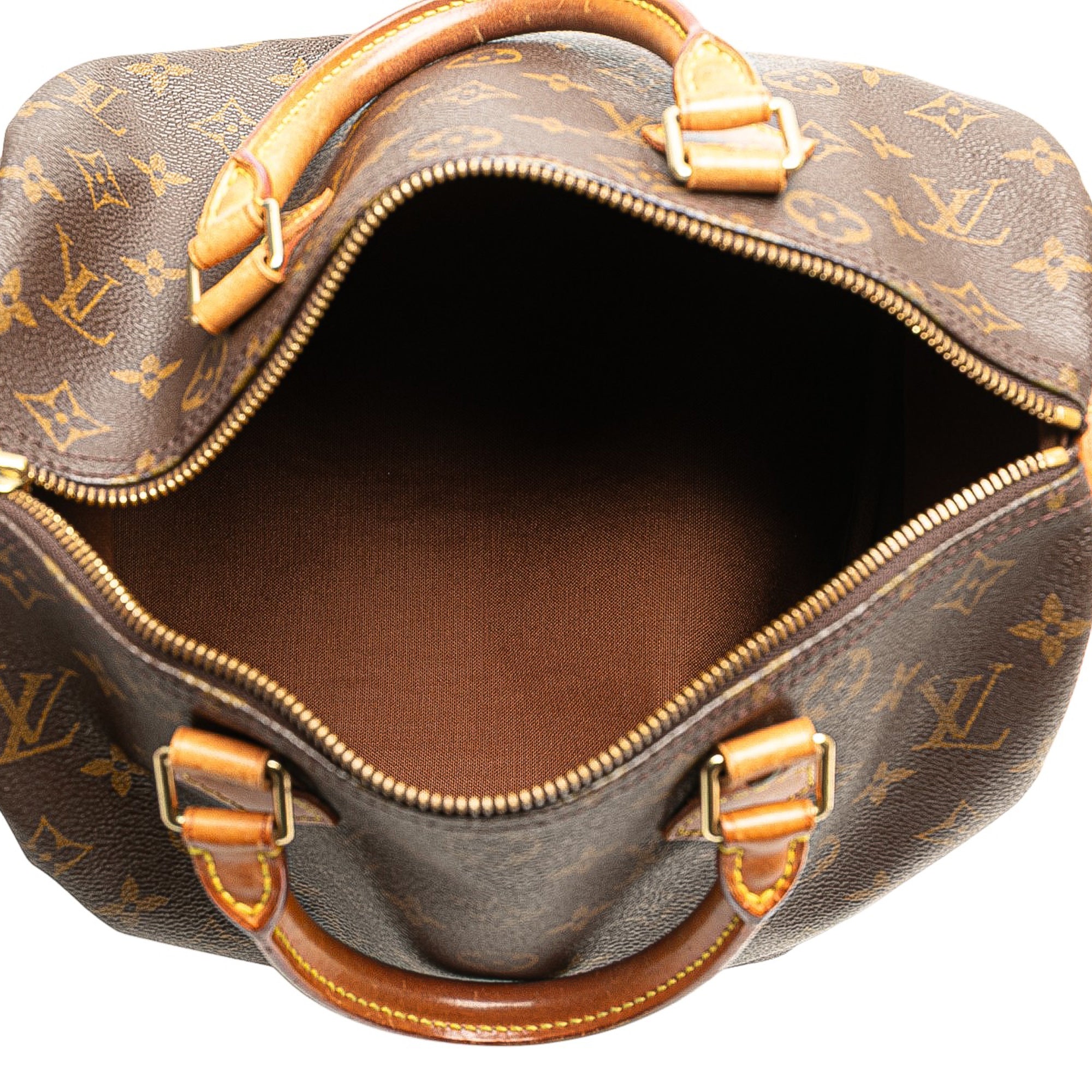 The Speedy 30 features a monogram canvas body with vachetta leather trim, rolled vachetta leather top handles, a top zip closure, and an interior slip pocket. Retail Price: 1375.00