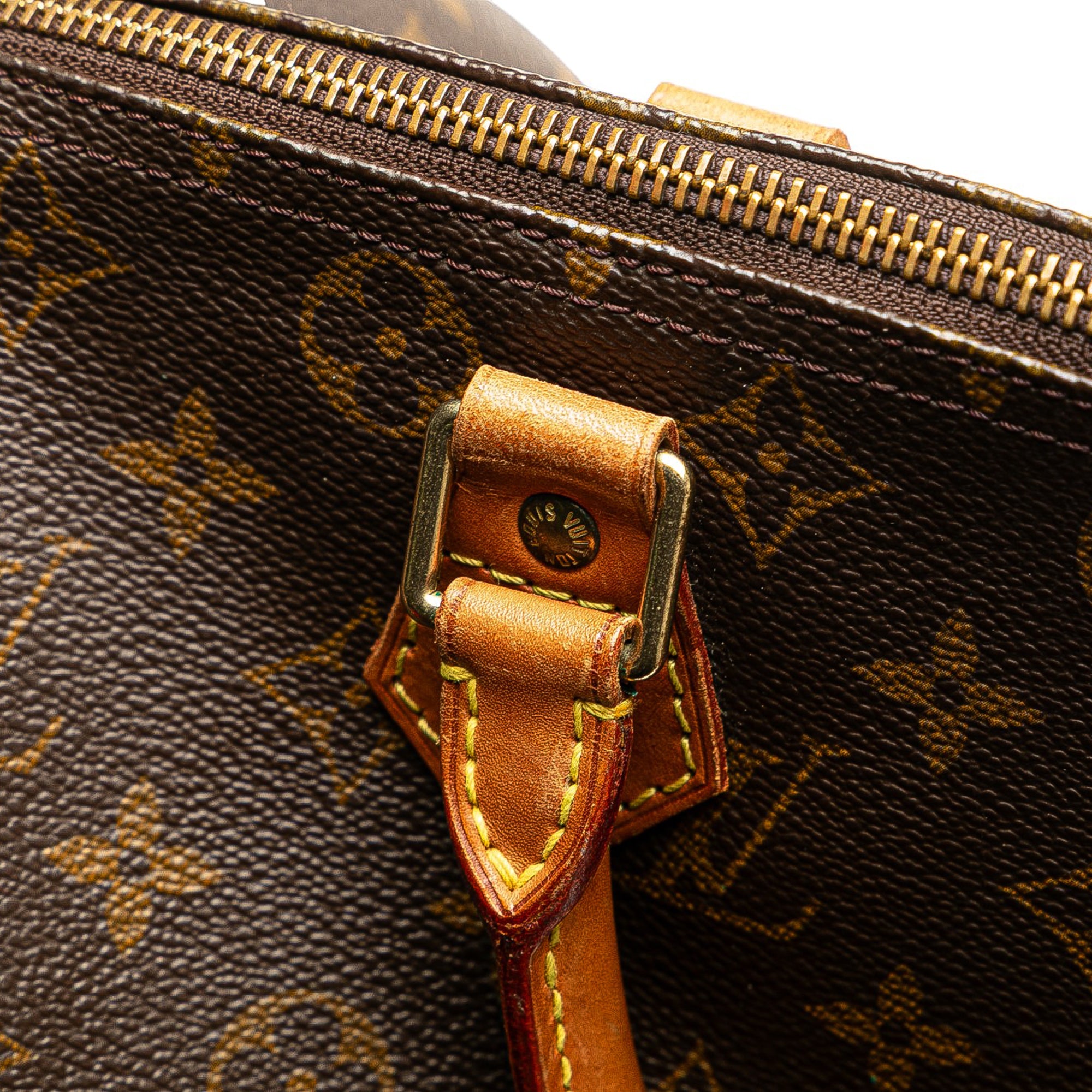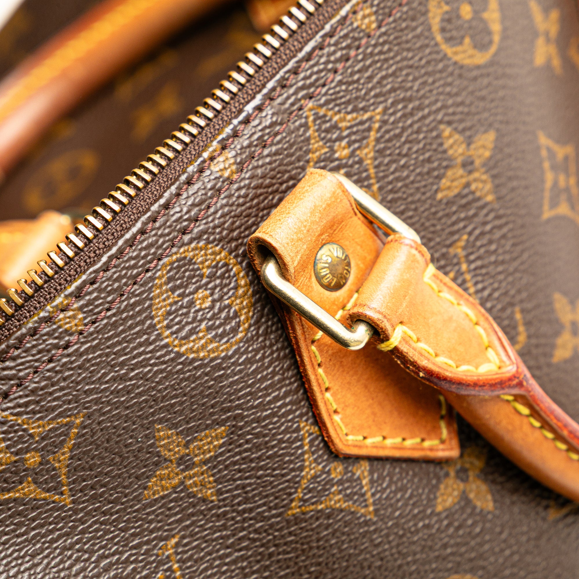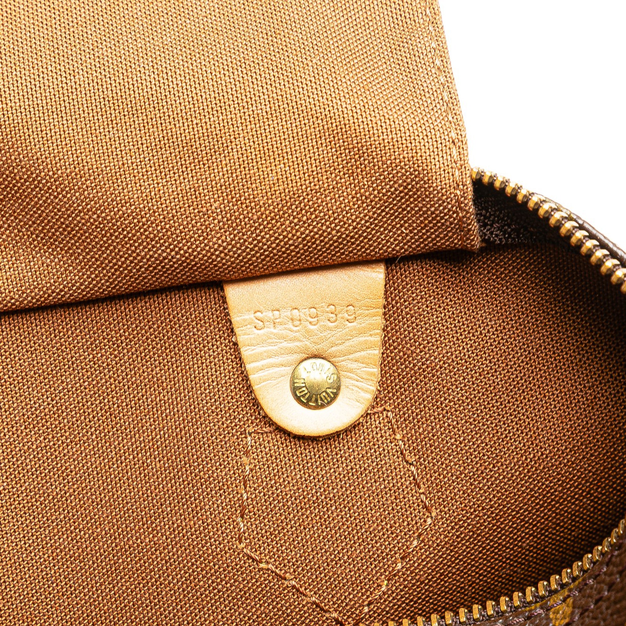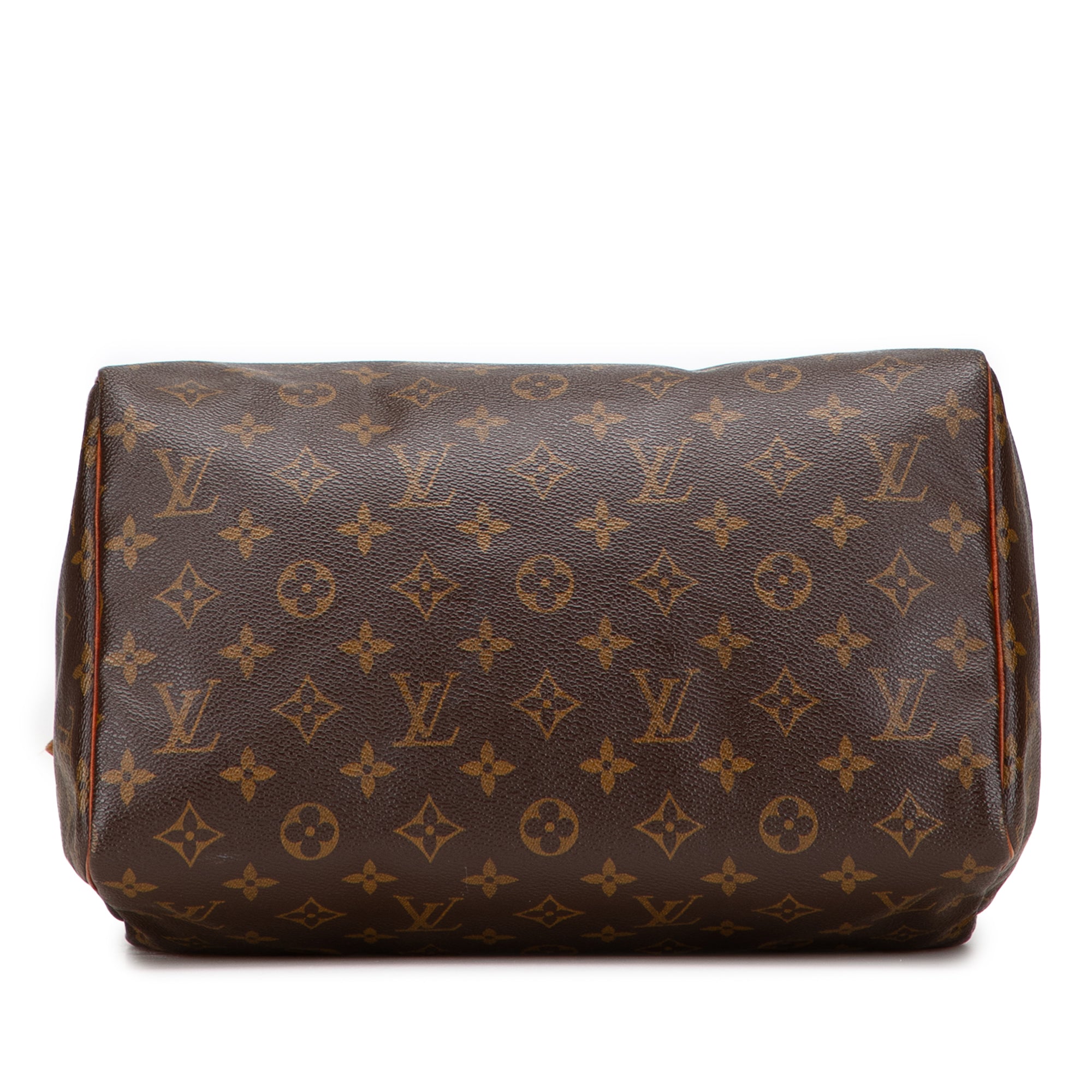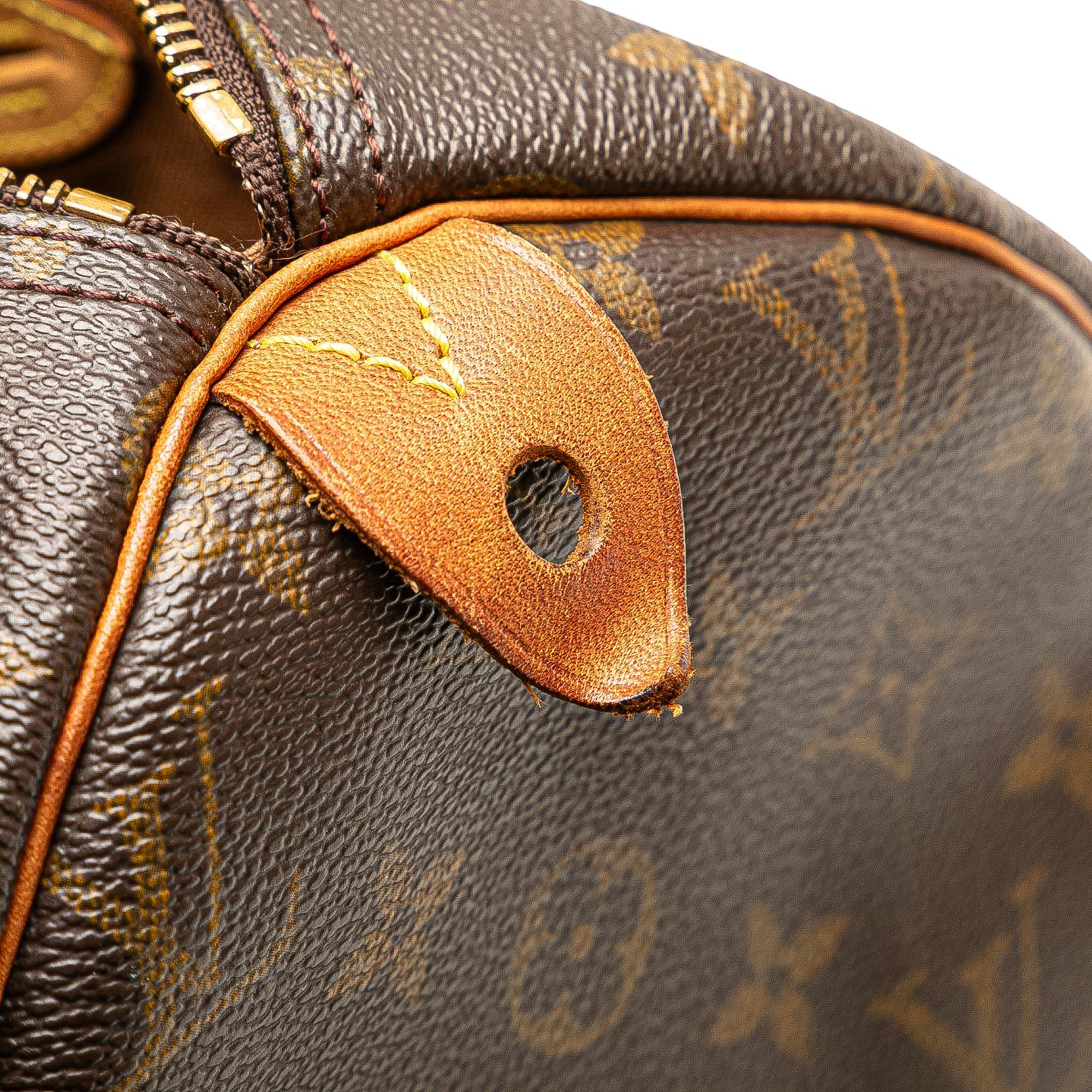 The Speedy 30 features a monogram canvas body with vachetta leather trim, rolled vachetta leather top handles, a top zip closure, and an interior slip pocket. Retail Price: 1375.00