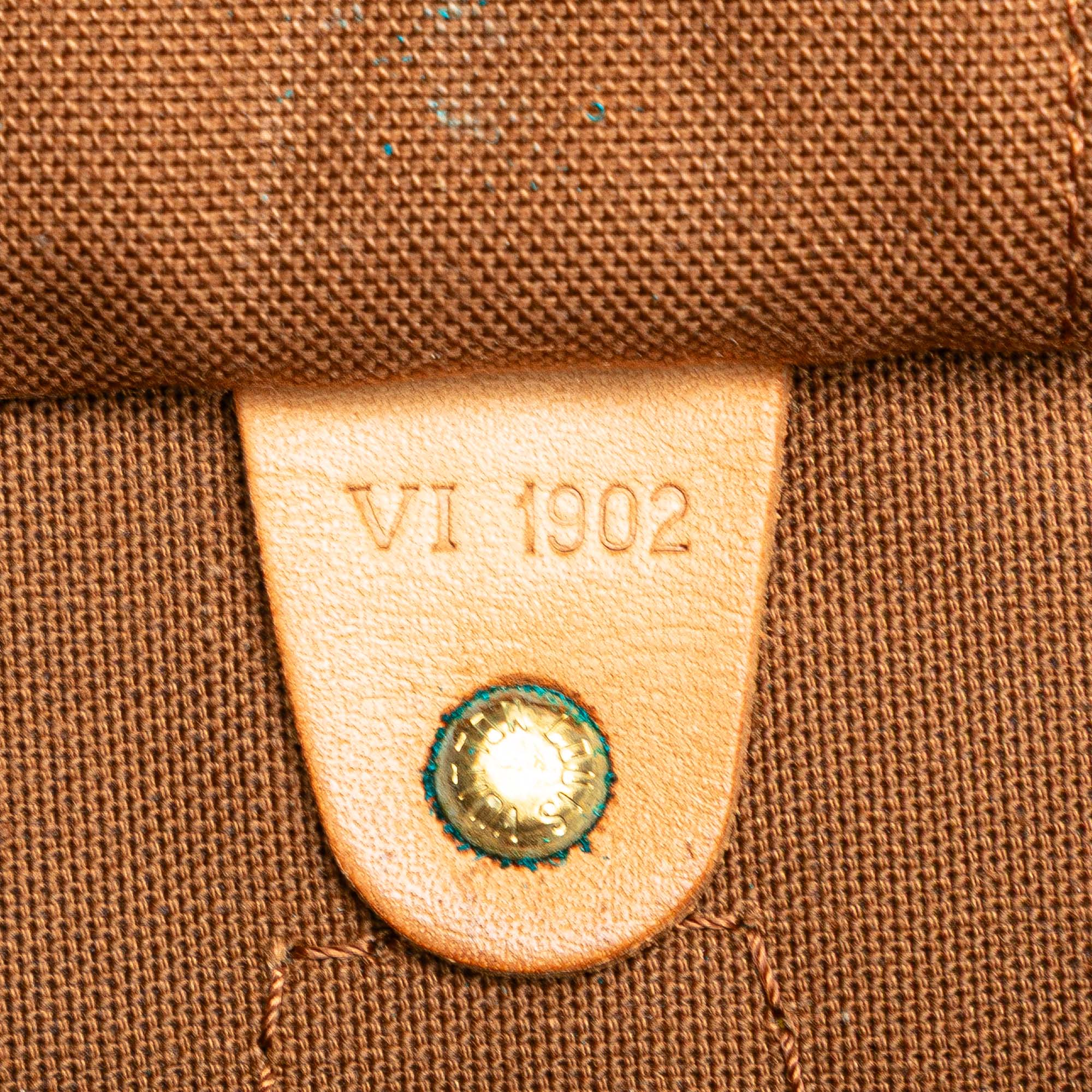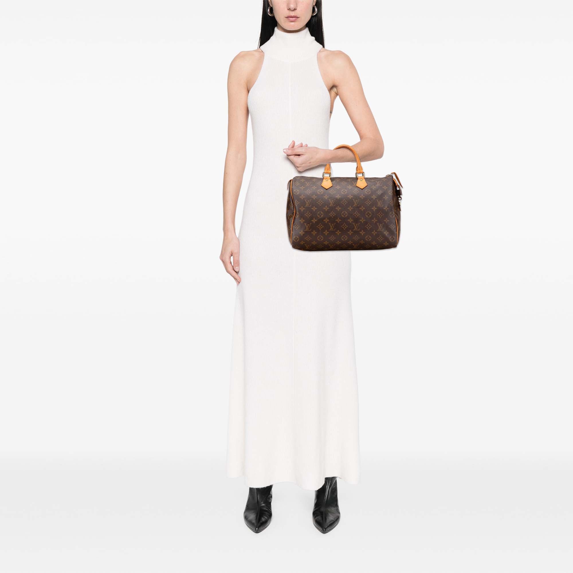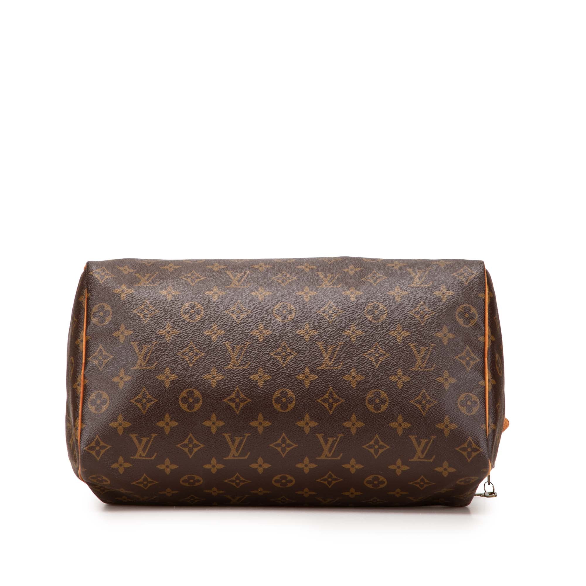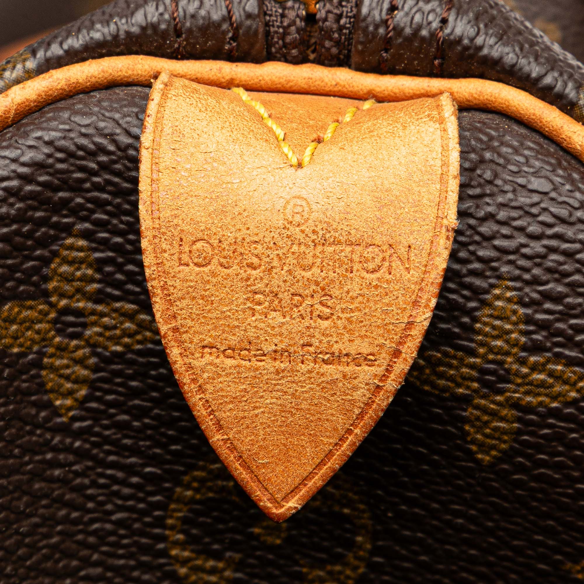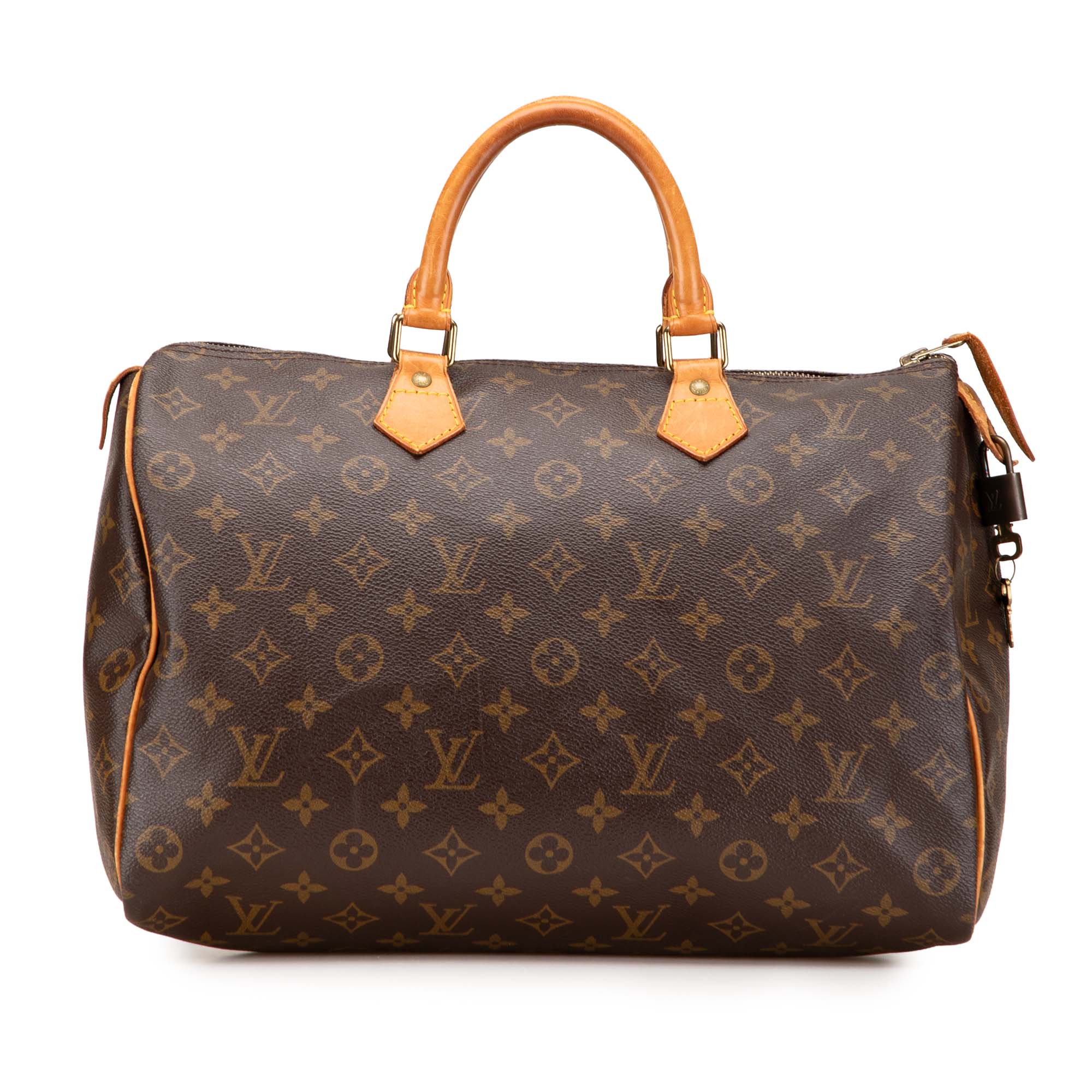 The Speedy 35 features a monogram canvas body, rolled vachetta leather handles, a top zip closure, and an interior slip pocket. Retail Price: 1230.00