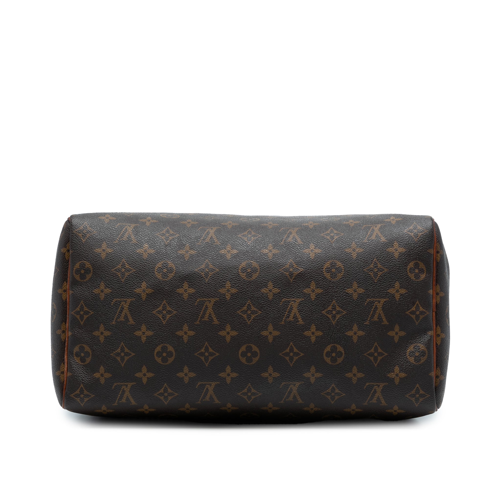 The Speedy 35 features a monogram canvas body, rolled vachetta leather handles, a top zip closure, and an interior slip pocket. Retail Price: 1230.00