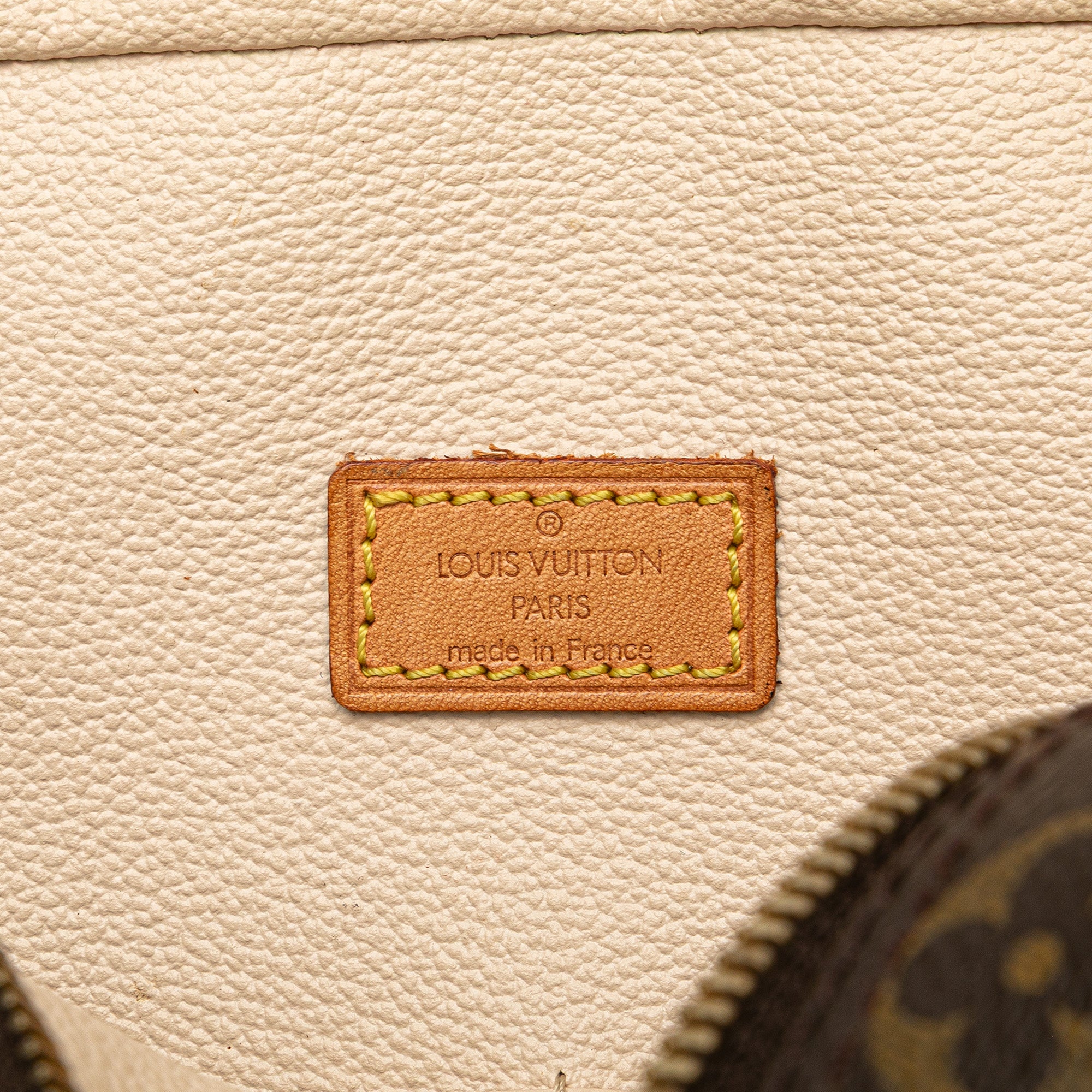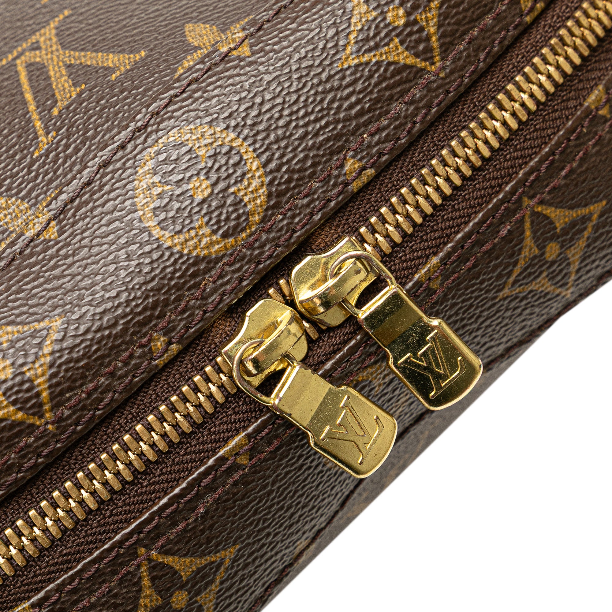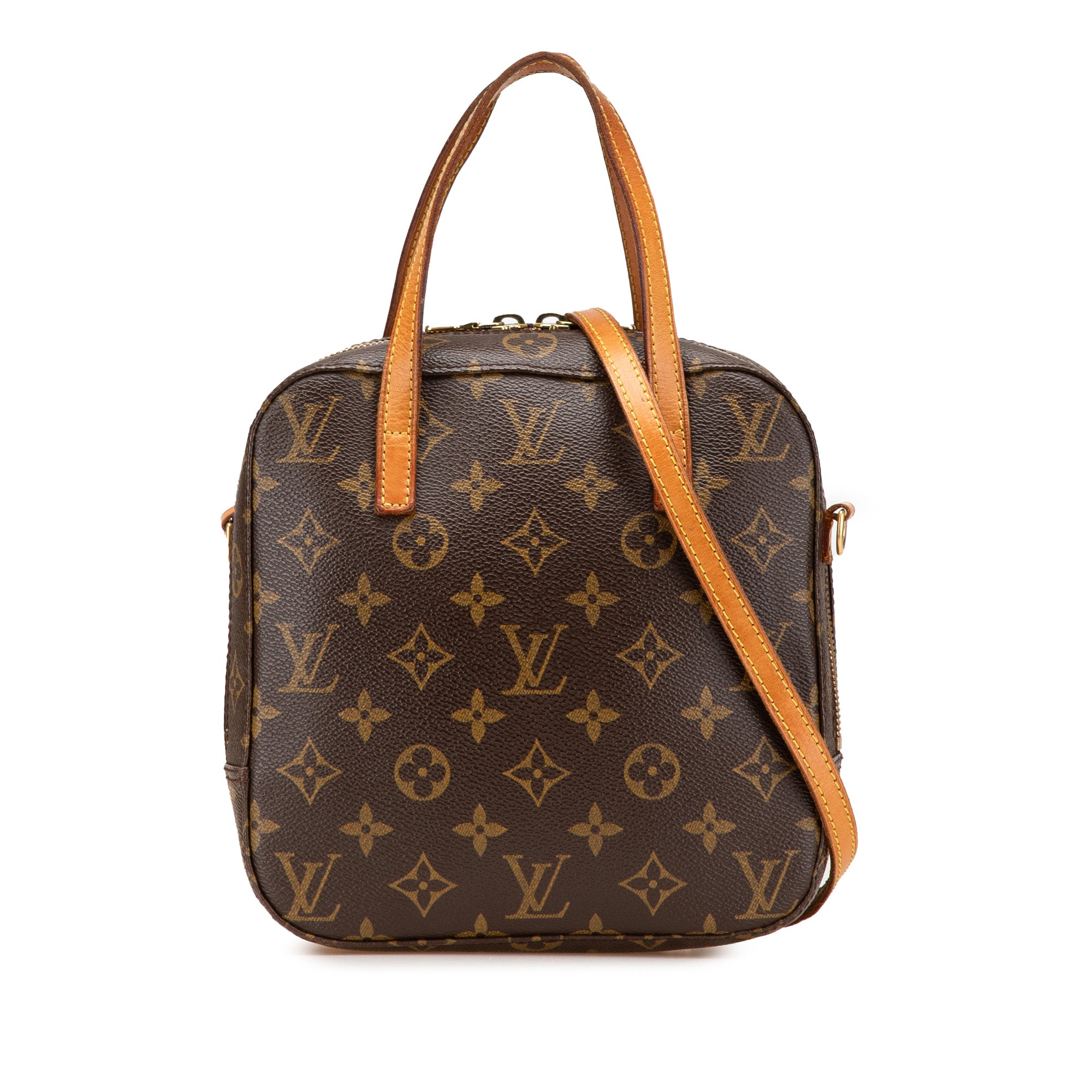 The Spontini features a monogram canvas body, flat vachetta leather handles, flat vachetta leather strap, a top zip closure, and interior slip pockets. Retail Price: 1250.00