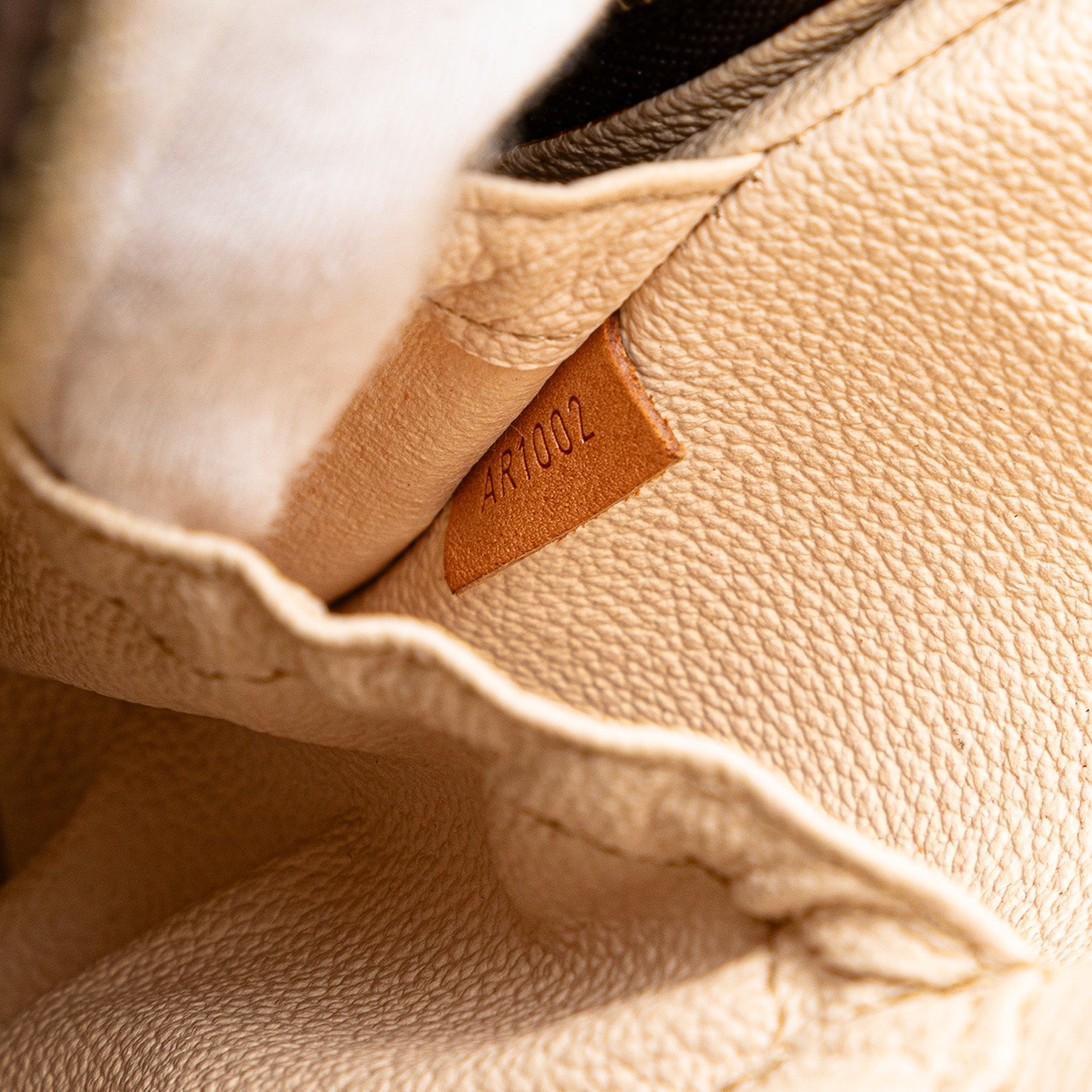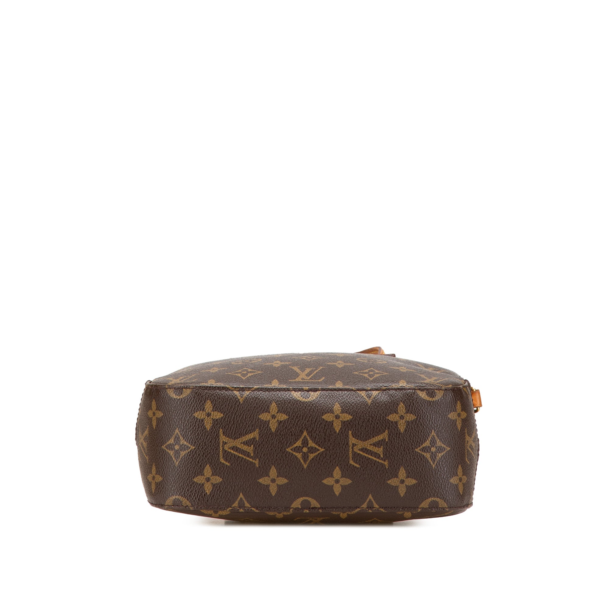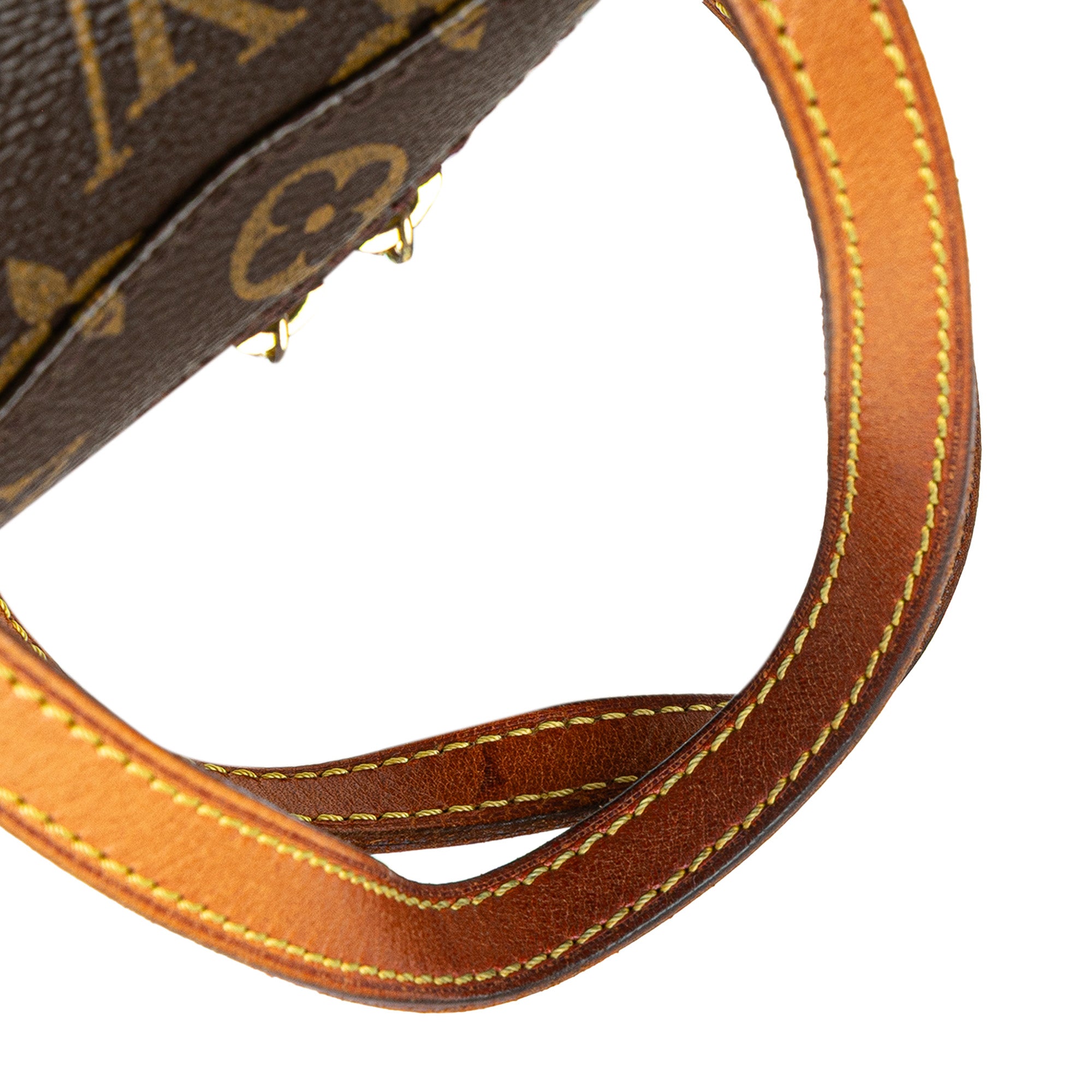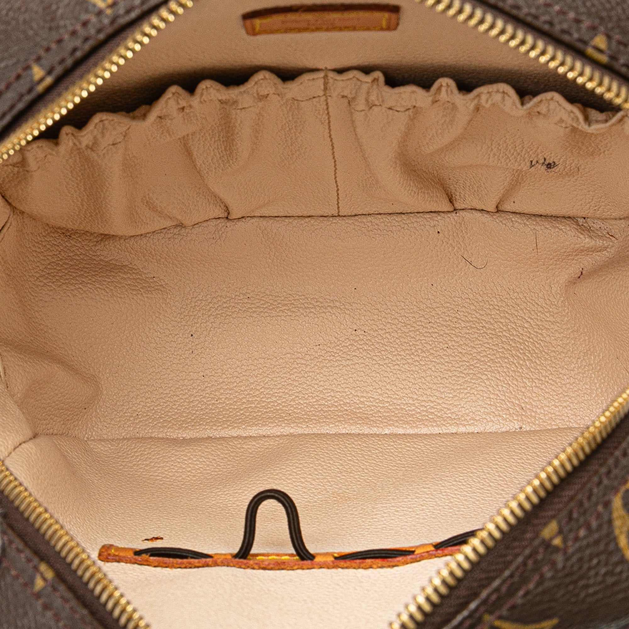 The Spontini features a monogram canvas body, flat vachetta leather handles, flat vachetta leather strap, a top zip closure, and interior slip pockets. Retail Price: 1250.00