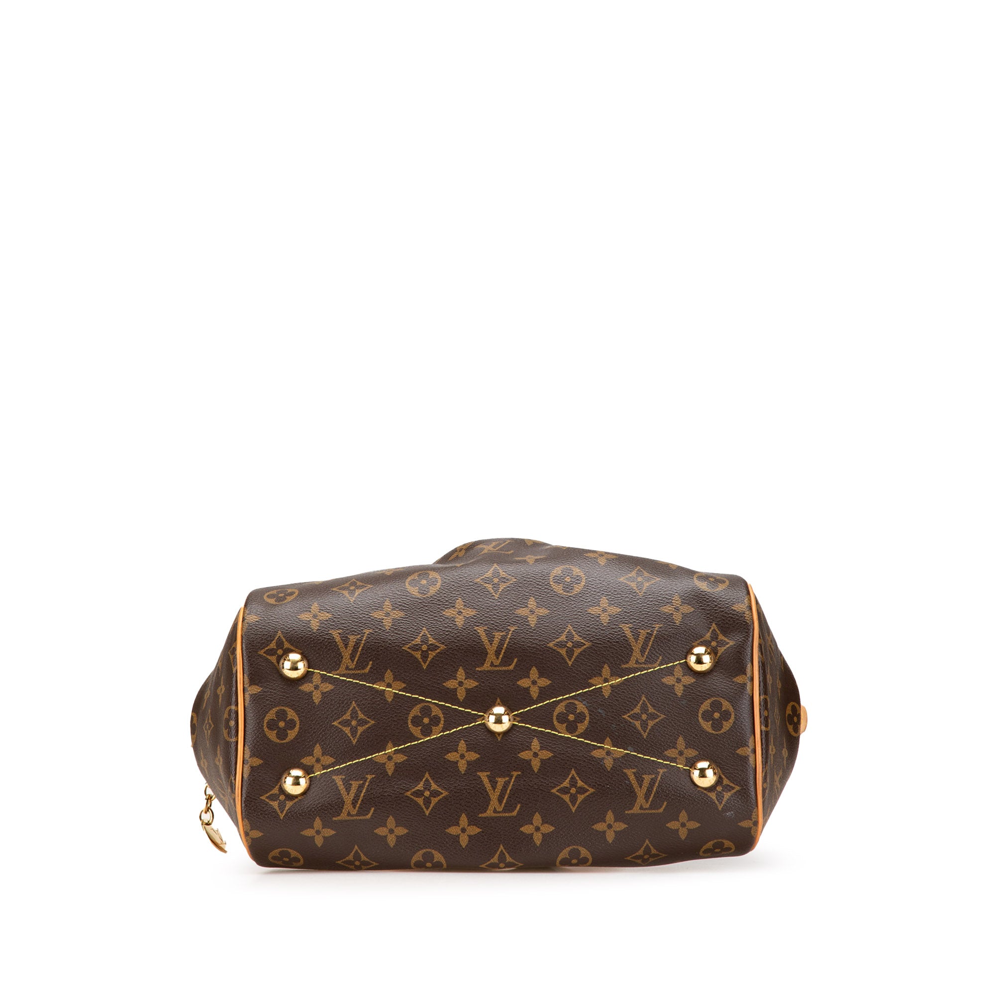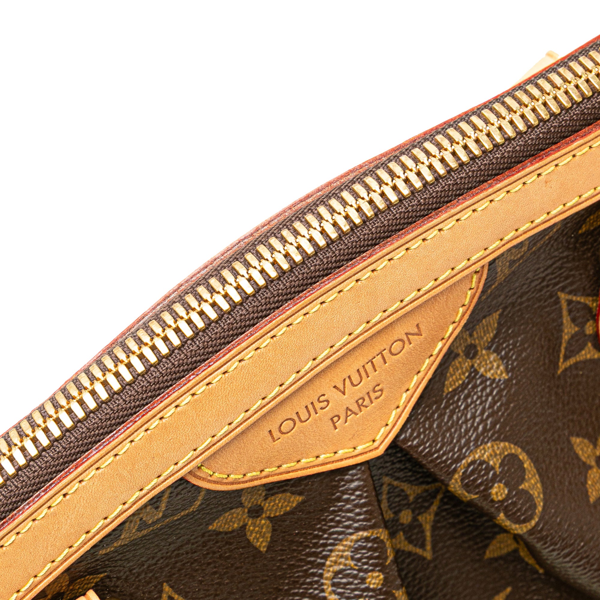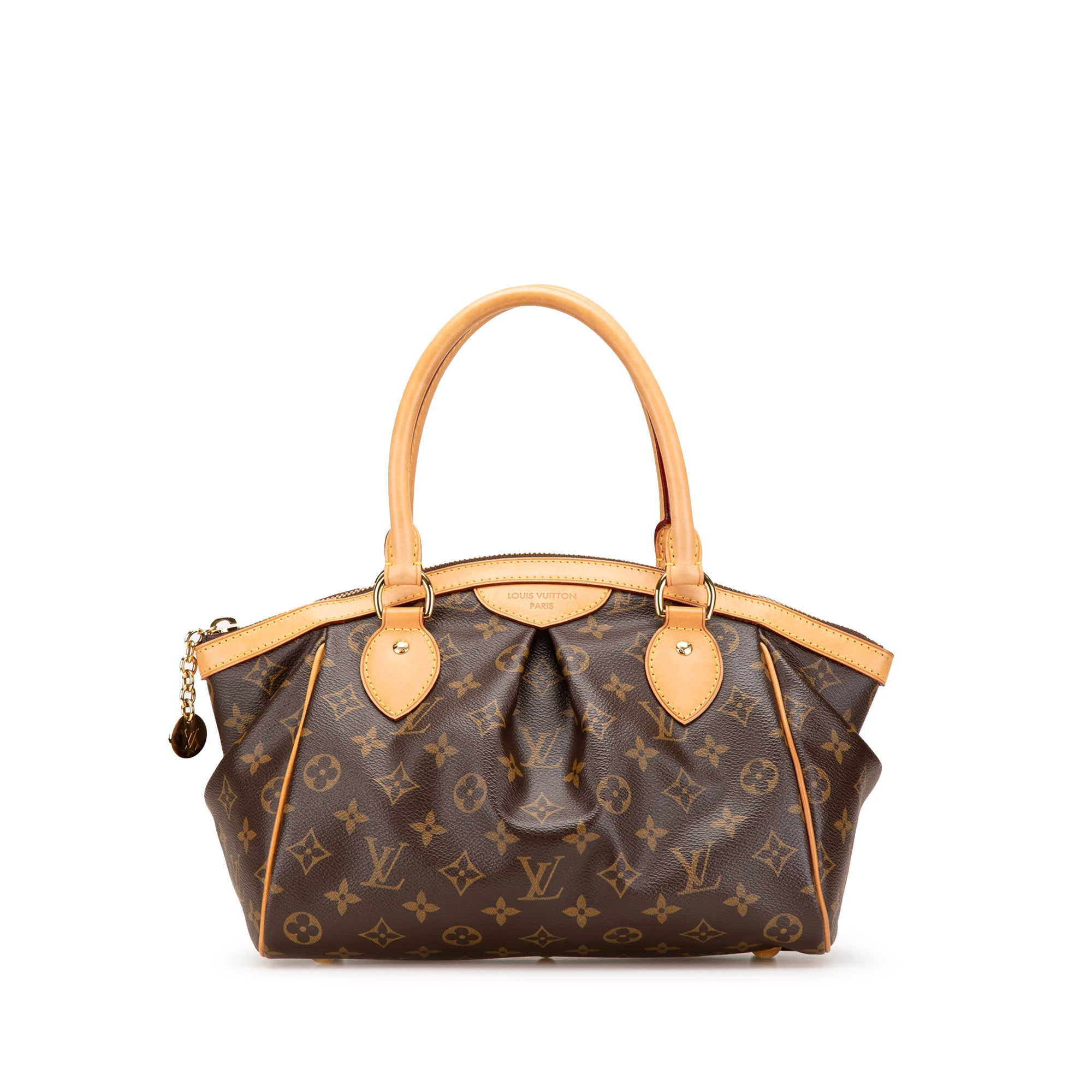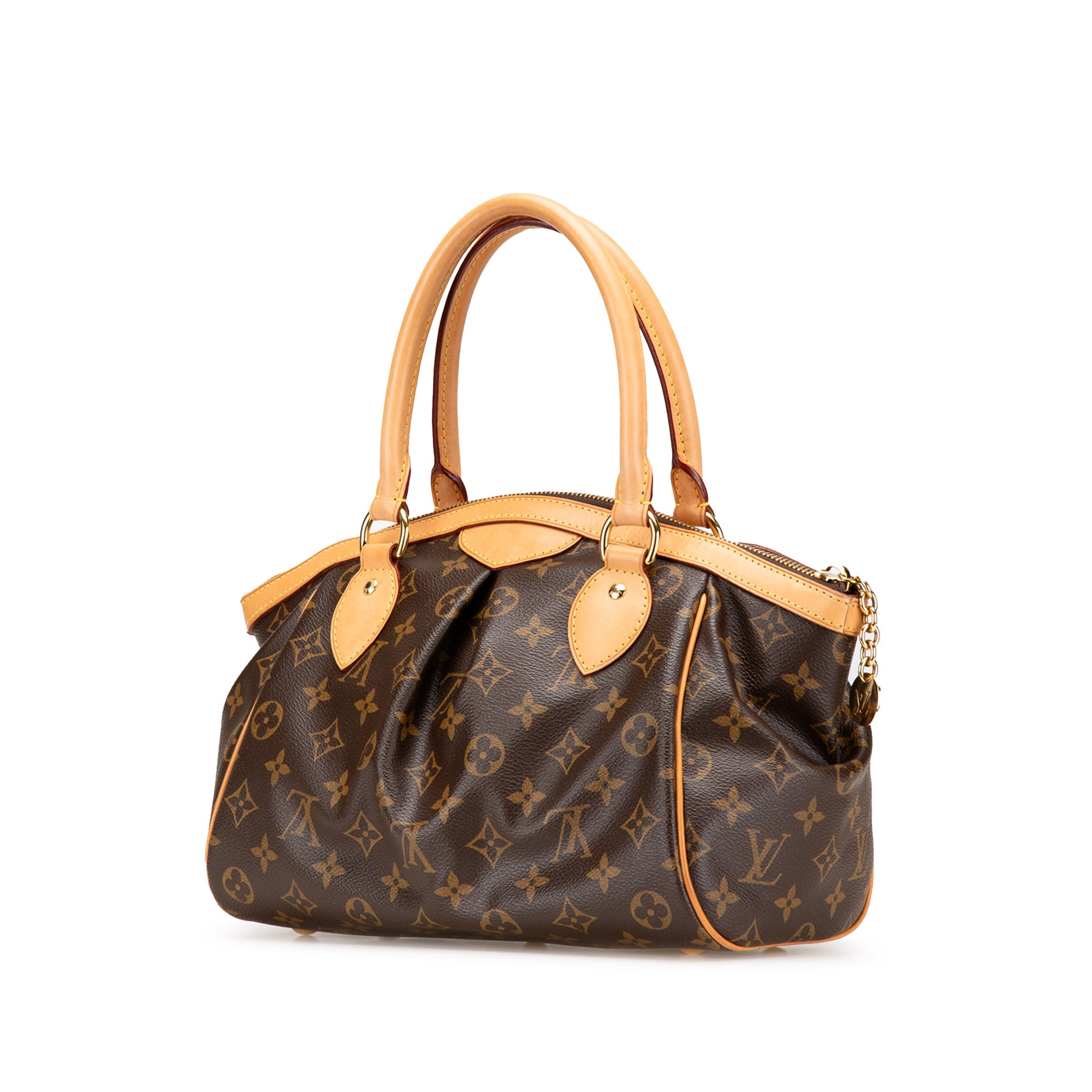 The Tivoli PM features a monogram canvas body with vachetta leather trim, rolled vachetta leather handles, a top zip closure, and interior slip pockets. Retail Price: 1475.00
