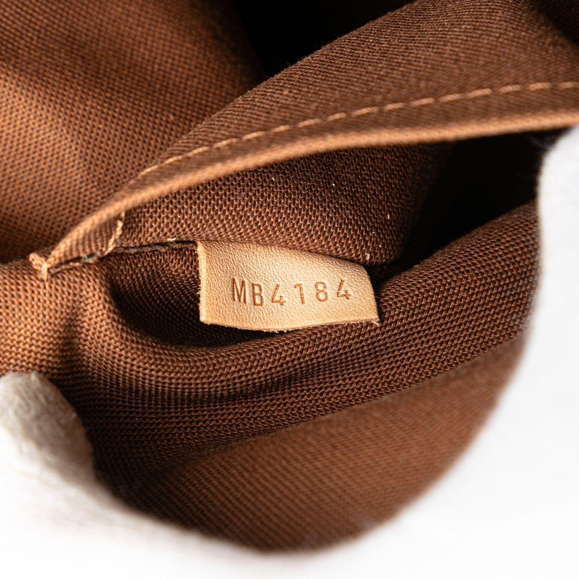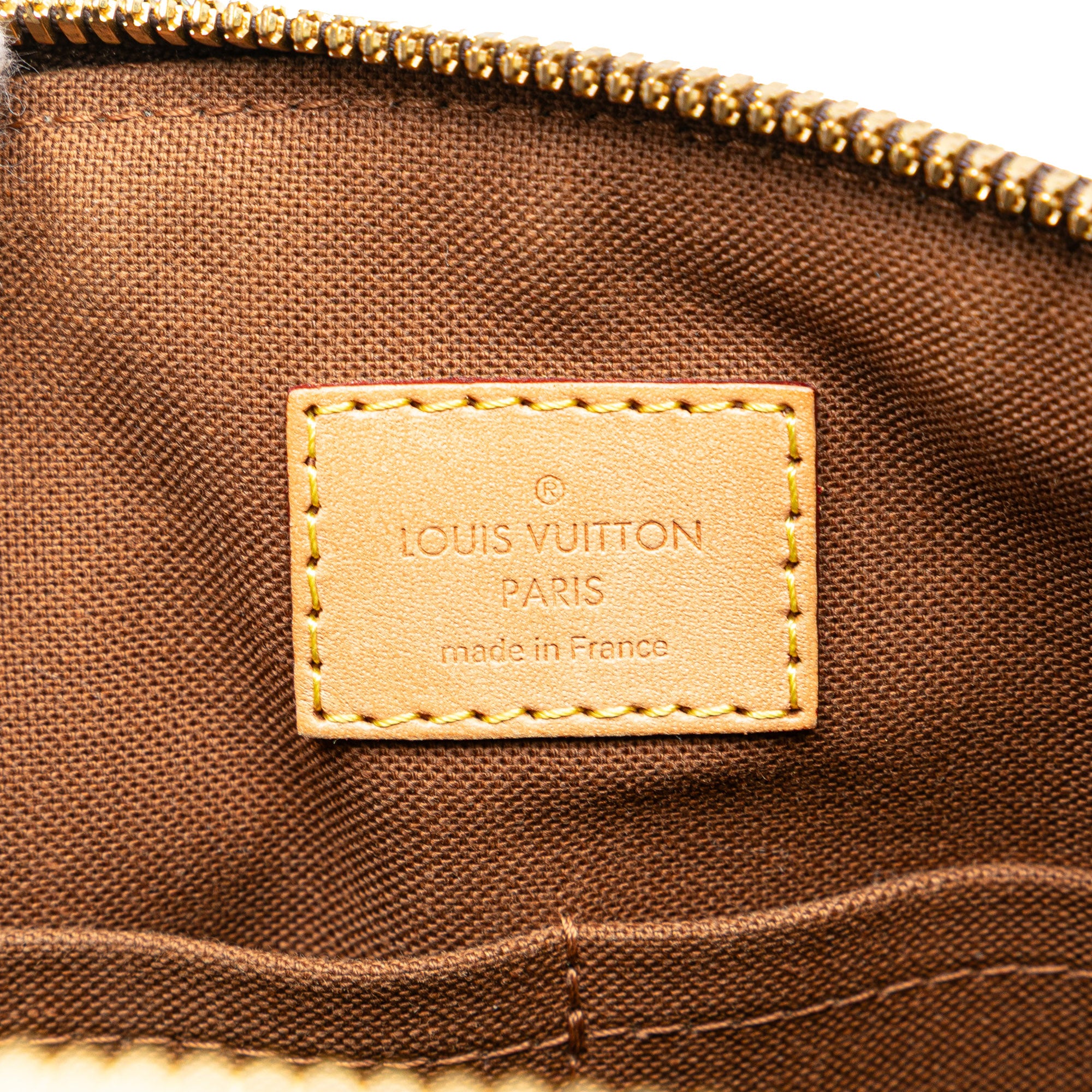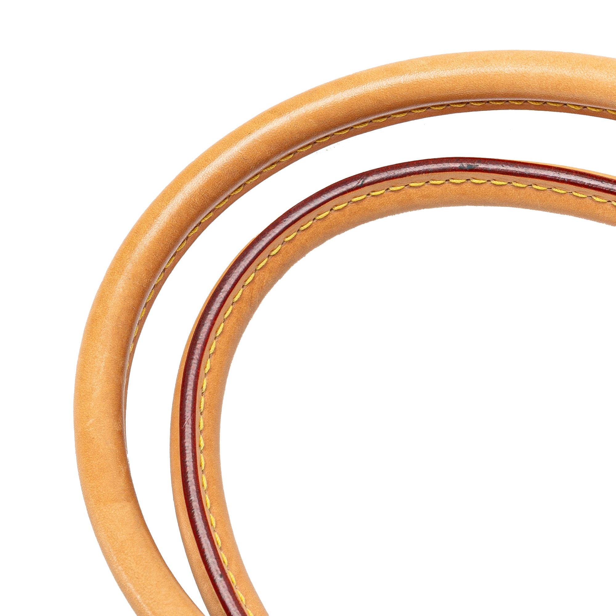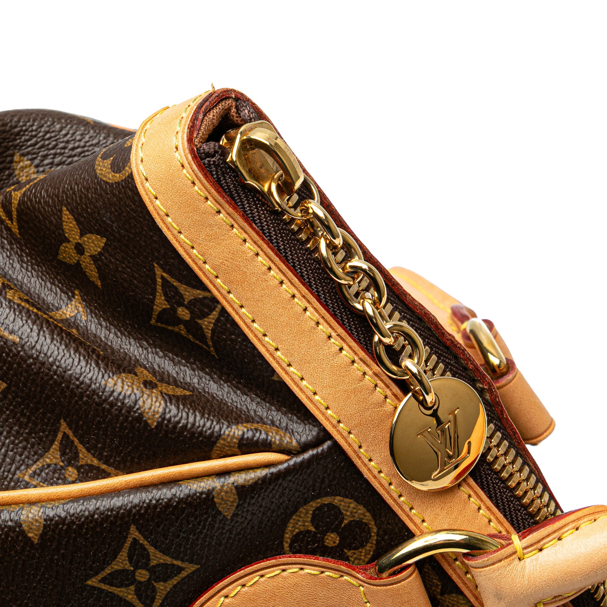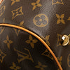 The Tivoli PM features a monogram canvas body with vachetta leather trim, rolled vachetta leather handles, a top zip closure, and interior slip pockets. Retail Price: 1475.00