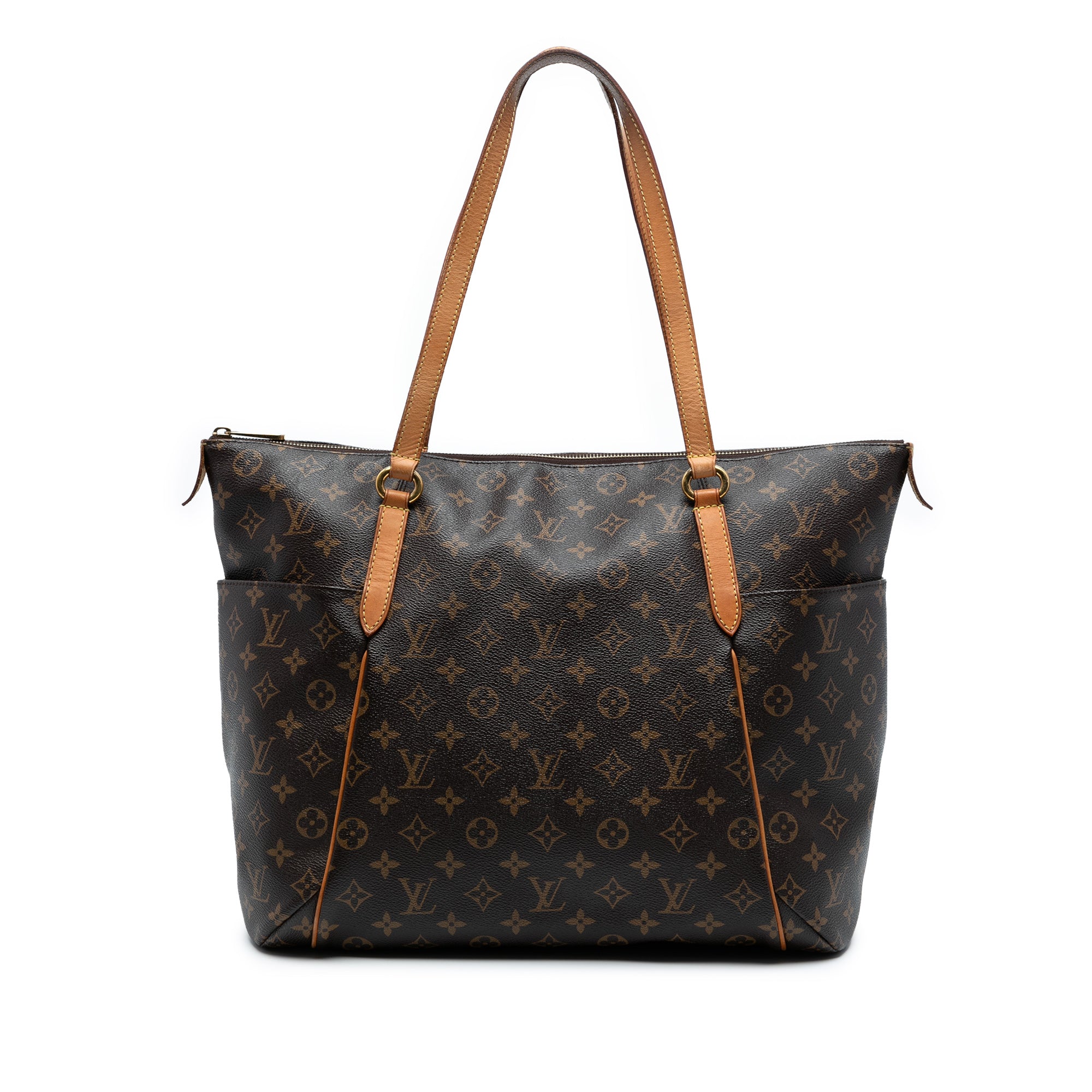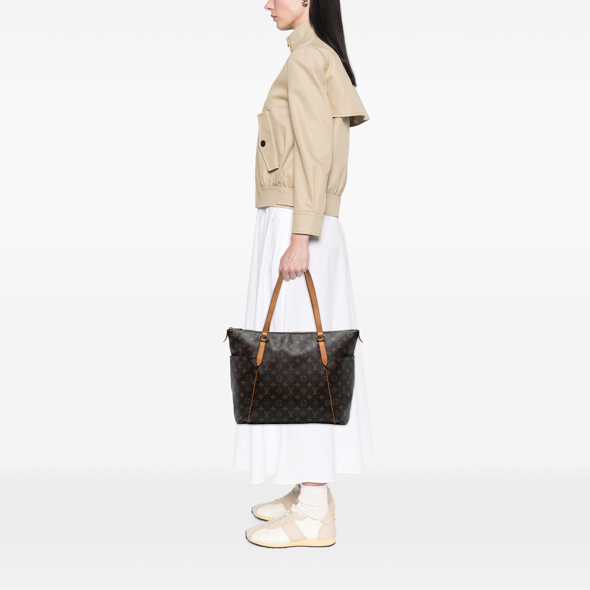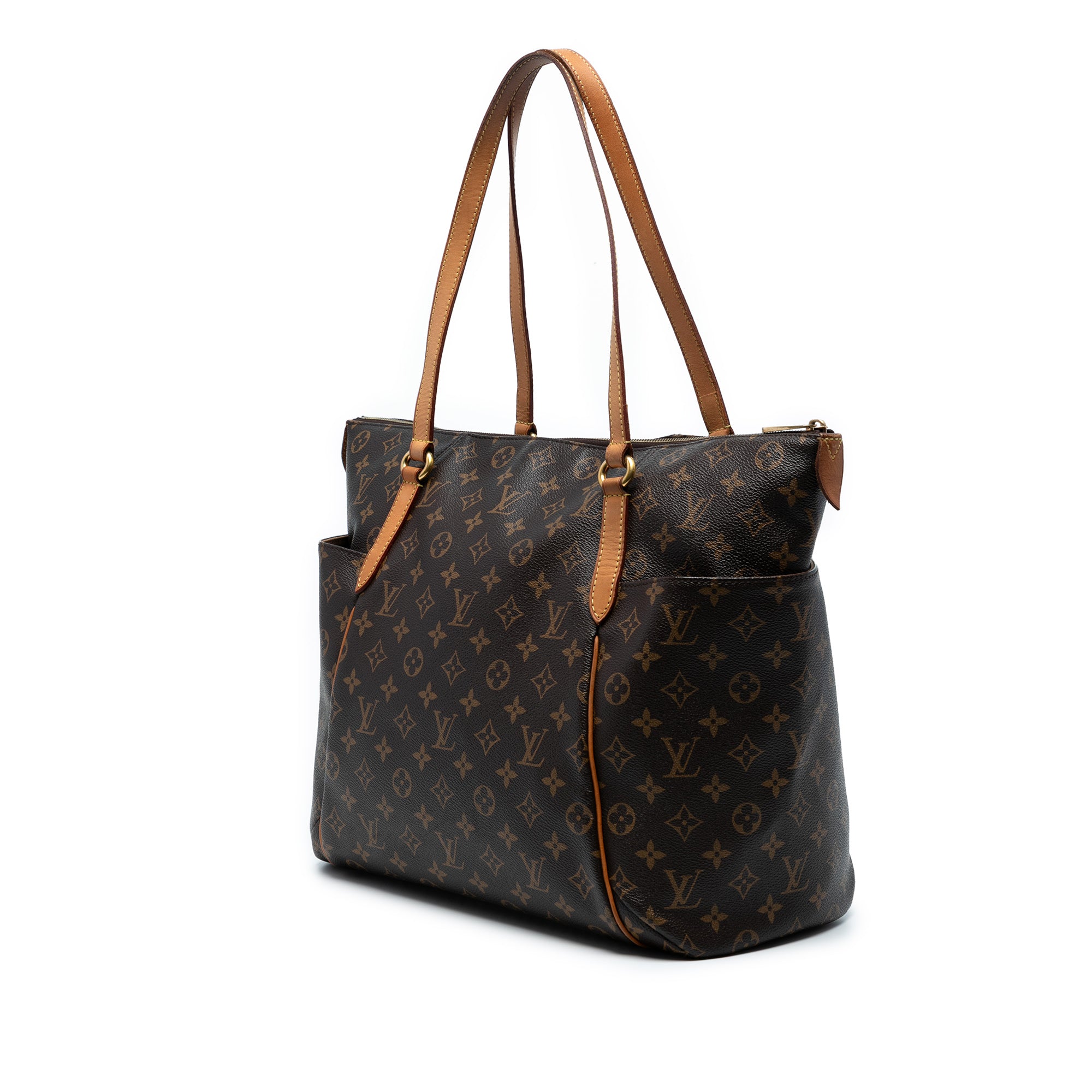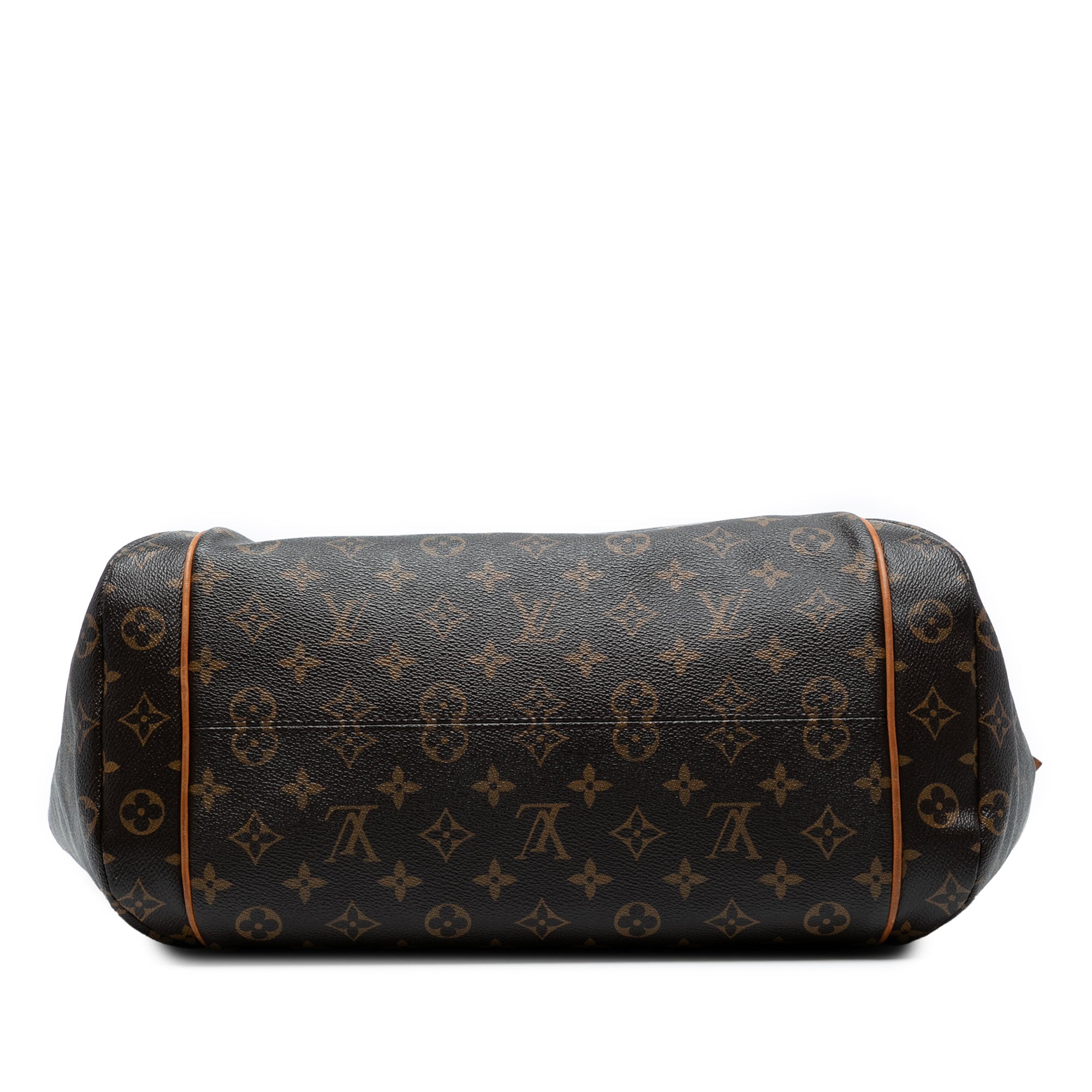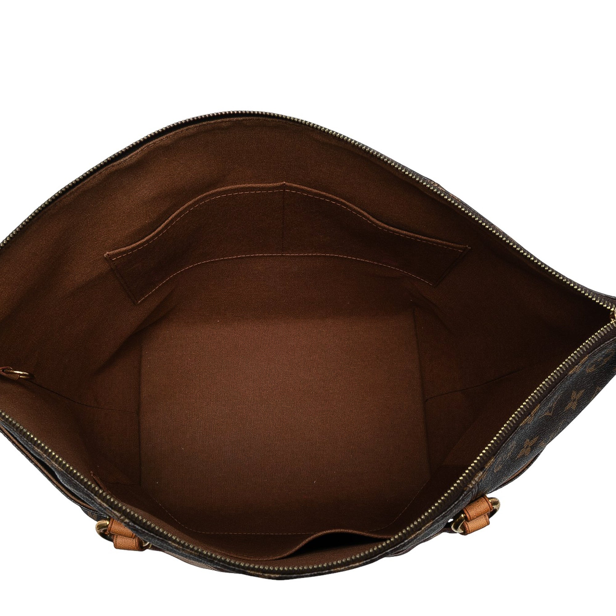 The Totally MM features a monogram canvas body, flat vachetta leather straps, a top zip closure, exterior side open pockets, and interior slip pockets. Retail Price: 1350.00