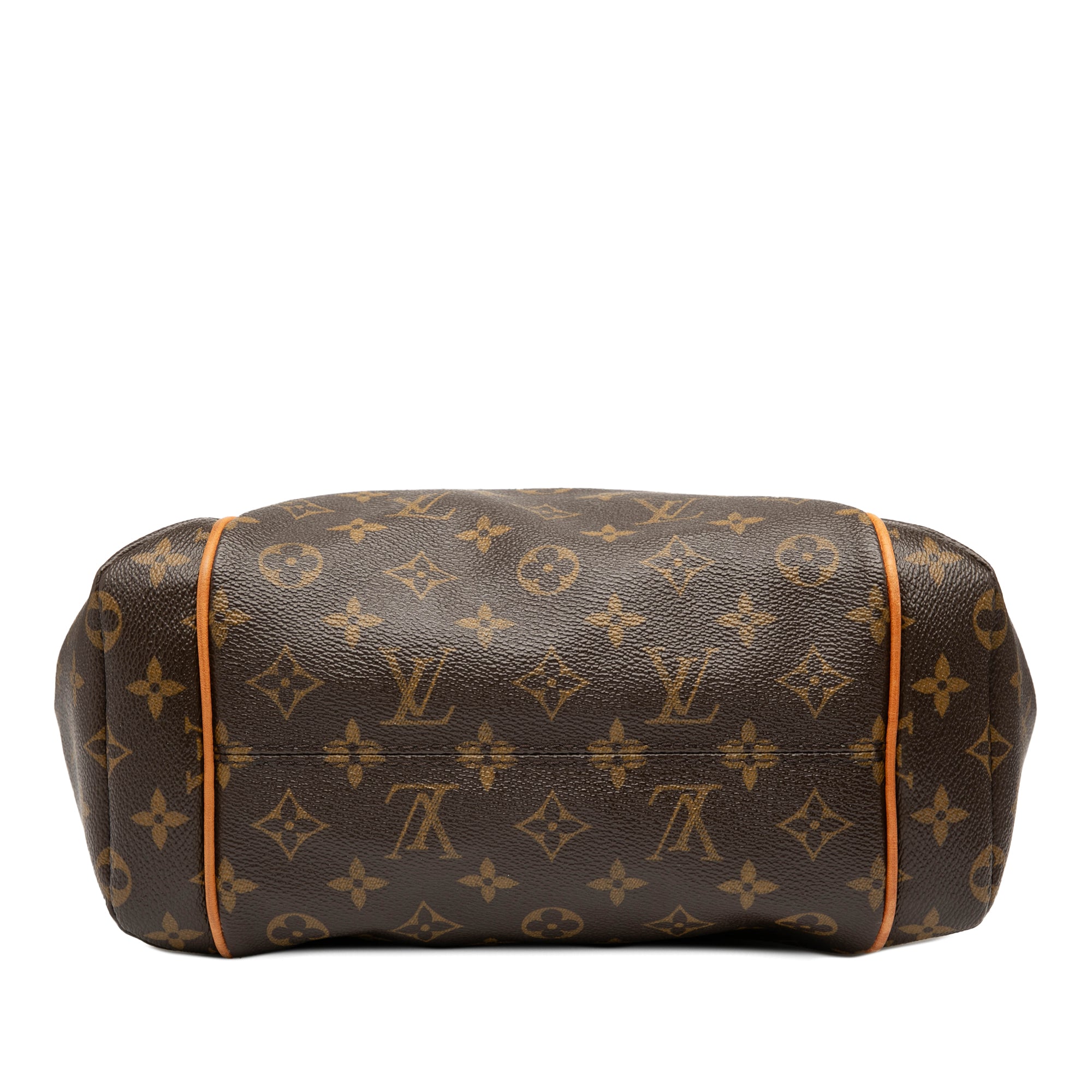 The Totally PM features a monogram canvas body with vachetta leather trim, flat vachetta leather shoulder straps, a top zip closure, exterior side slip pockets, and interior slip pockets. Retail Price: 1415.00