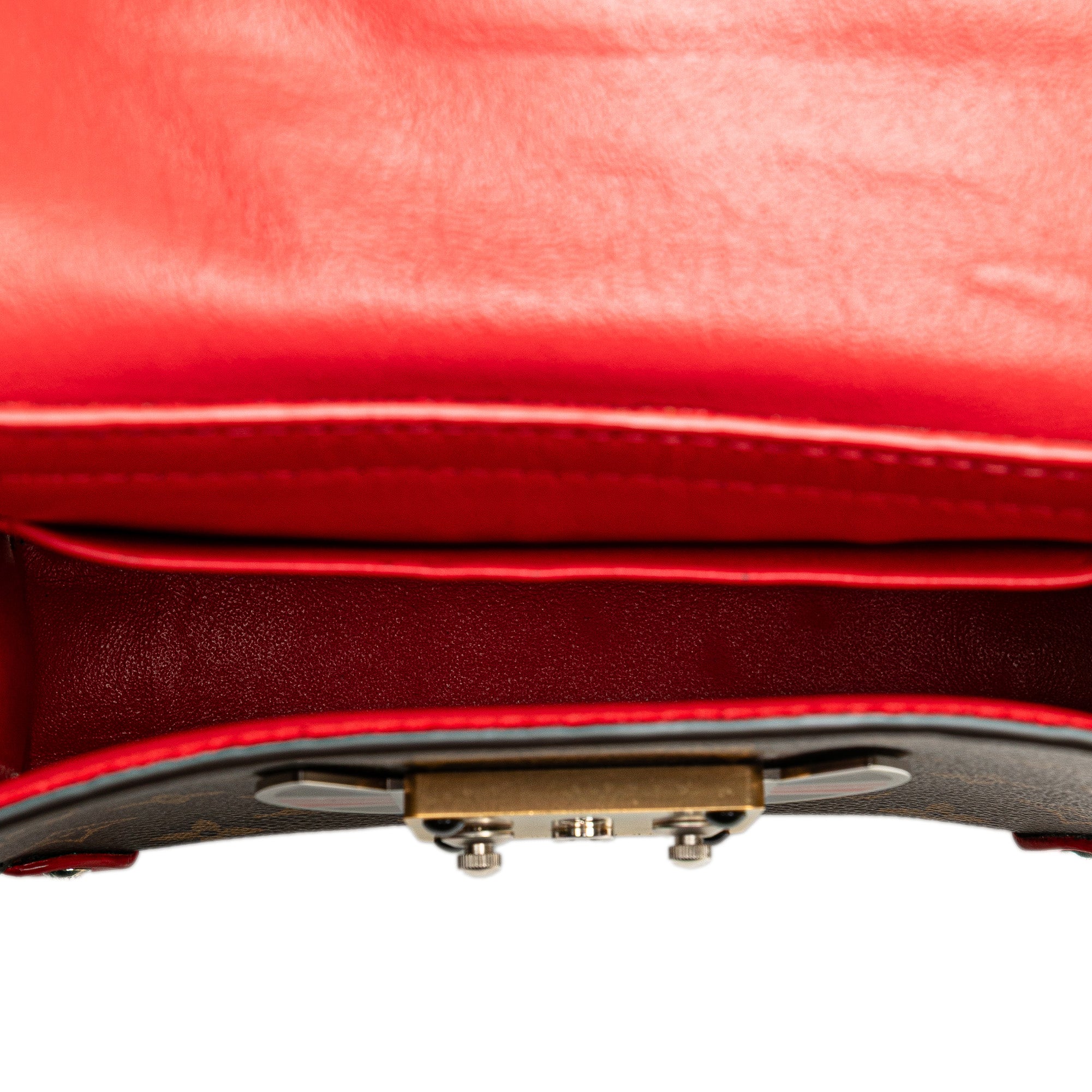 The Tribal Mask Pochette PM features monogram canvas body, a chain with a leather shoulder guard, a front flap with push-lock closure, an exterior back slip pocket, and an interior slip pocket. Inclusion: Dust bag. Retail Price: 1225.00
