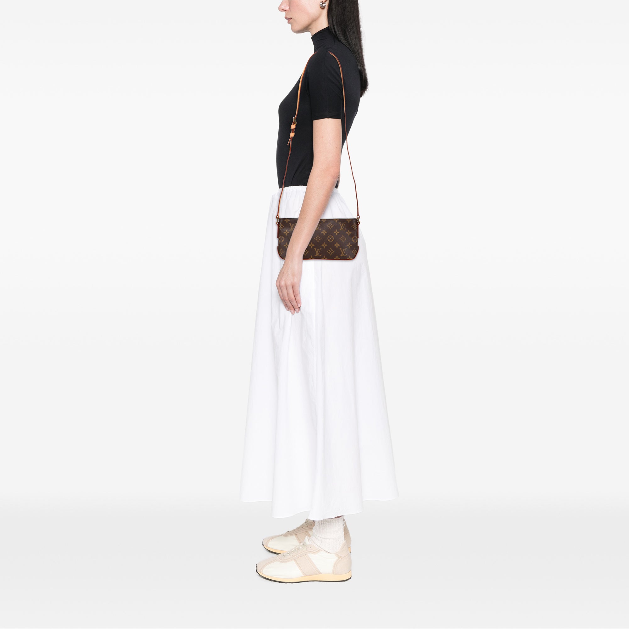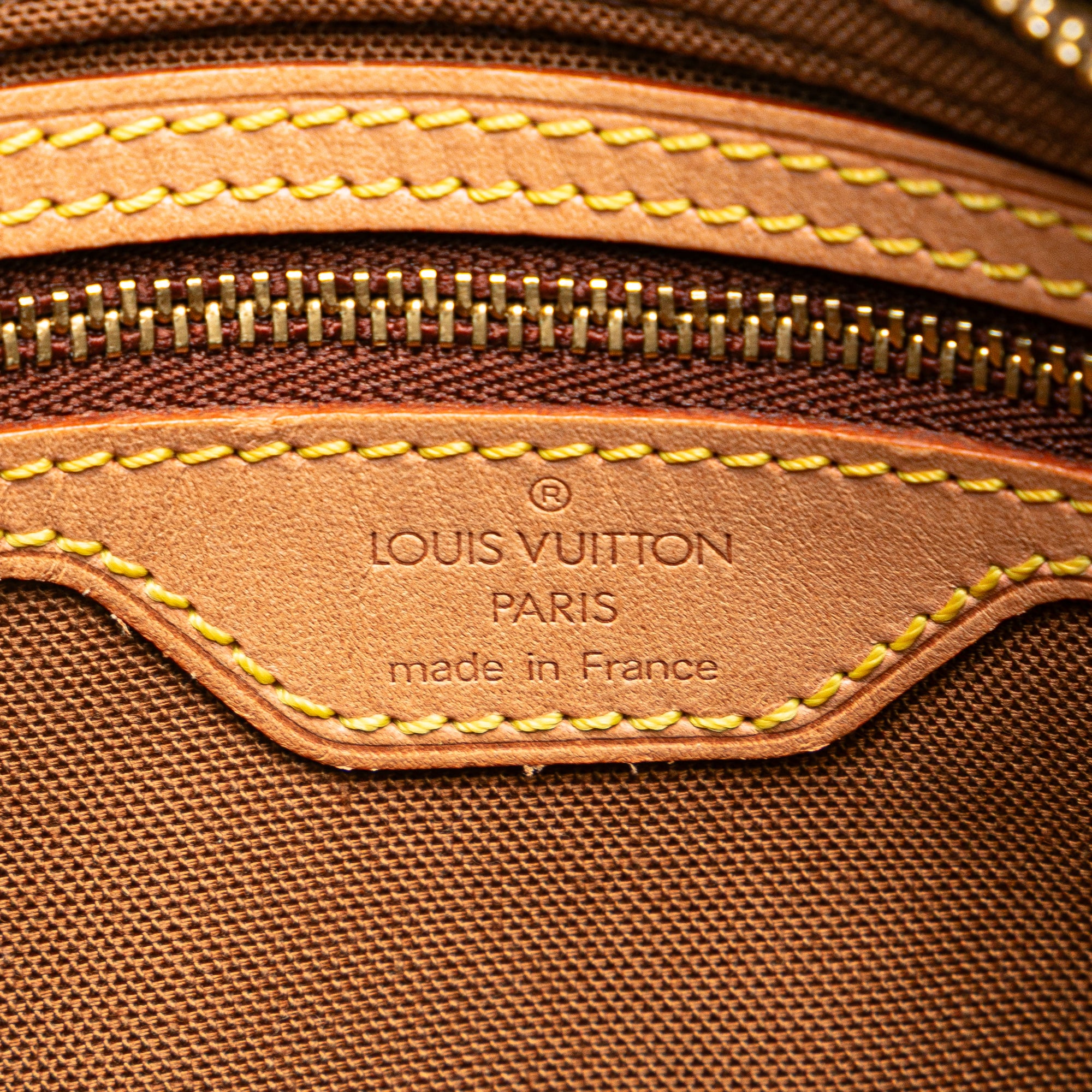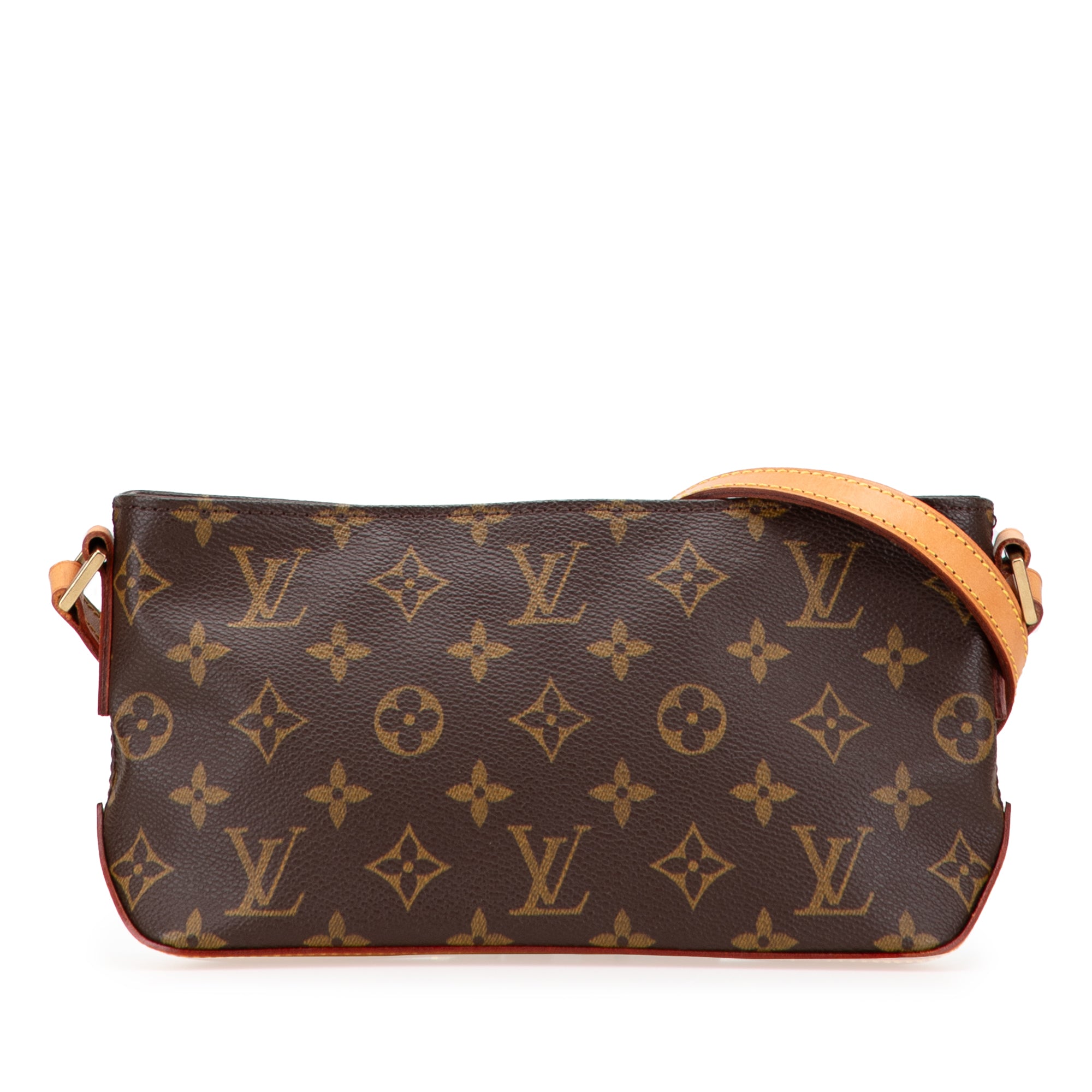 The Trotteur features a monogram canvas body, a flat vachetta strap, a top zip closure, and an interior zip pocket. Retail Price: 1040.00