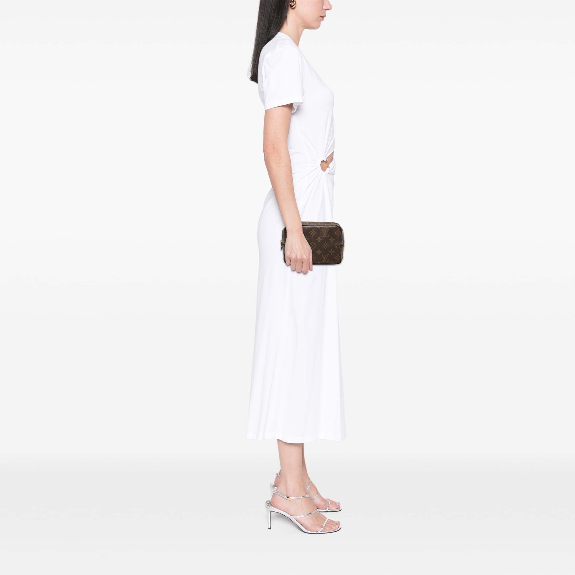 The Trousse Toilette features a monogram canvas body, a top zip closure, and interior slip pockets. Retail Price: 1000.00