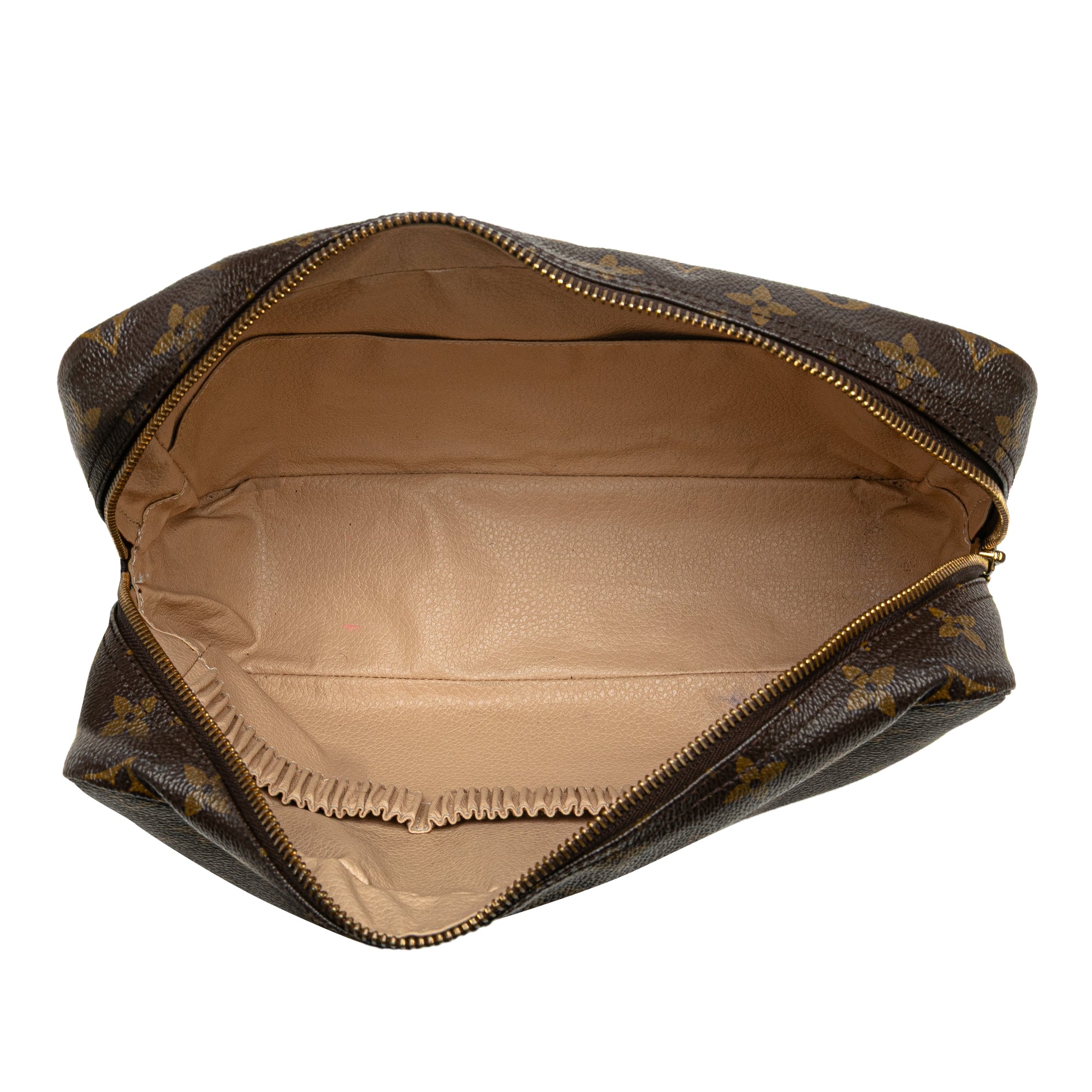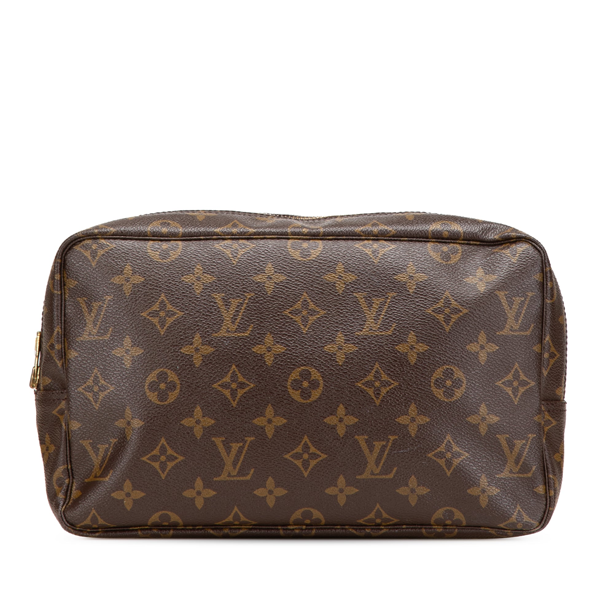 The Trousse Toilette 28 features a monogram canvas body, a top zip closure, and an interior slip pocket. Retail Price: 700.00