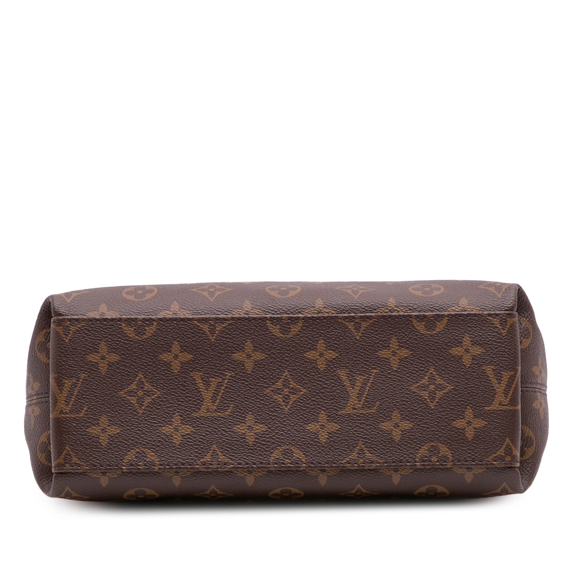 The Tuileries Besace features a monogram canvas body with leather trim, a flat leather handle, a detachable flat leather strap, an open top with magnetic snap closure, an exterior front zip pocket, and interior slip pockets. Retail Price: 1900.00