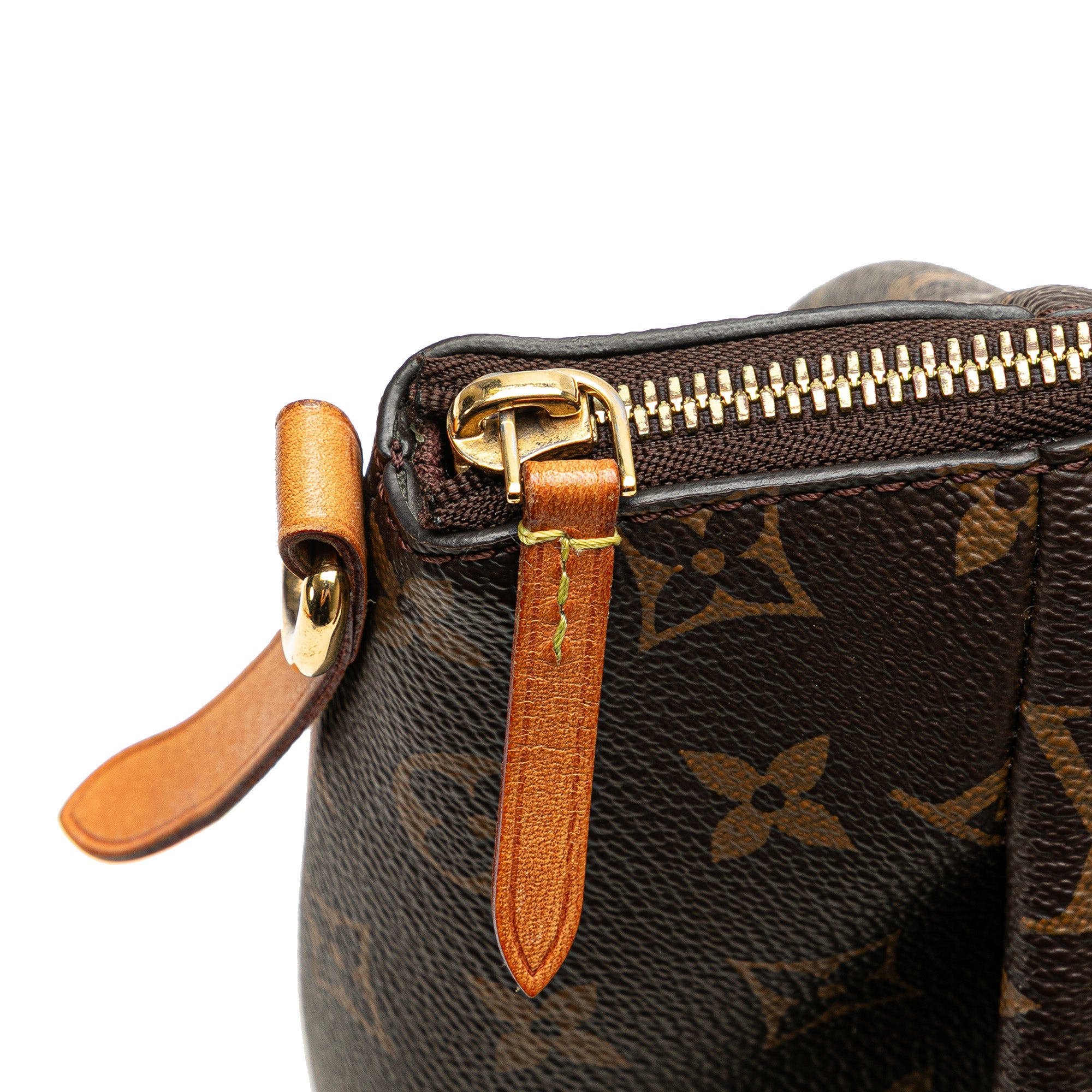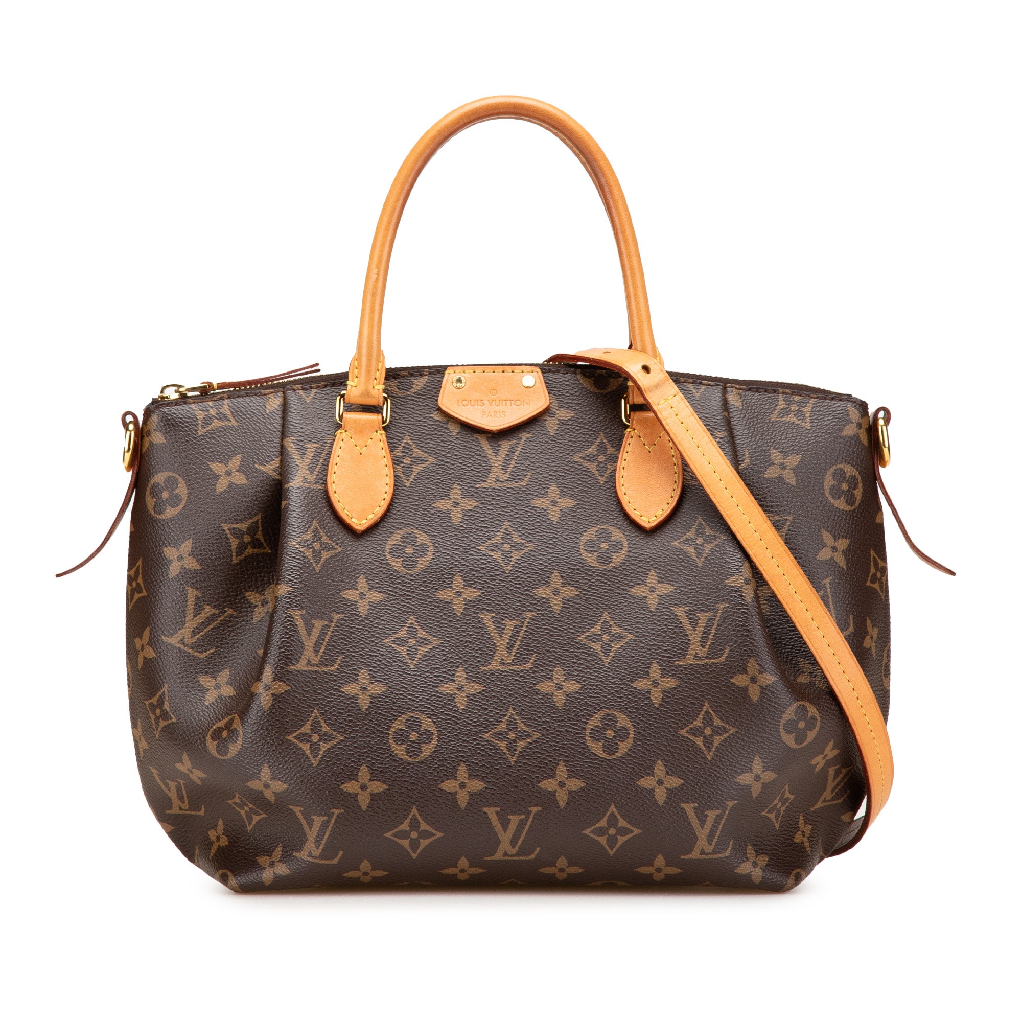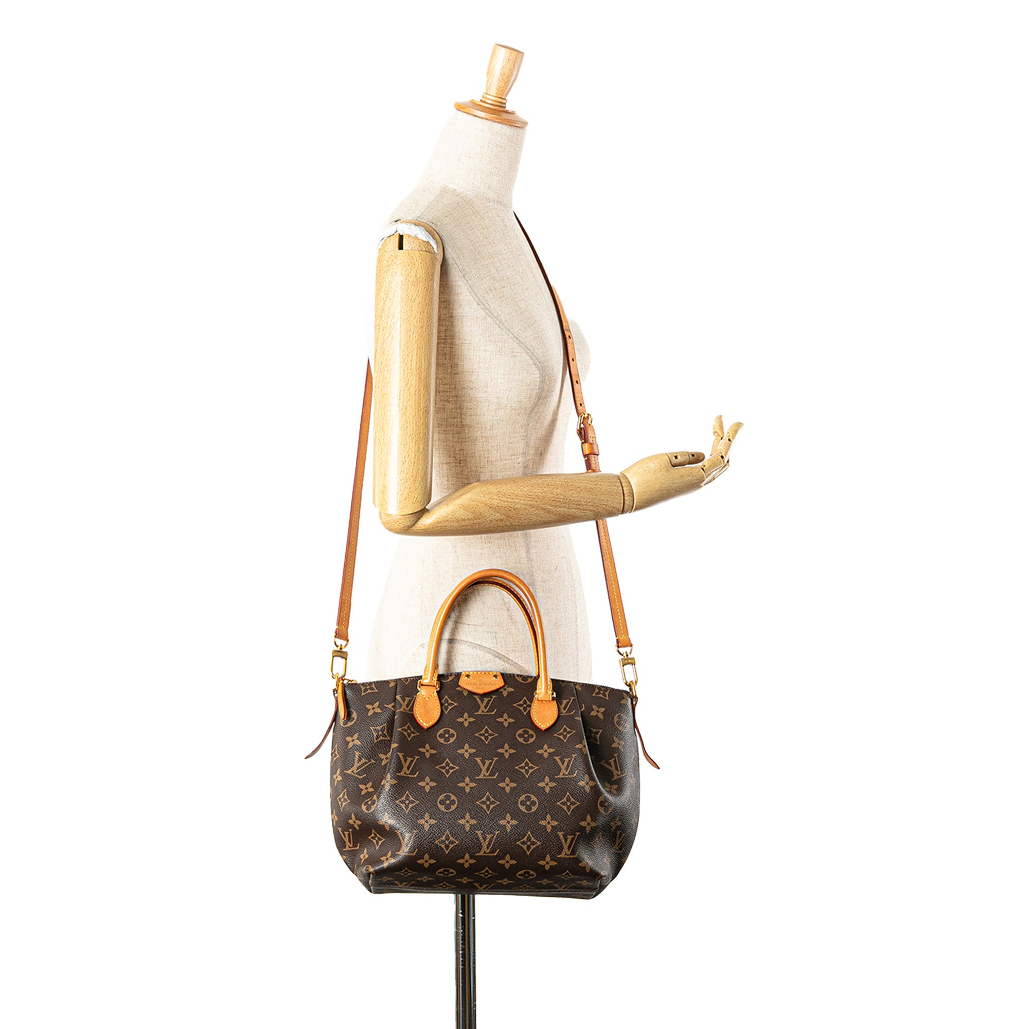 The Turenne PM features a monogram canvas body with vachetta leather trim, rolled vachetta leather handles, a detachable flat vachetta leather strap, a top zip closure, and interior slip pockets. Retail Price: 2350.00