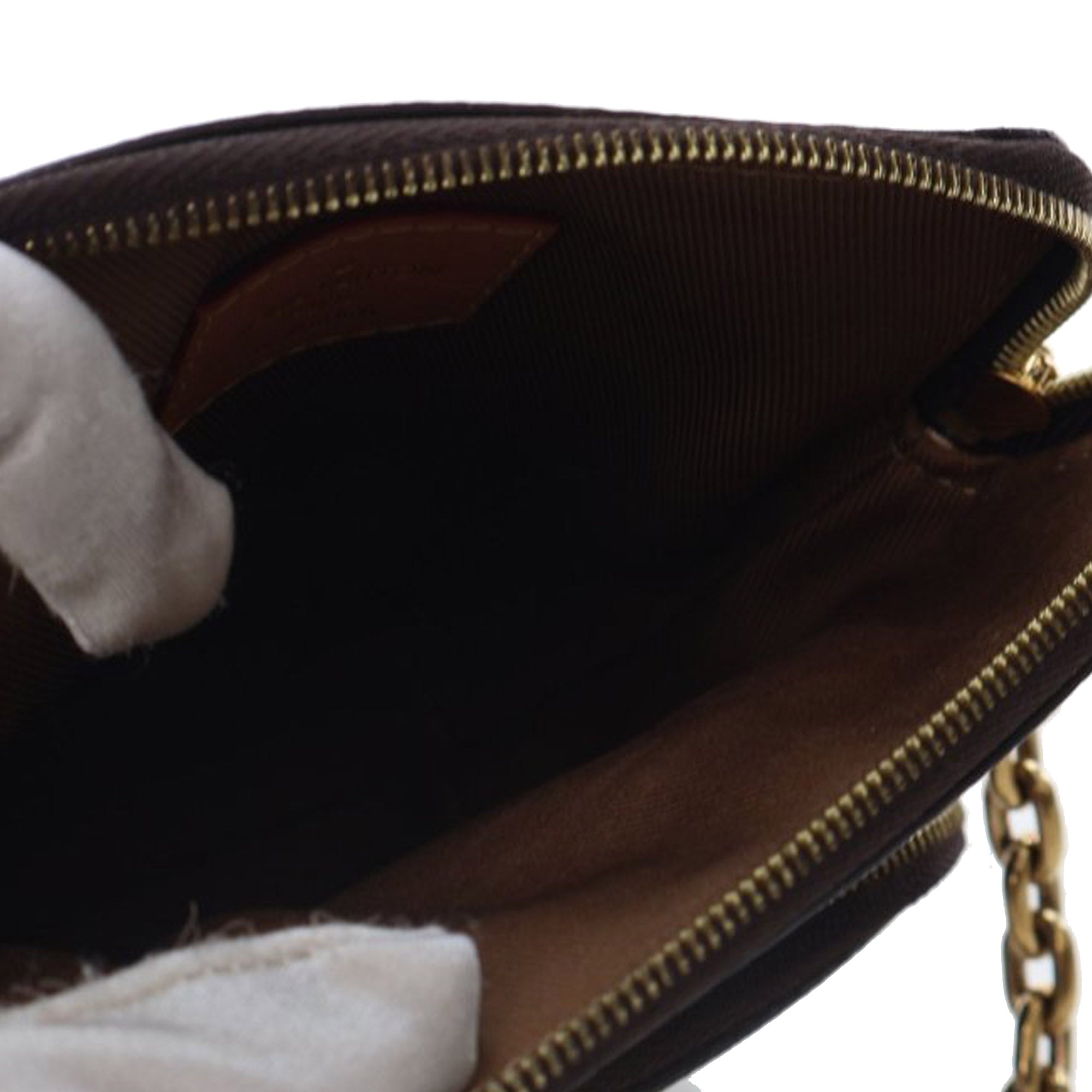 The Utility Phone Sleeve features a monogram canvas body, a detachable chain handle, an adjustable and detachable canvas strap, a top zip closure, and exterior front zip pockets. Retail Price: 2800.00