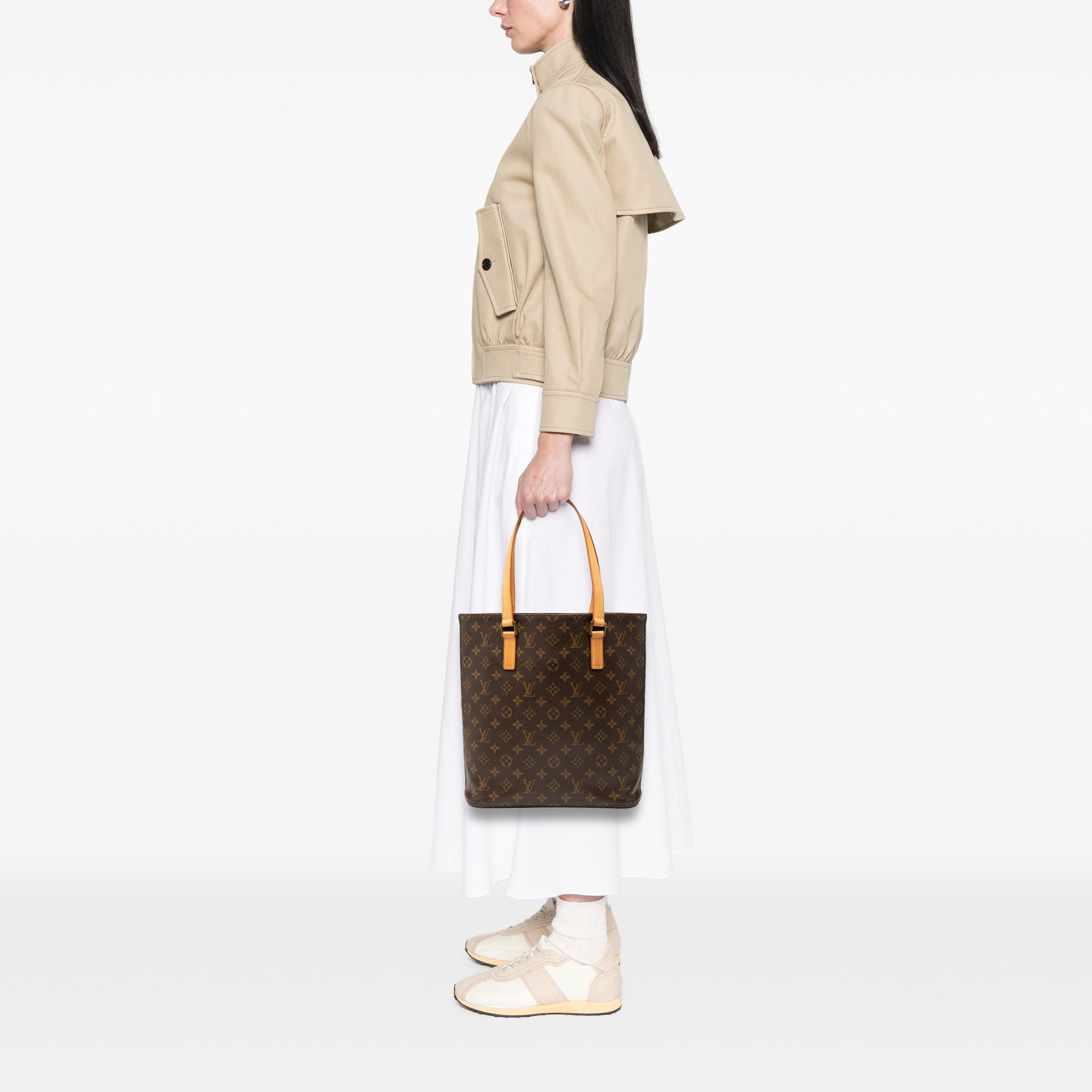 The Vavin GM features monogram canvas body, flat vachetta leather shoulder straps, an open top, and interior zip and slip pockets. Retail Price: 1450.00