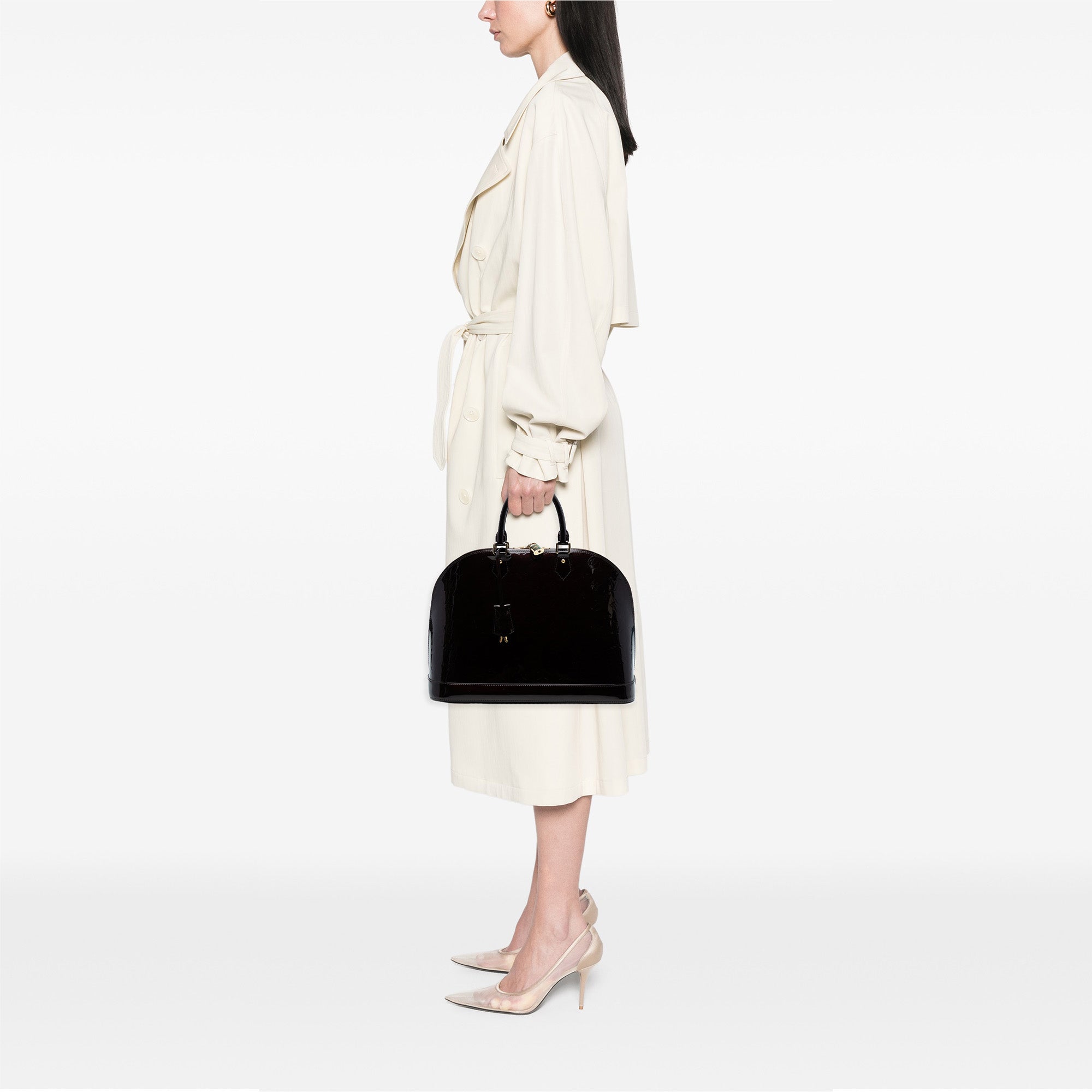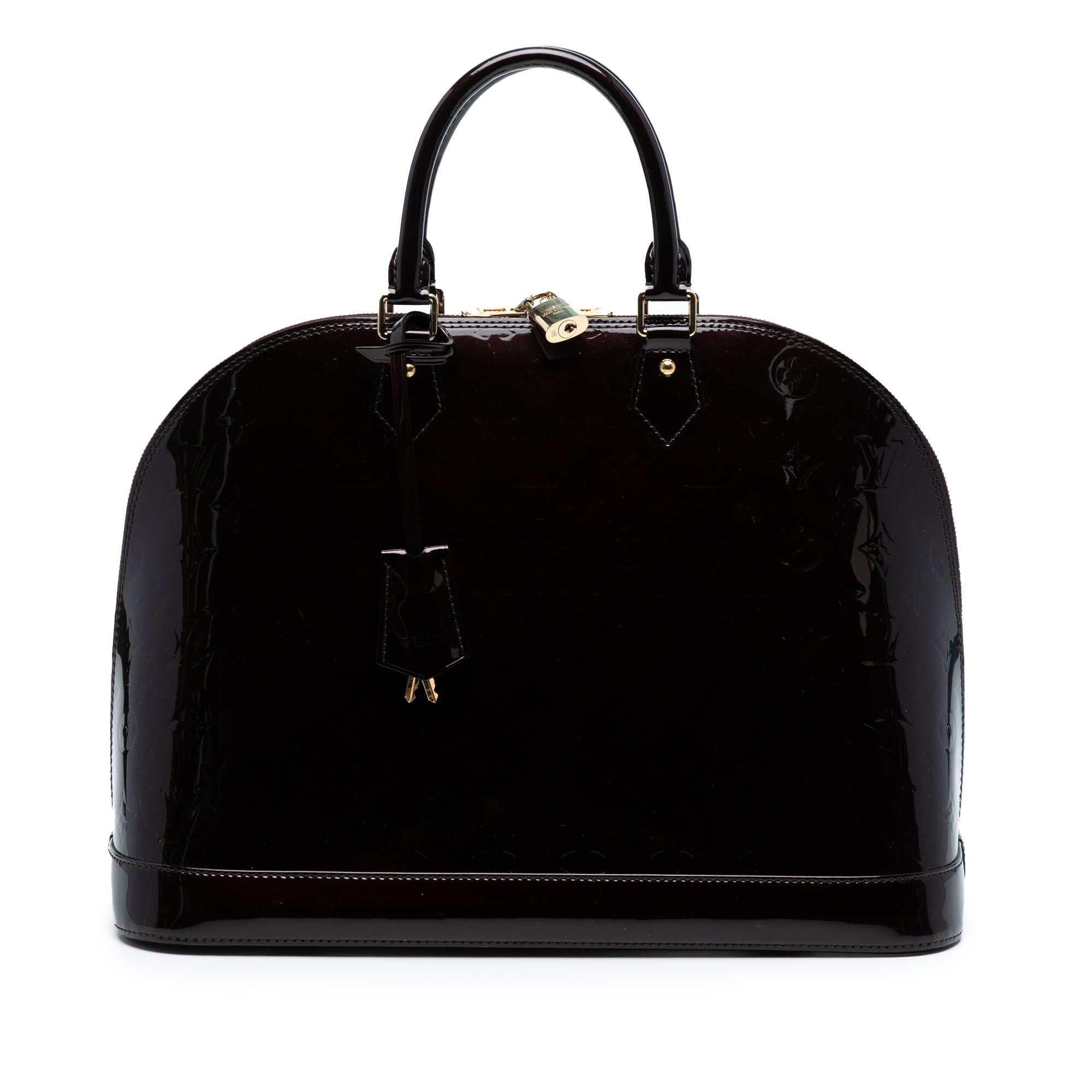 The Alma GM features a monogram vernis body, rolled leather handles, a clochette, gold-tone hardware, a top zip closure, and interior slip pockets. Retail Price: 2395.00