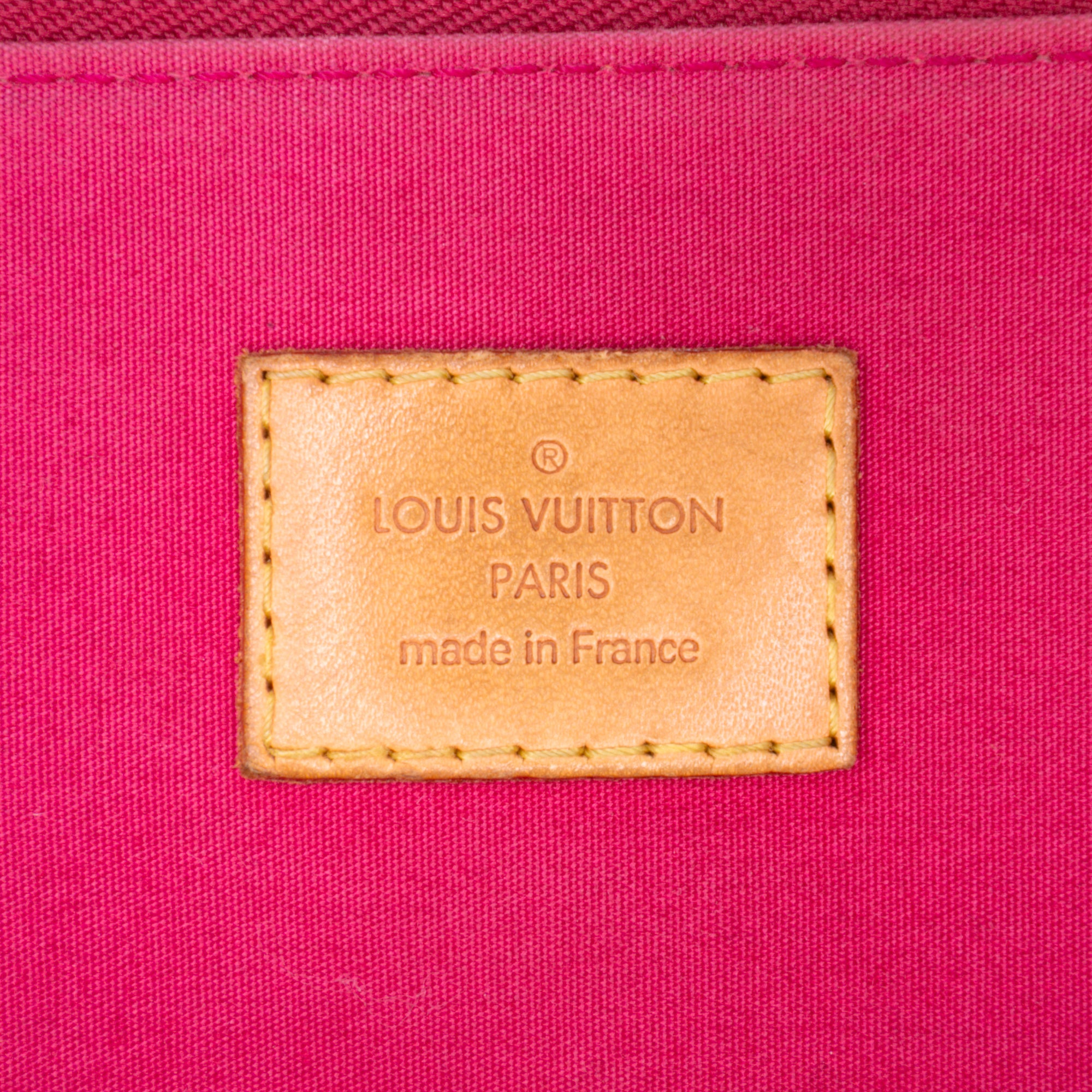 The Alma PM features a monogram vernis leather body, a clochette, rolled leather handles, a top zip closure, and interior slip pockets. Retail Price: 2350.00