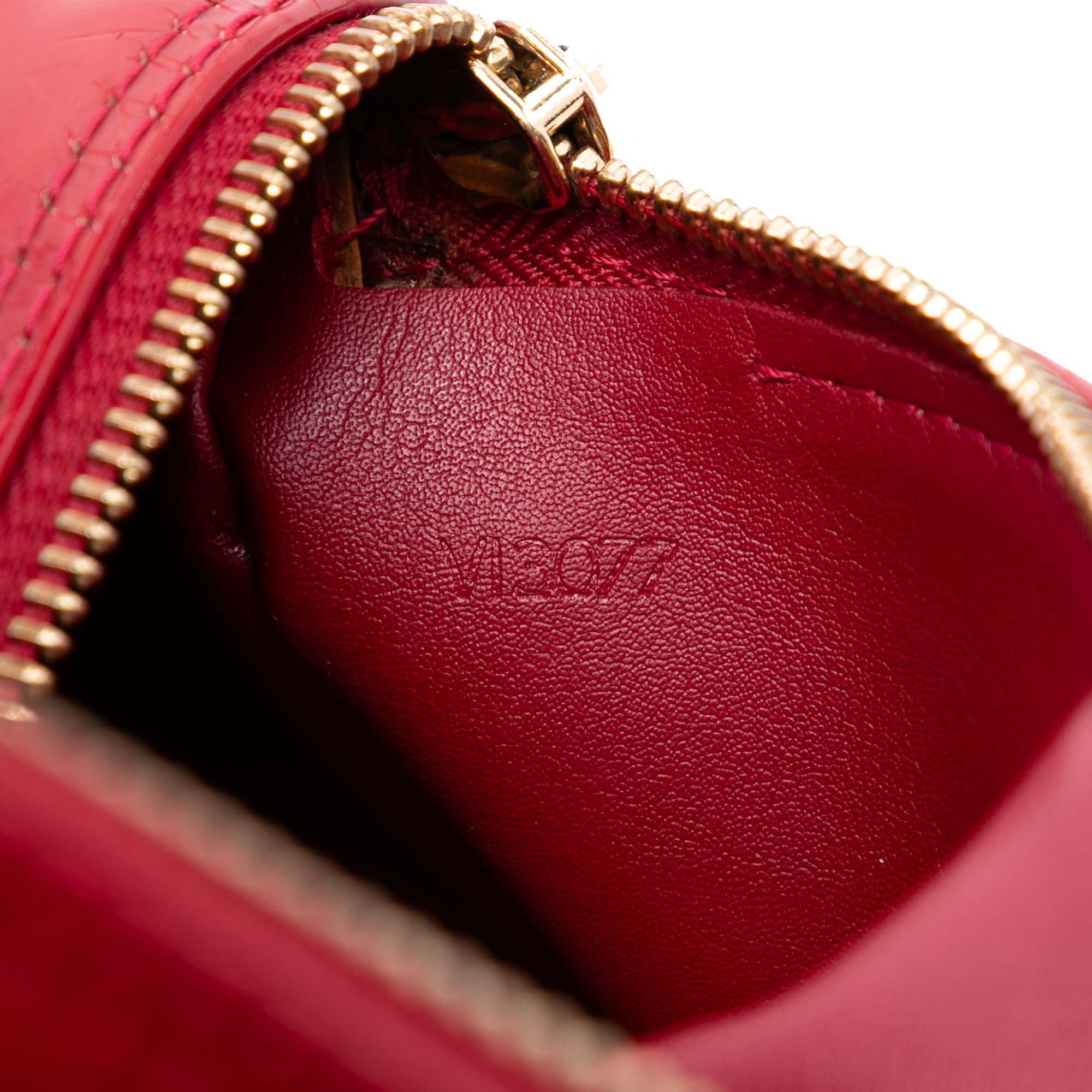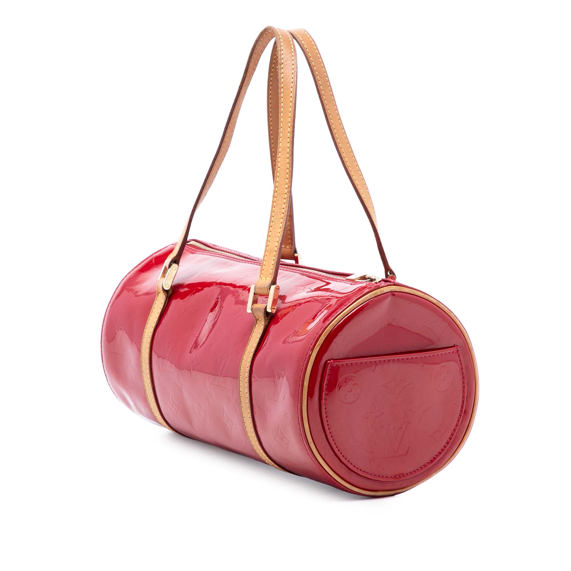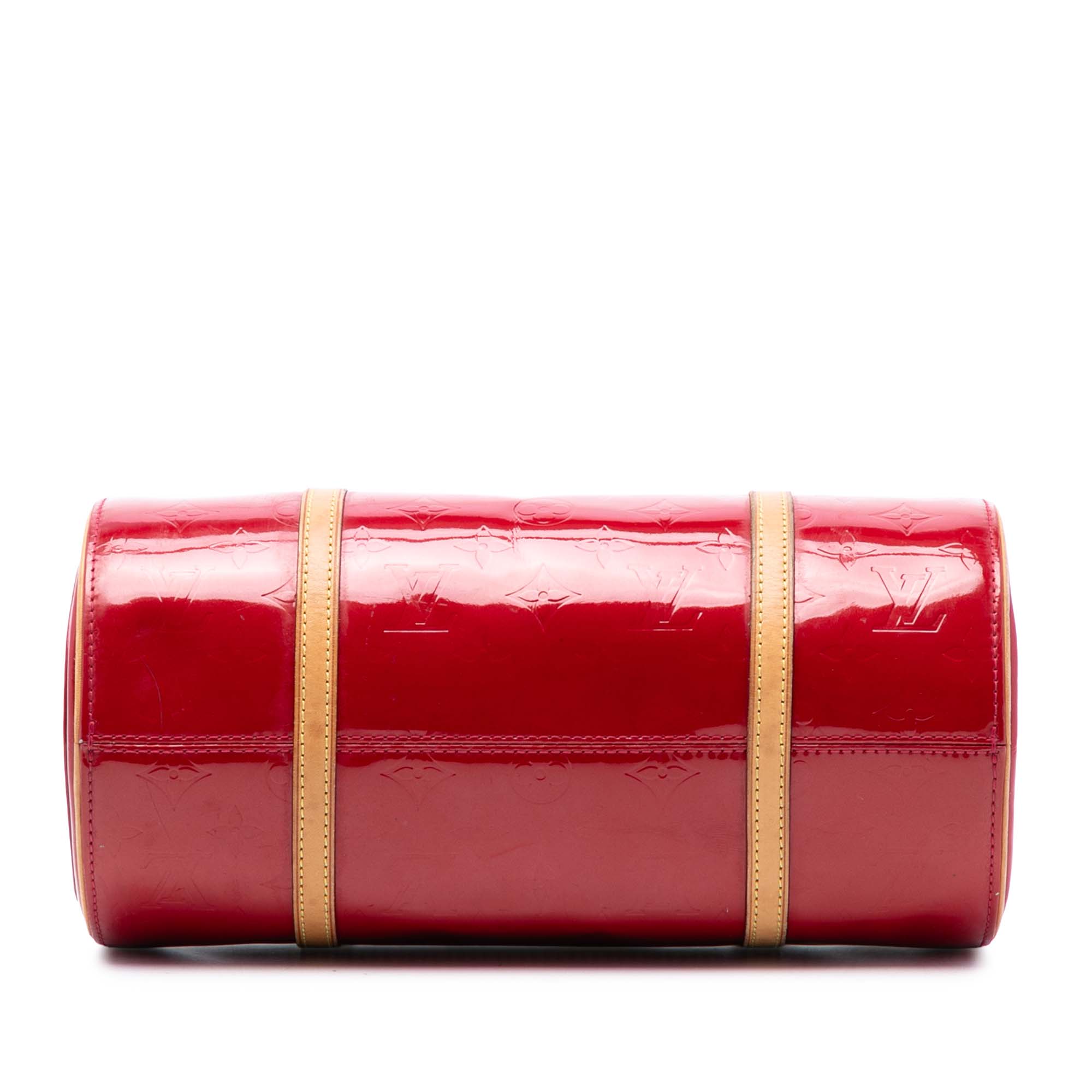 The Bedford features a monogram vernis leather body with vachetta leather trim, flat vachetta leather handles, a top zip closure, and an exterior side slip pocket. Retail Price: 990.00