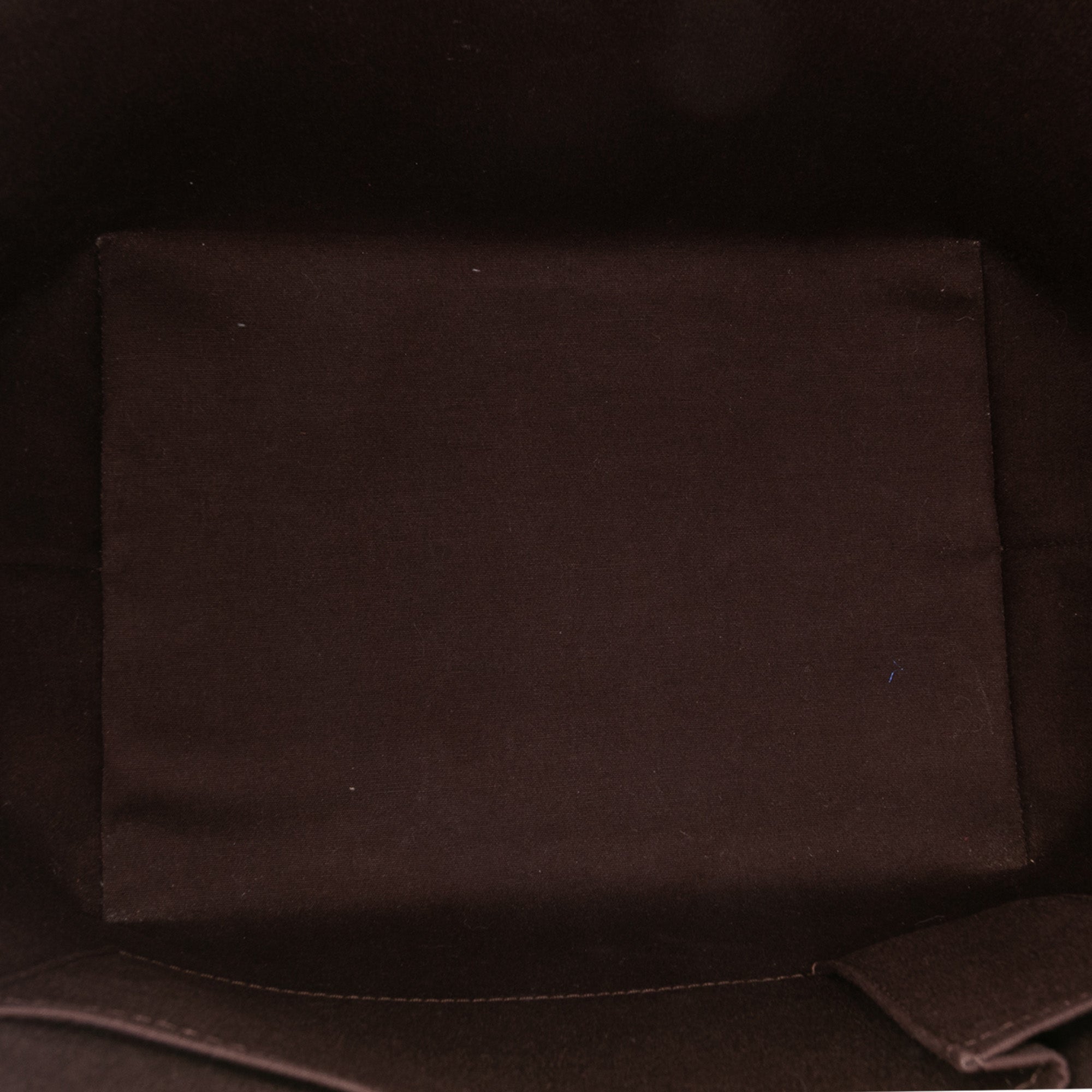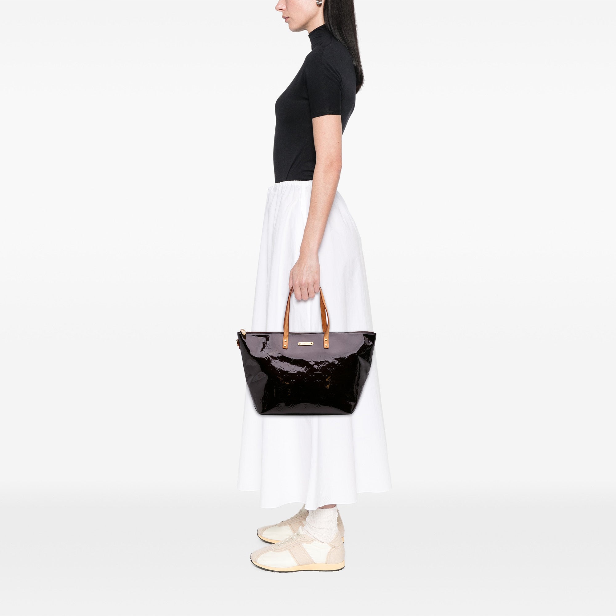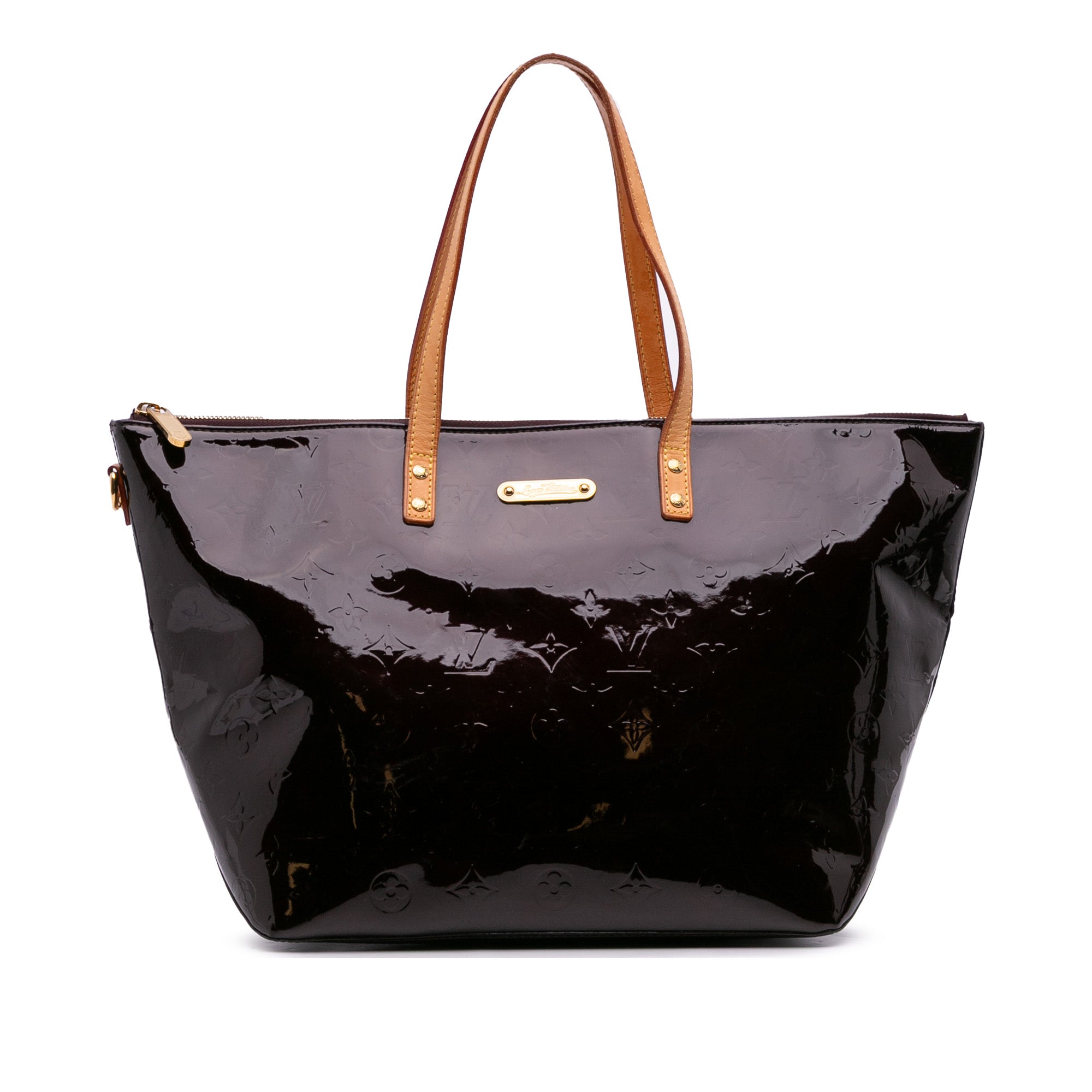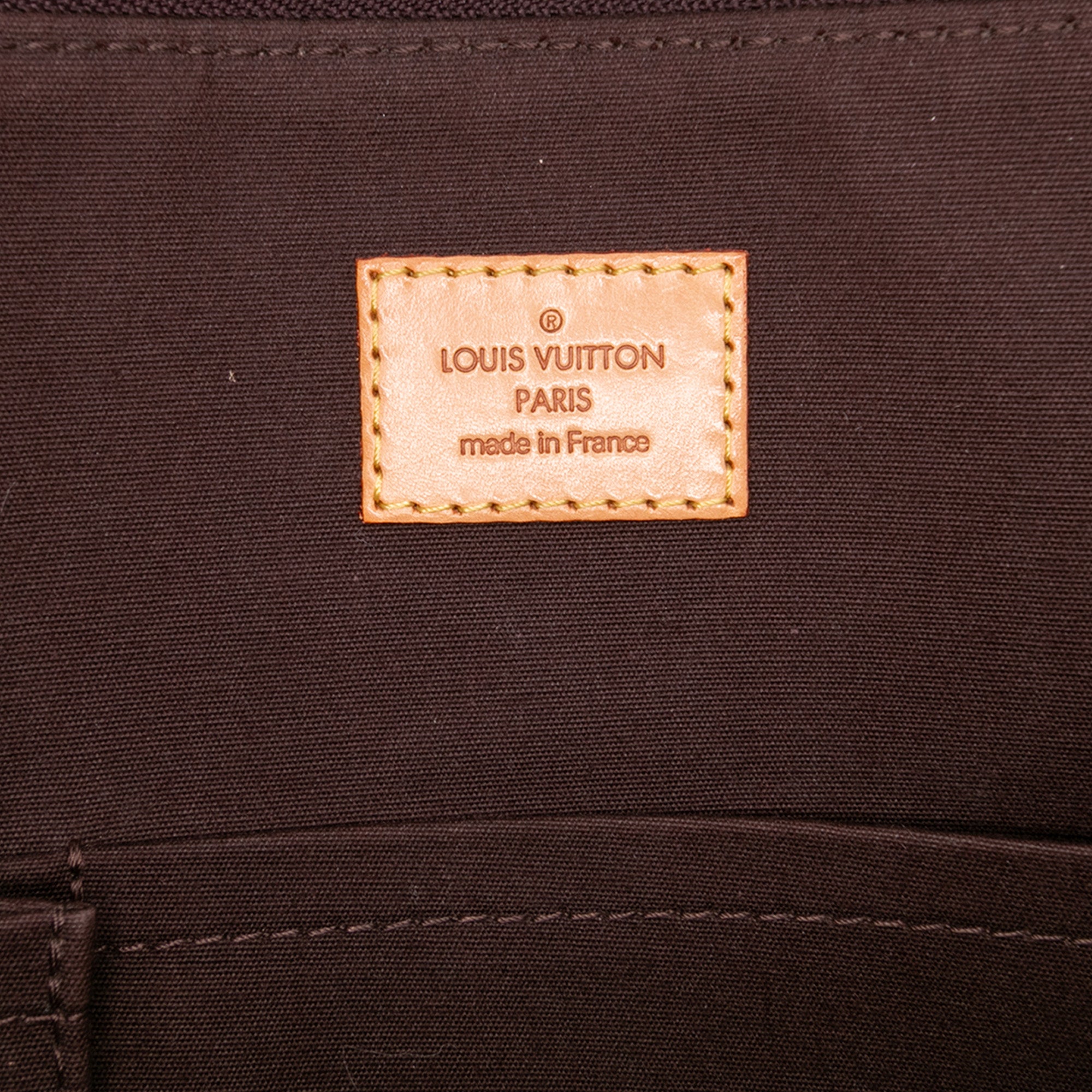 The Bellevue GM features a monogram vernis leather body, flat vachetta leather shoulder straps, a top zip closure, and interior slip pockets. Retail Price: 800.00