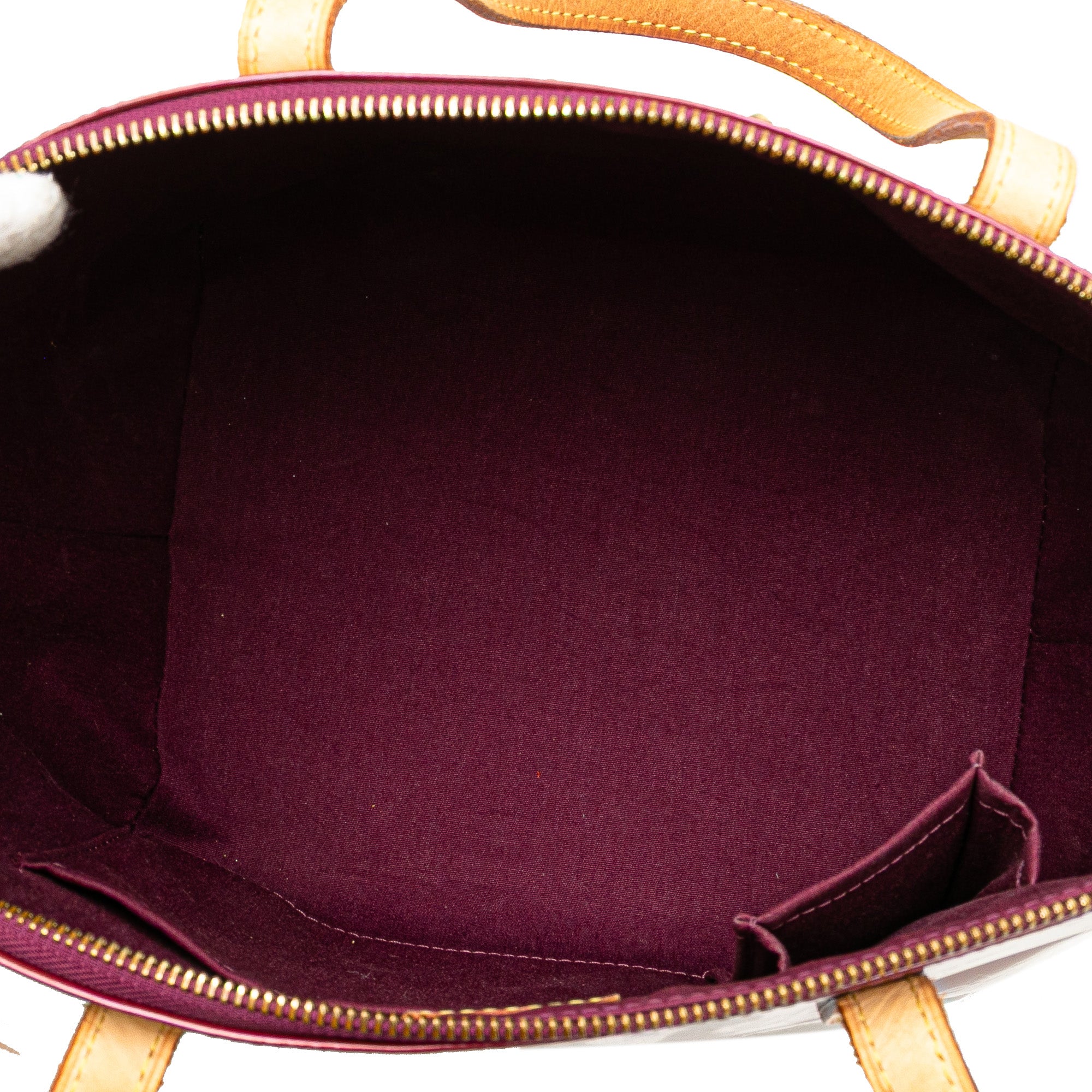 The Bellevue PM features a monogram vernis leather body, flat vachetta leather handles, a top zip closure, and interior slip pockets Retail Price: 1130.00