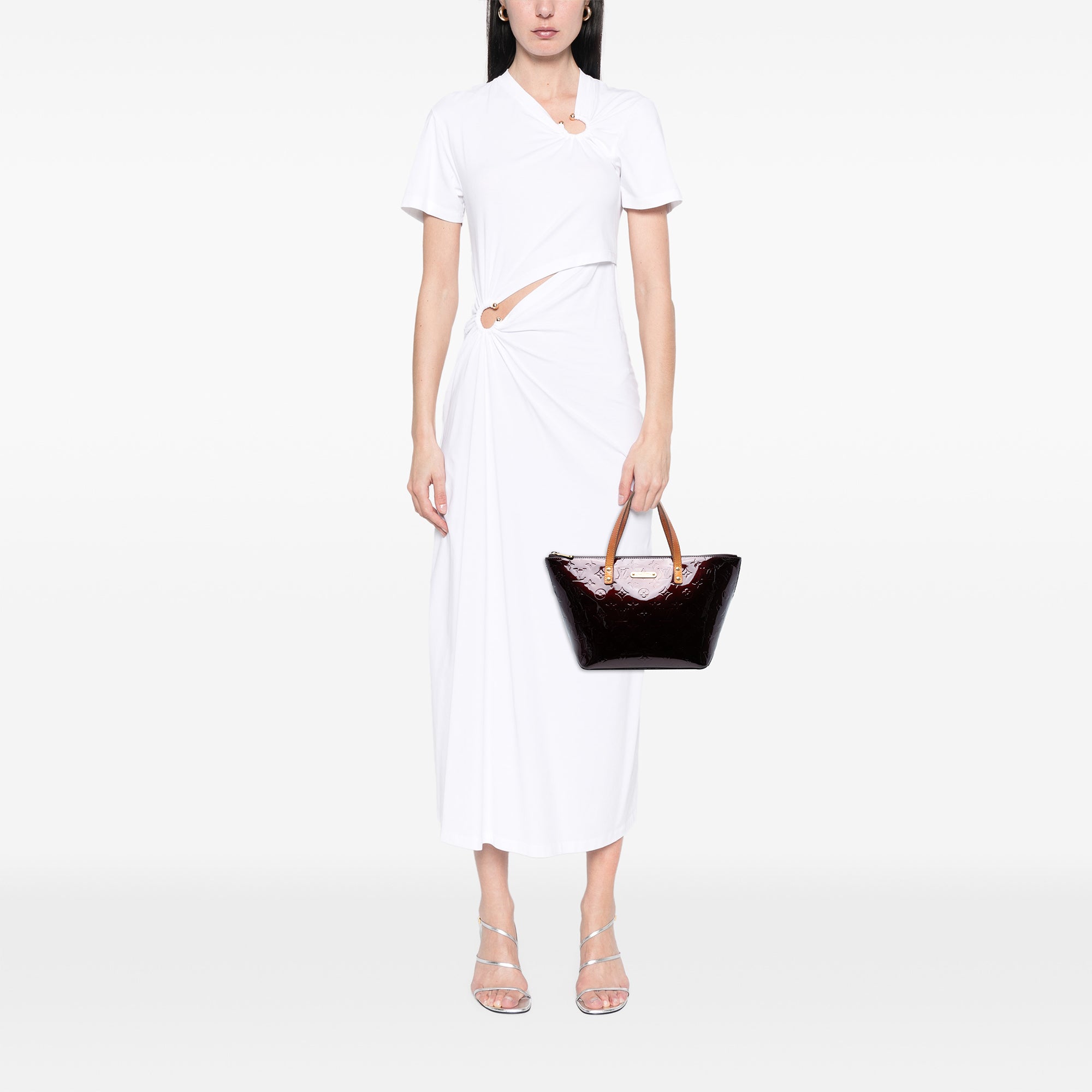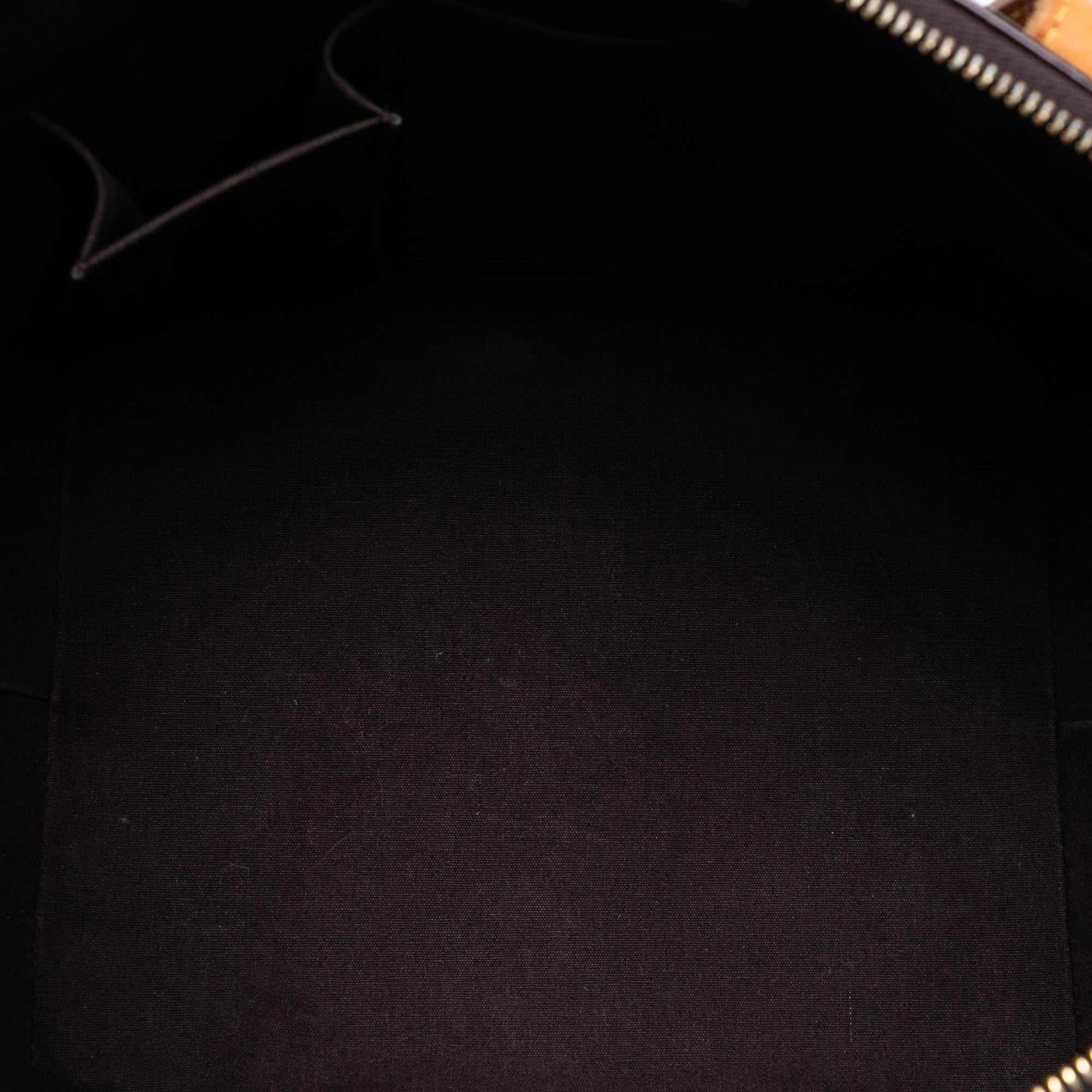 The Bellevue PM features a monogram vernis leather body, flat vachetta leather handles, a top zip closure, and interior slip pockets. Retail Price: 1130.00