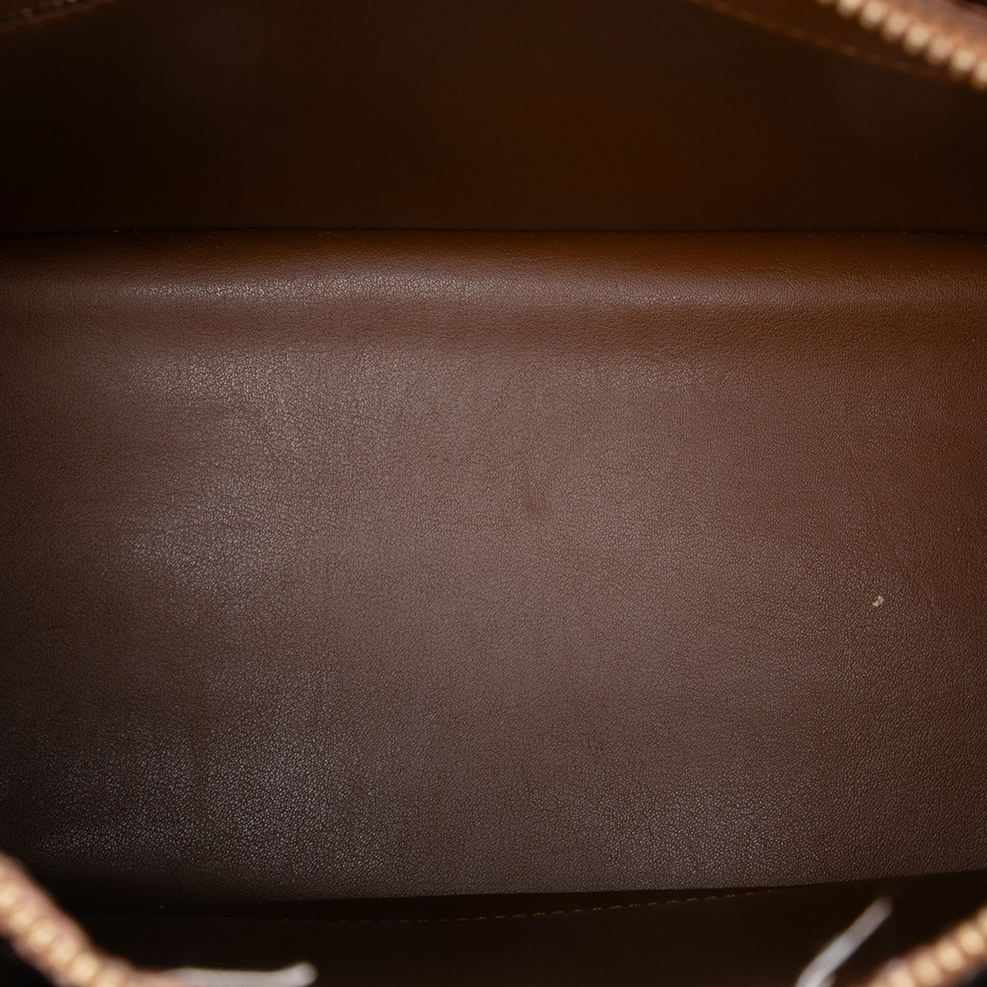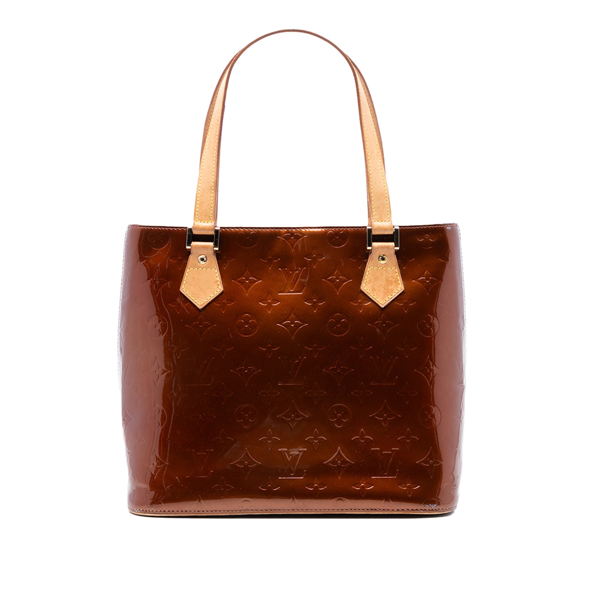 The Houston features a monogram vernis leather body, flat vachetta leather straps, a top zip closure, and interior zip and slip pockets. Retail Price: 1440.00