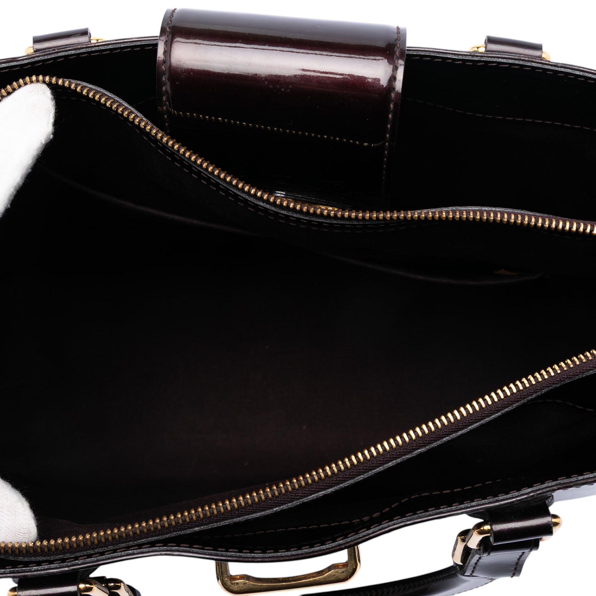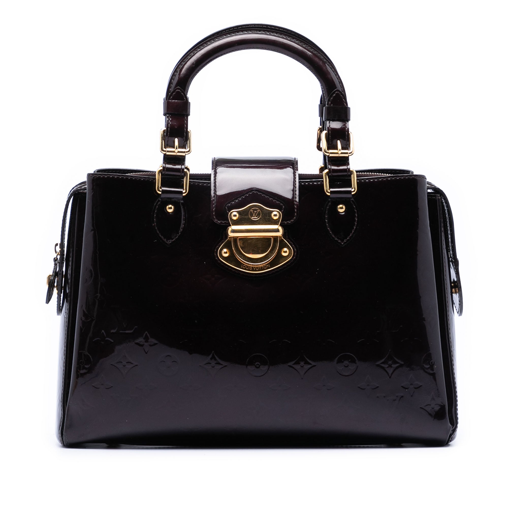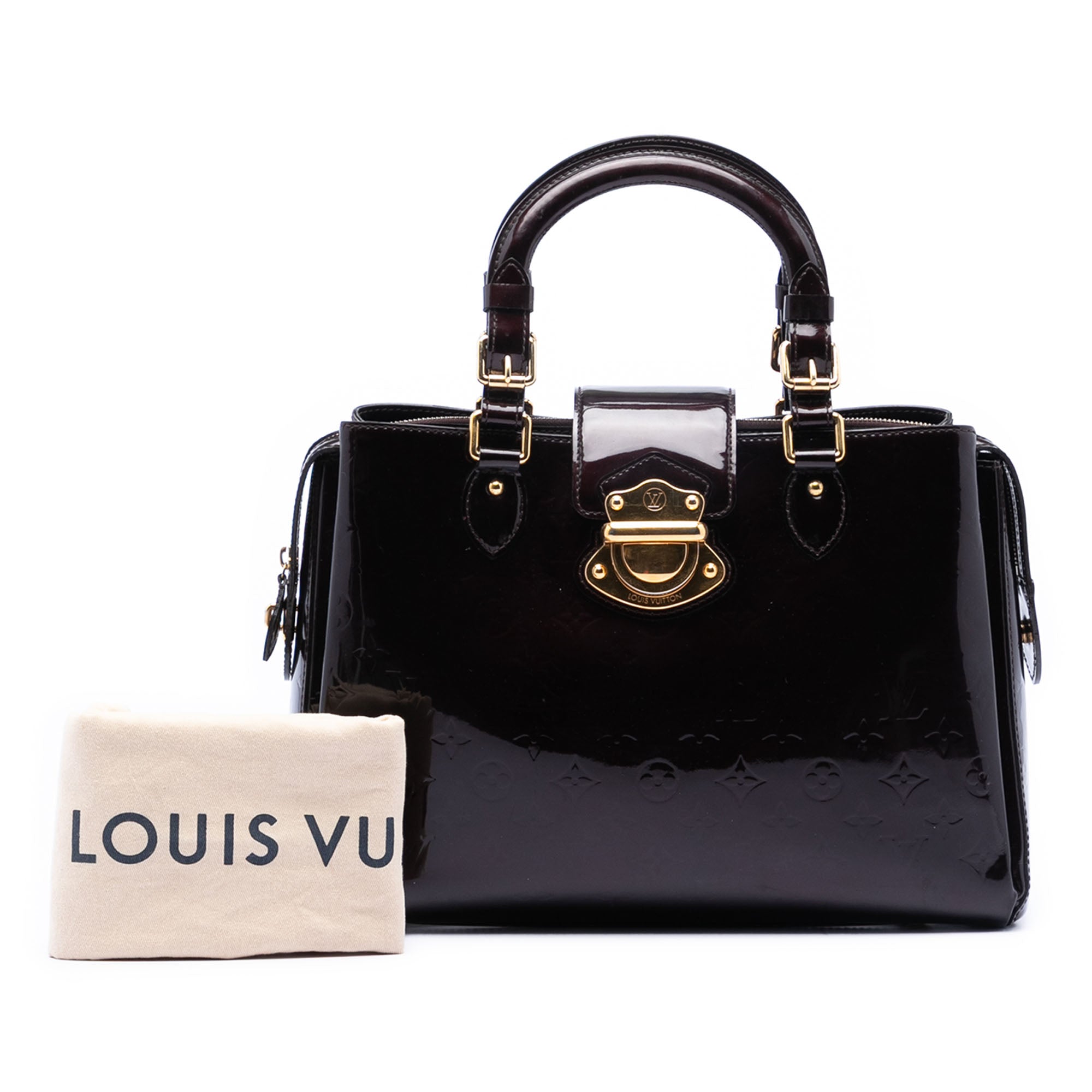 The Melrose Avenue features a monogram vernis leather body, rolled leather handles, front strap with push lock closure, top zip closure, and interior open pockets. Inclusion: Dust bag. Retail Price: 3550.00