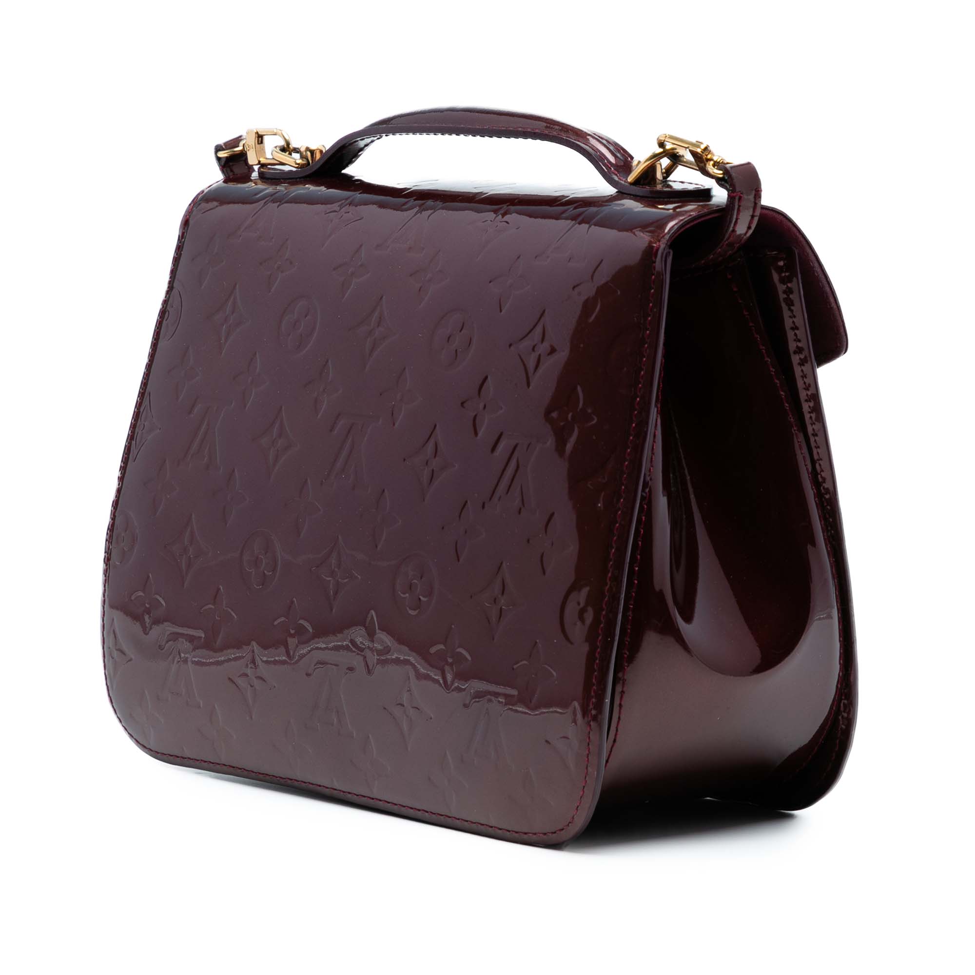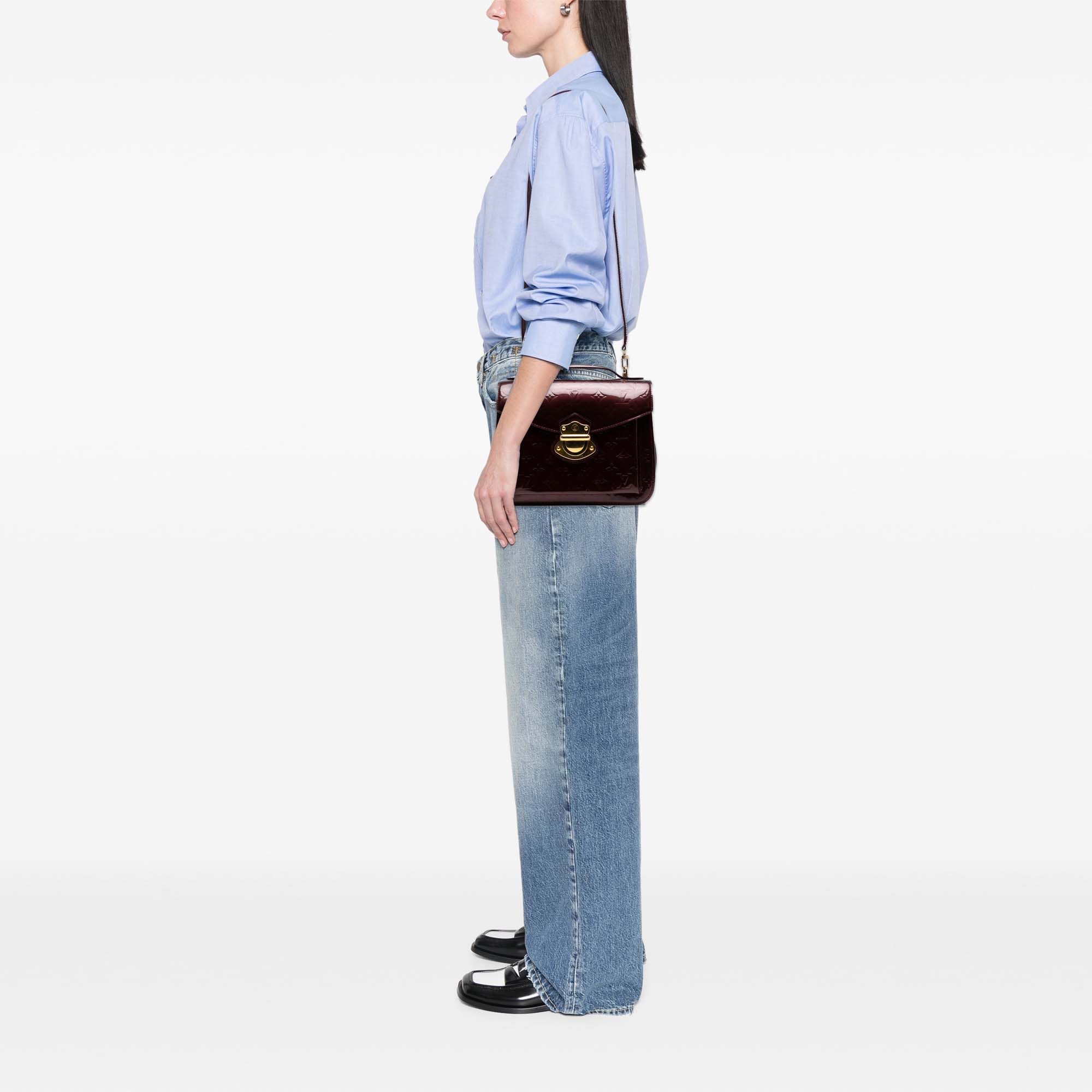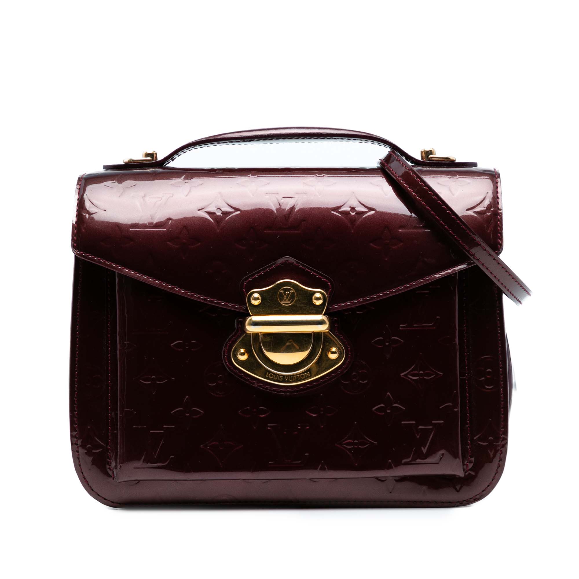 The Mirada features a monogram vernis leather body, a flat top handle, a detachable strap, a front flap with push lock closure, and an interior slip pocket. Retail Price: 2810.00