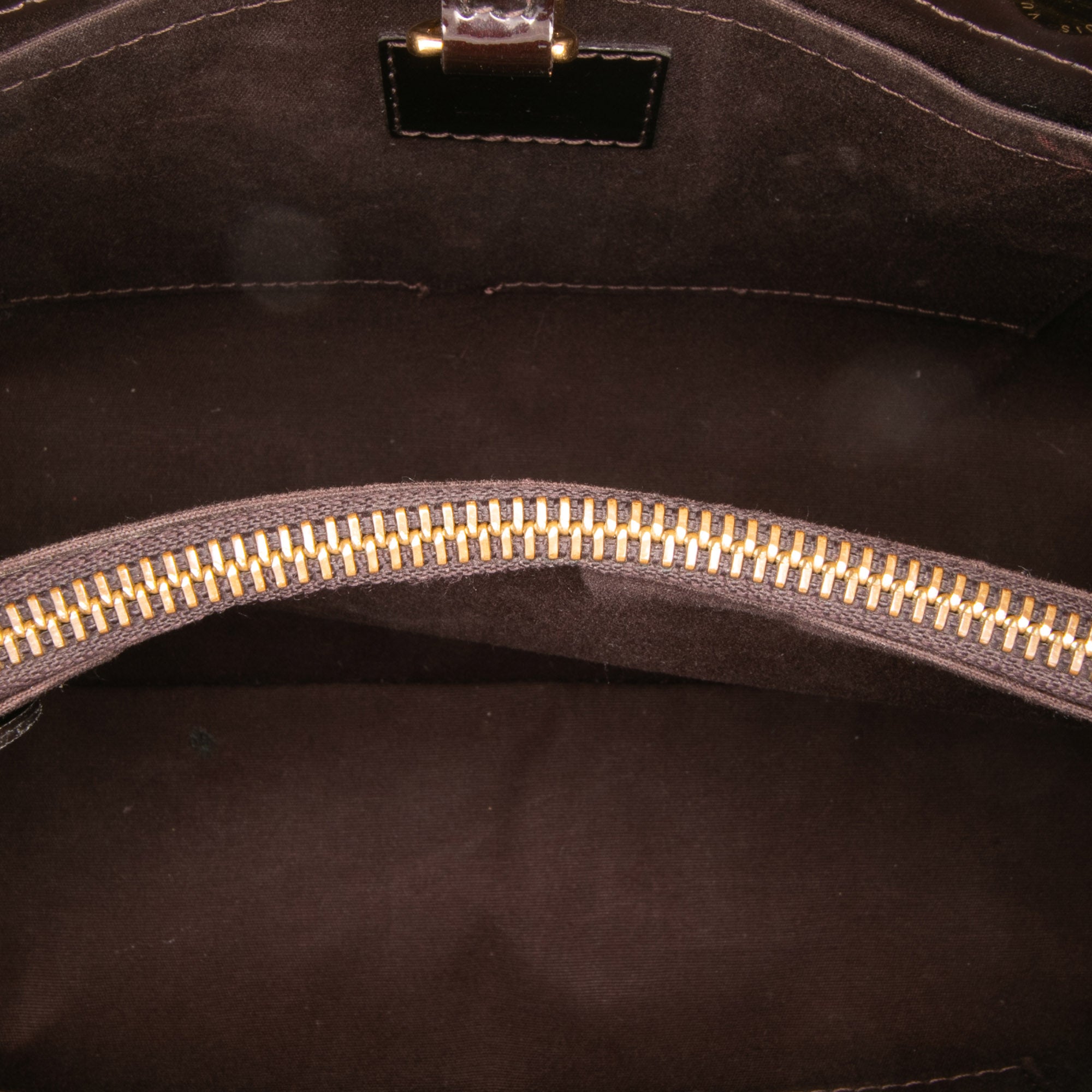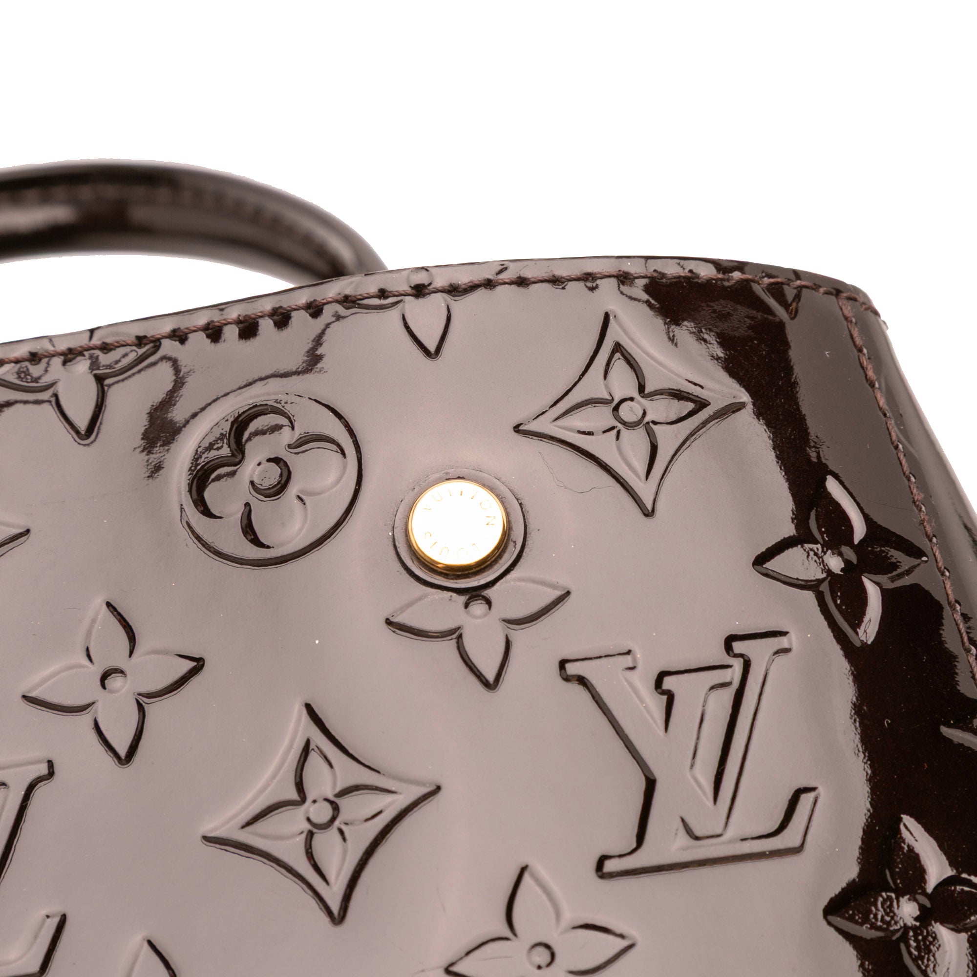 The Montaigne BB features a monogram vernis leather body, rolled leather handles, an open top with a clasp closure, a zip compartment, and interior slip and zip pockets. Retail Price: 2500.00