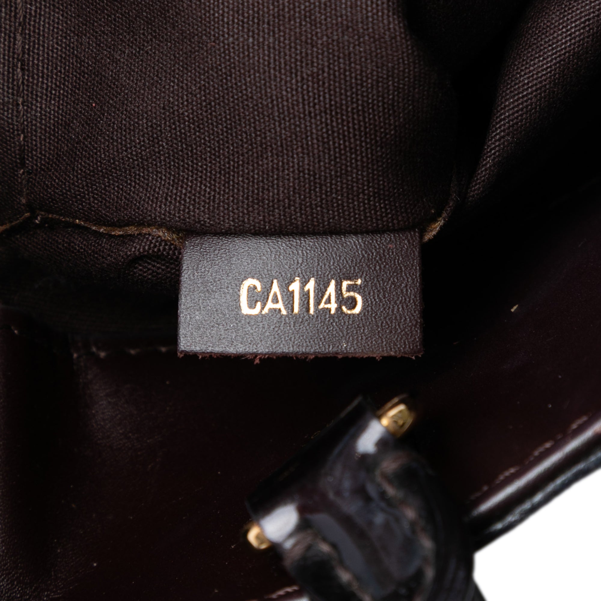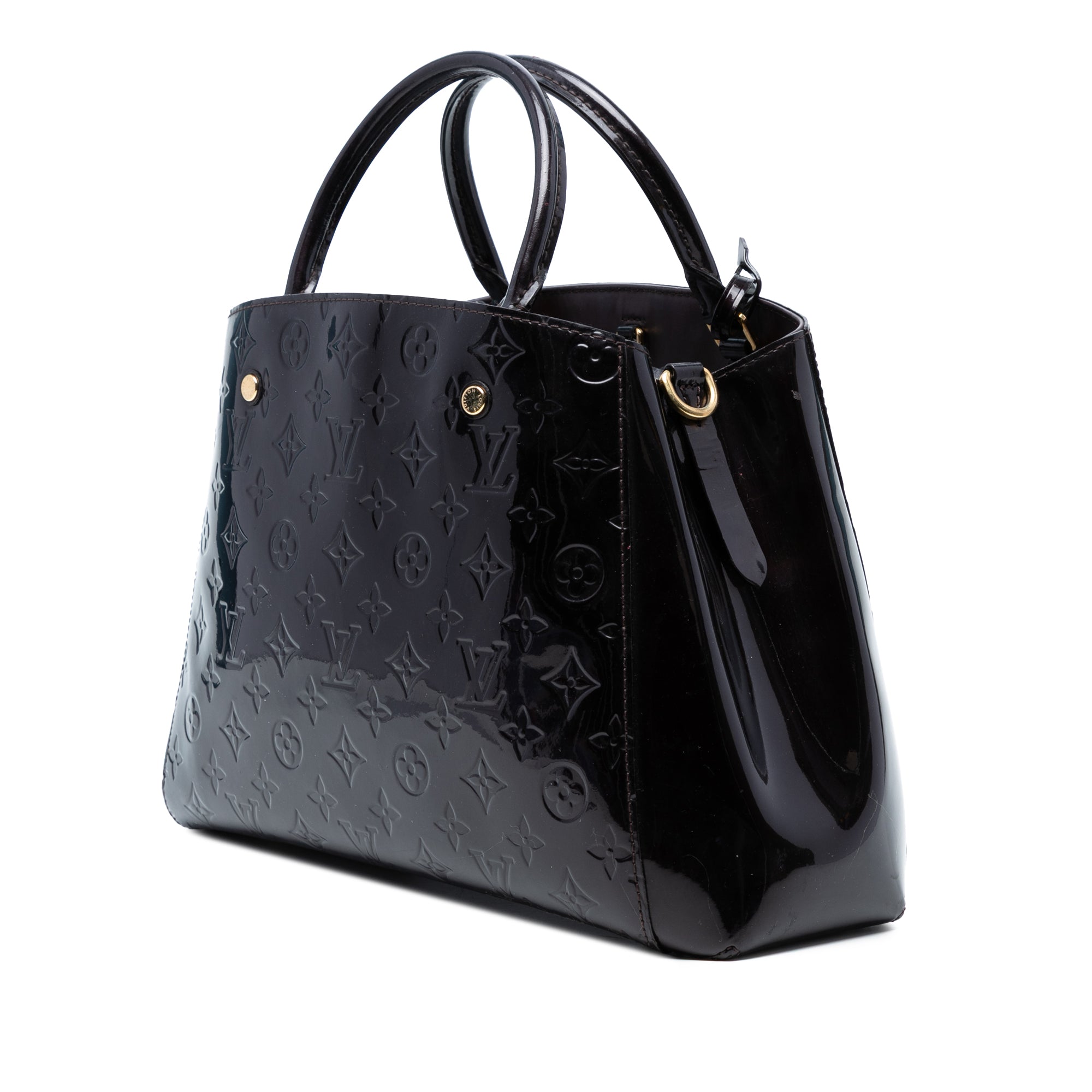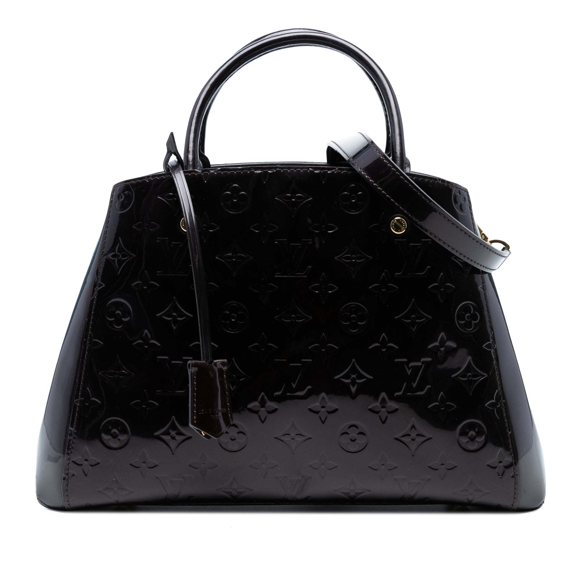 The Montaigne MM features a monogram vernis leather body, rolled handles, a detachable flat leather strap, an open top with a clasp closure, an interior zip compartment, and interior slip pockets. Retail Price: 2870.00