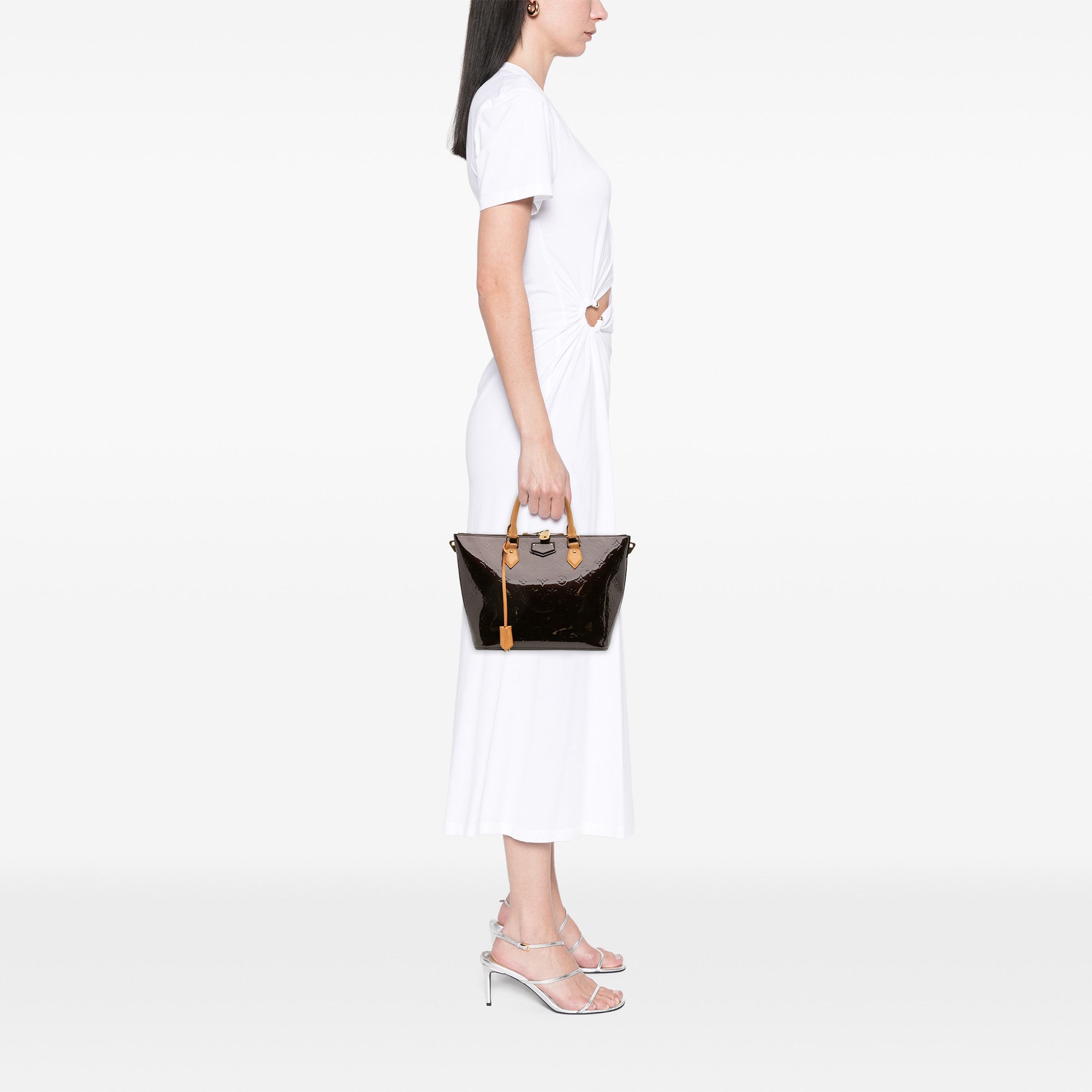 The Montebello MM features a vernis leather body, rolled vachetta leather handles, a top zip closure, and interior slip pockets. Retail Price: 2350.00