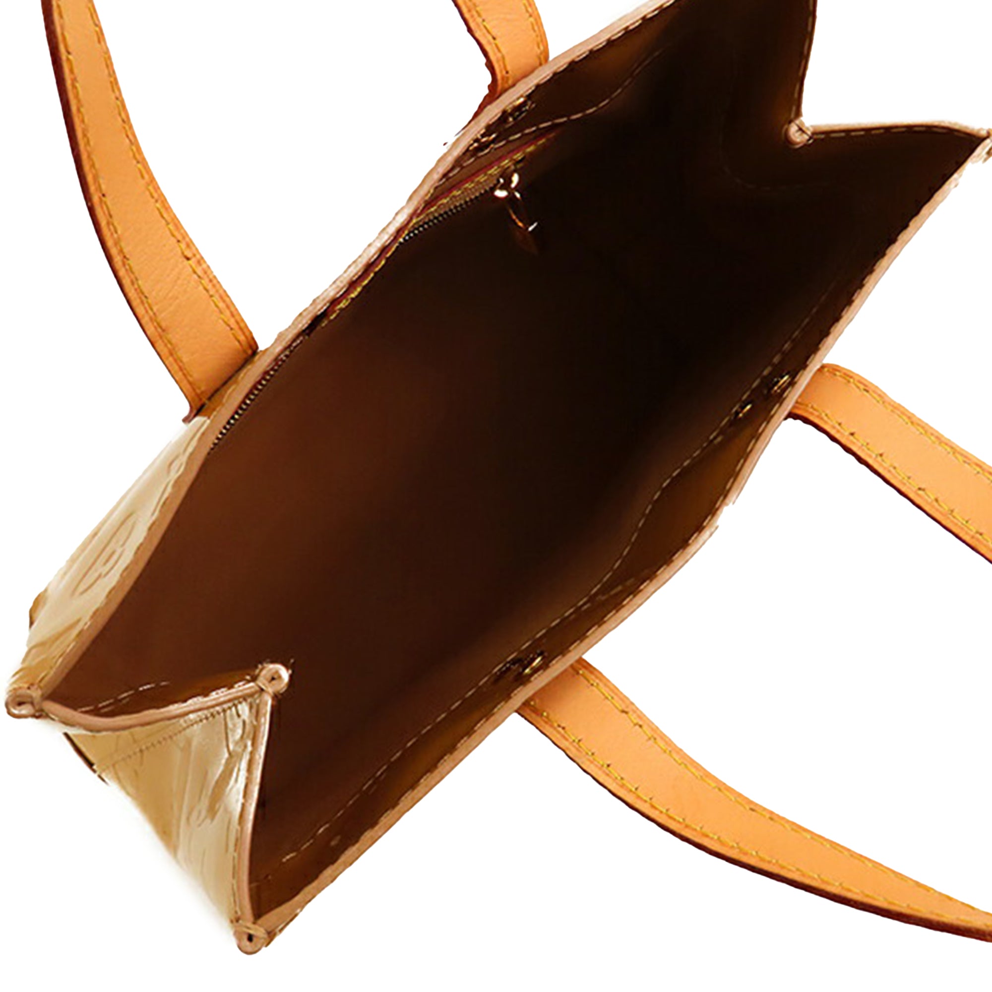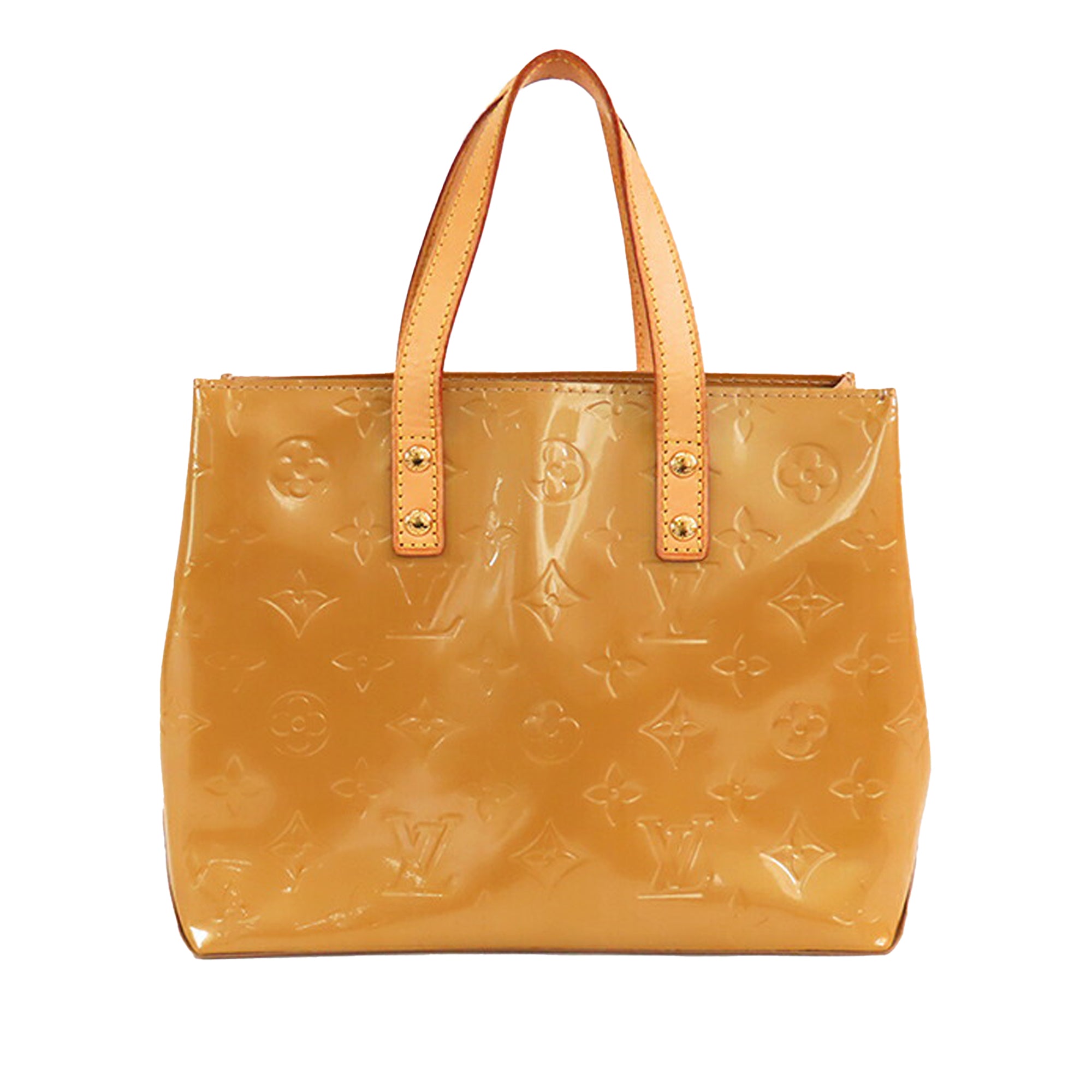 The Reade PM features a monogram vernis leather body, flat vachetta leather handles, an open top, and an interior zip pocket. Retail Price: 750.00